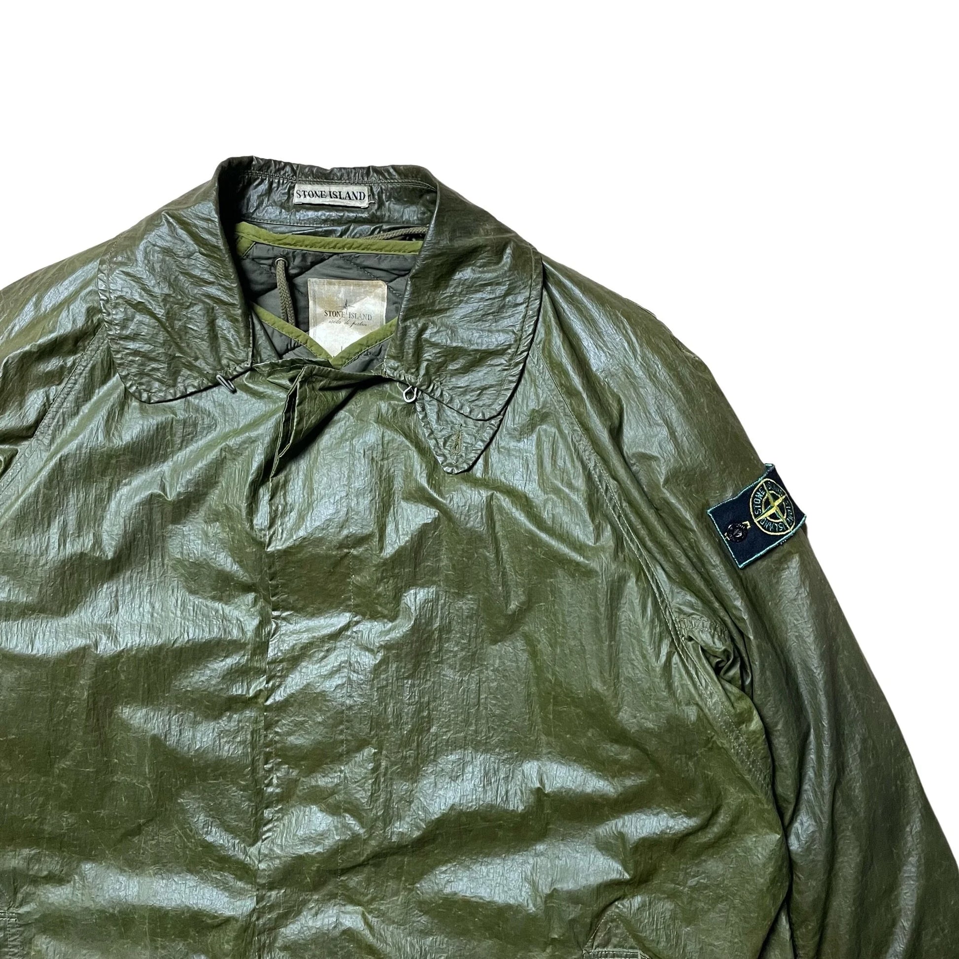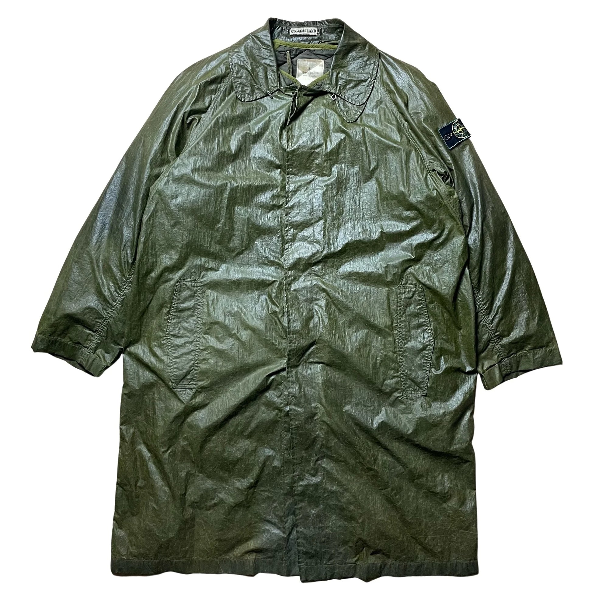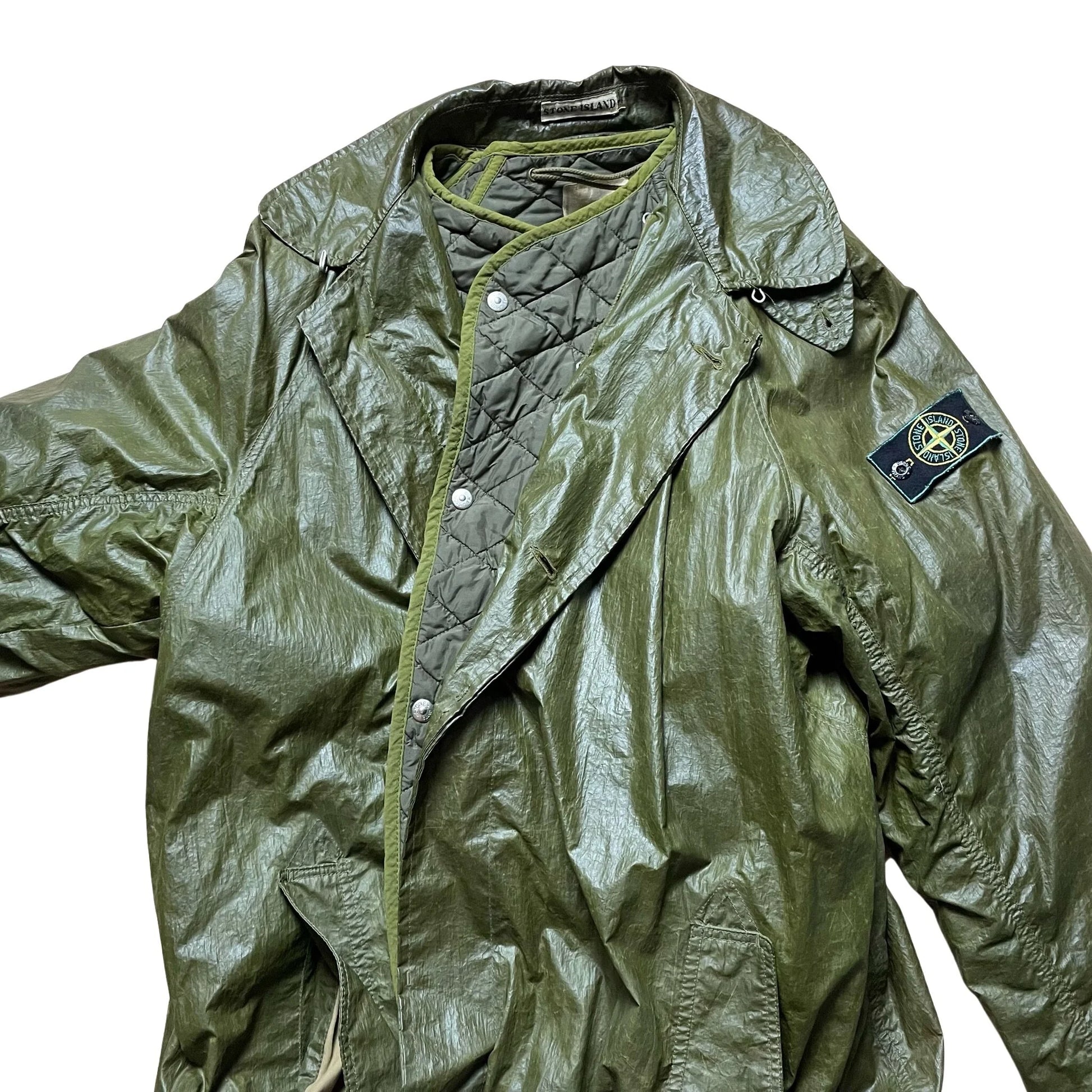Designed by Massimo Osti. Comprised of the innovative ice material in a Crocodile green colour way and a diamond quilted silk lining. Trench style jacket with a large adjustable spread collar complete with storm flap and a unique metal hook fastening. Engraved branded tin buttons throughout. Large diagonal patch pockets. Complete with the iconic shoulder patch.
