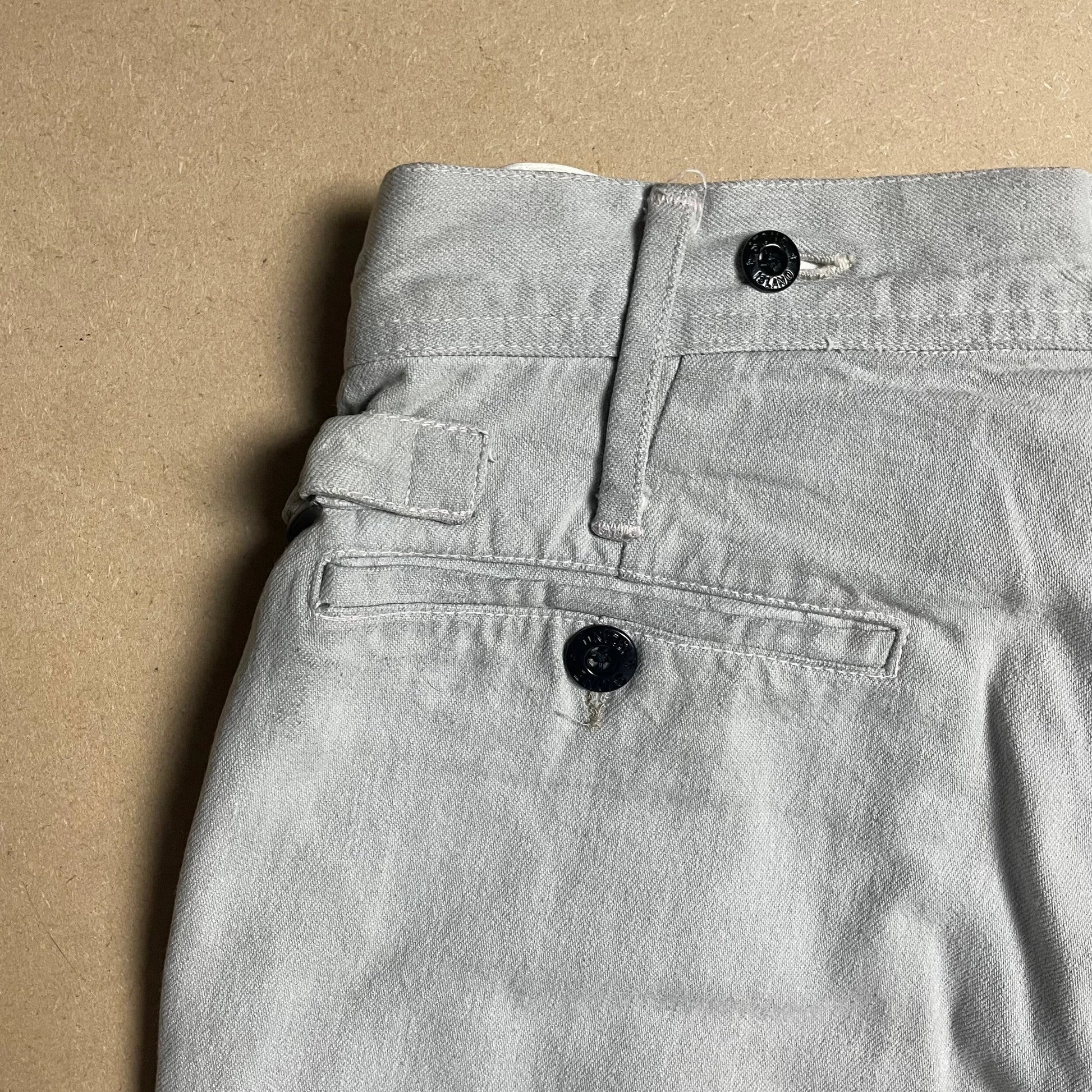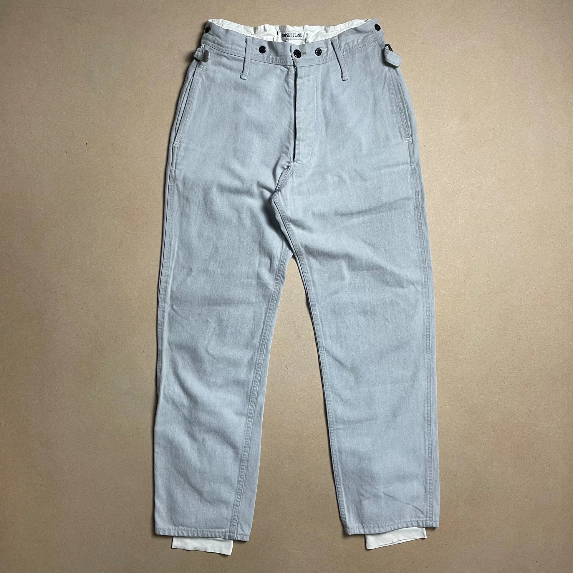 Designed by Massimo Osti. Inspired by early Confederate uniforms of the American Civil War. Cotton based denim pants with fully removable thermal lining produced in acetate. Connected with embossed buttons along waistline. Slip clasp fastening and 4 pocket function.