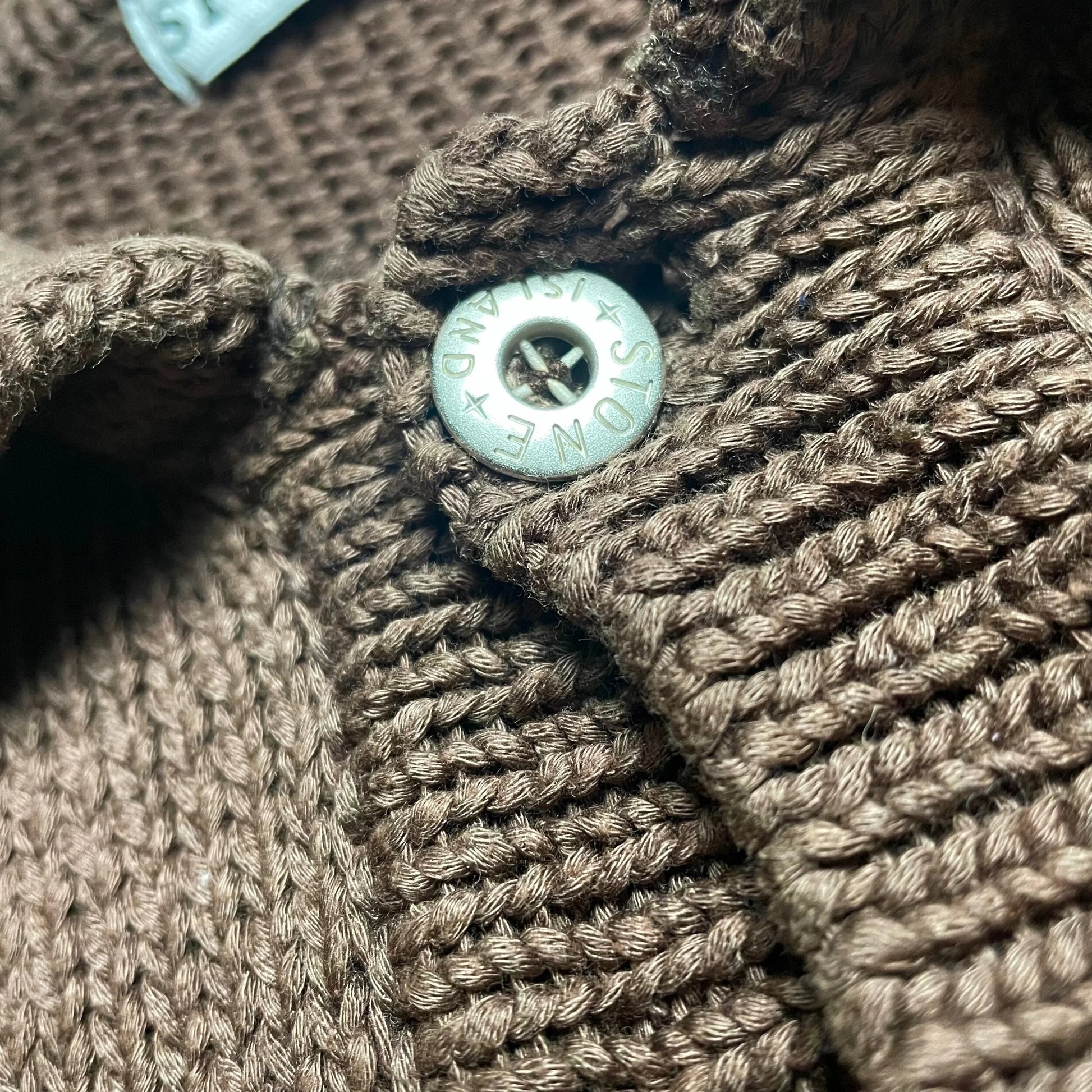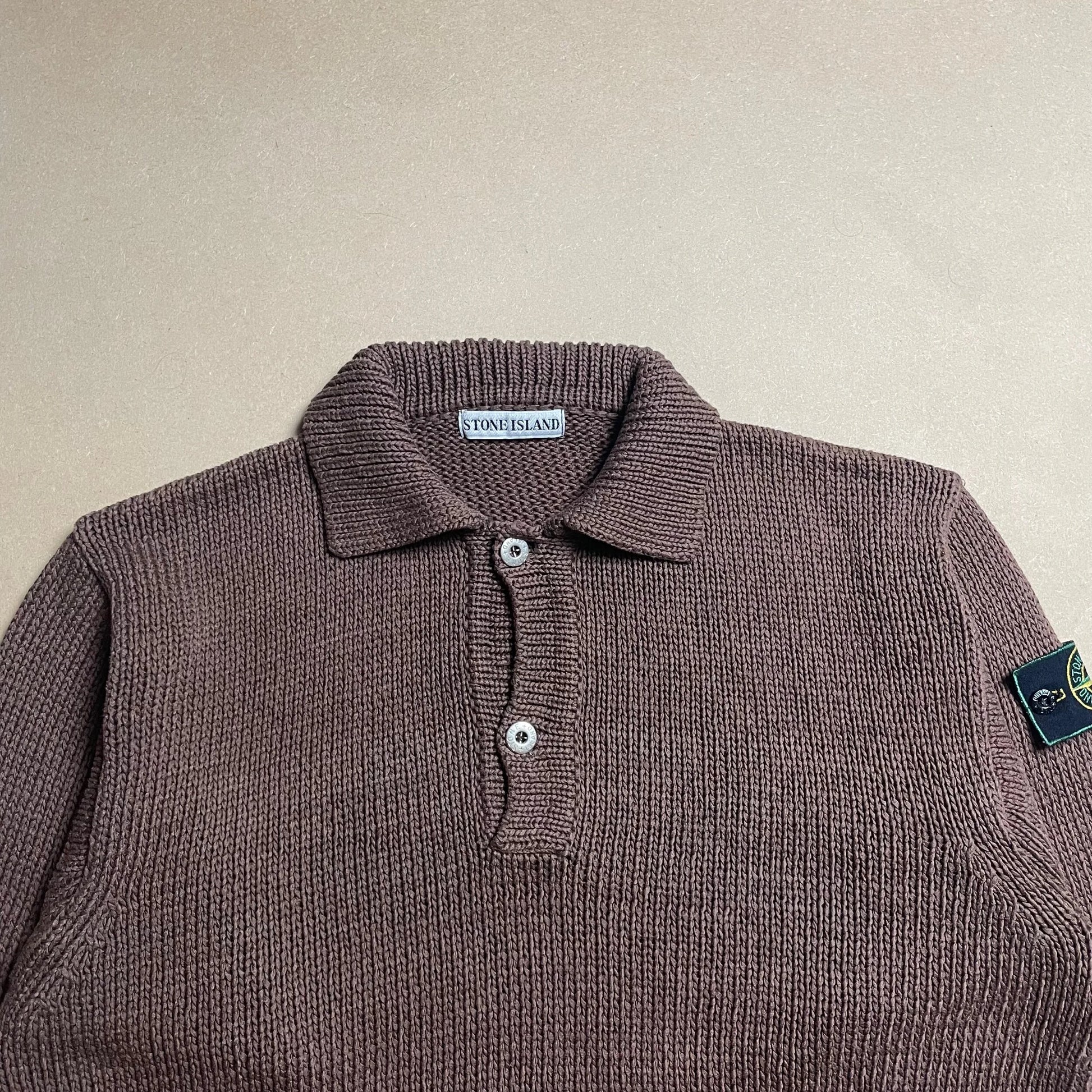 Designed by Massimo Osti. Heavy cotton wool cable knit with a medium spread collar. Two button 1/4 neck opening. Engraved metal buttons. Green edge badge to finish.
