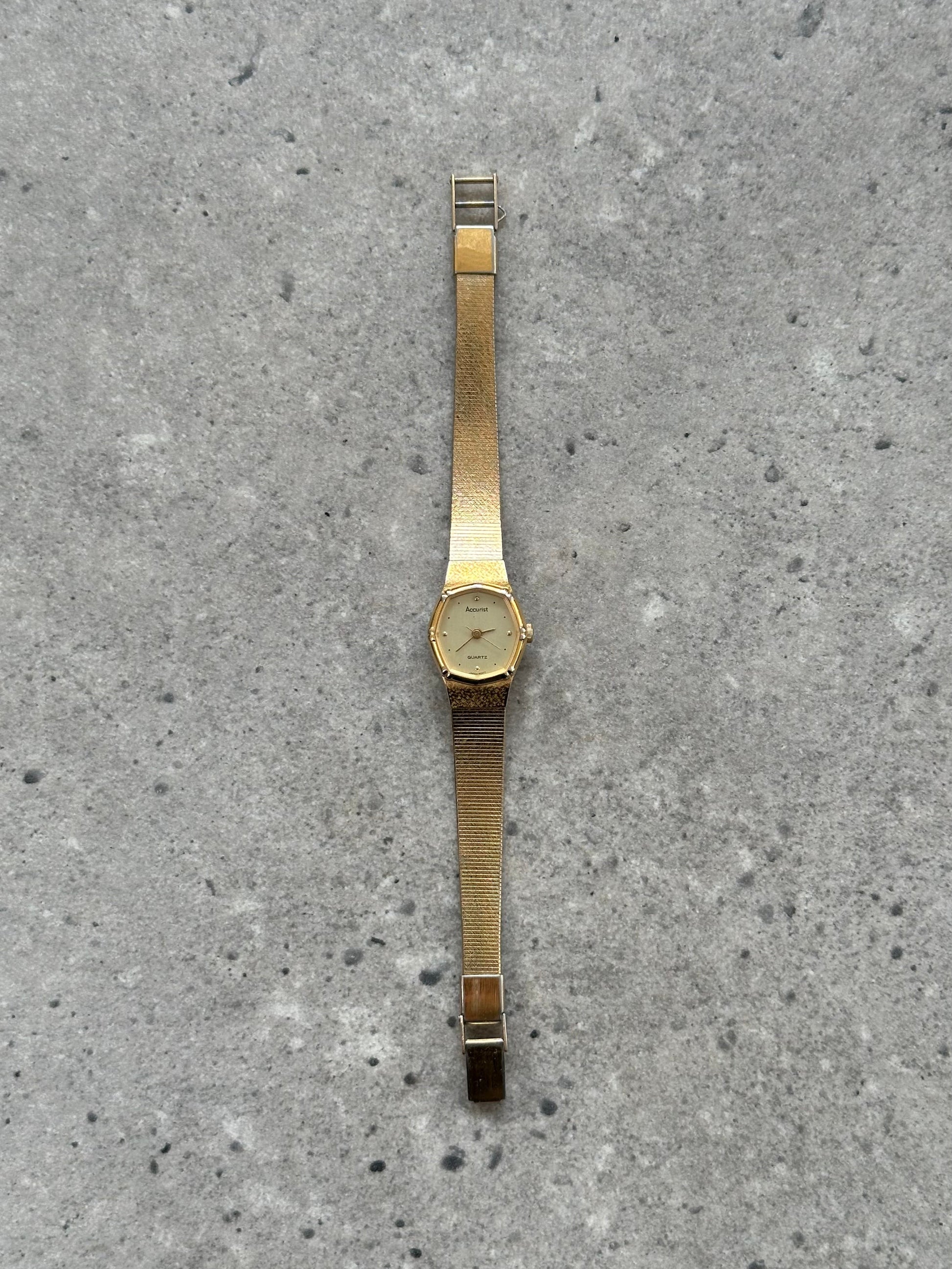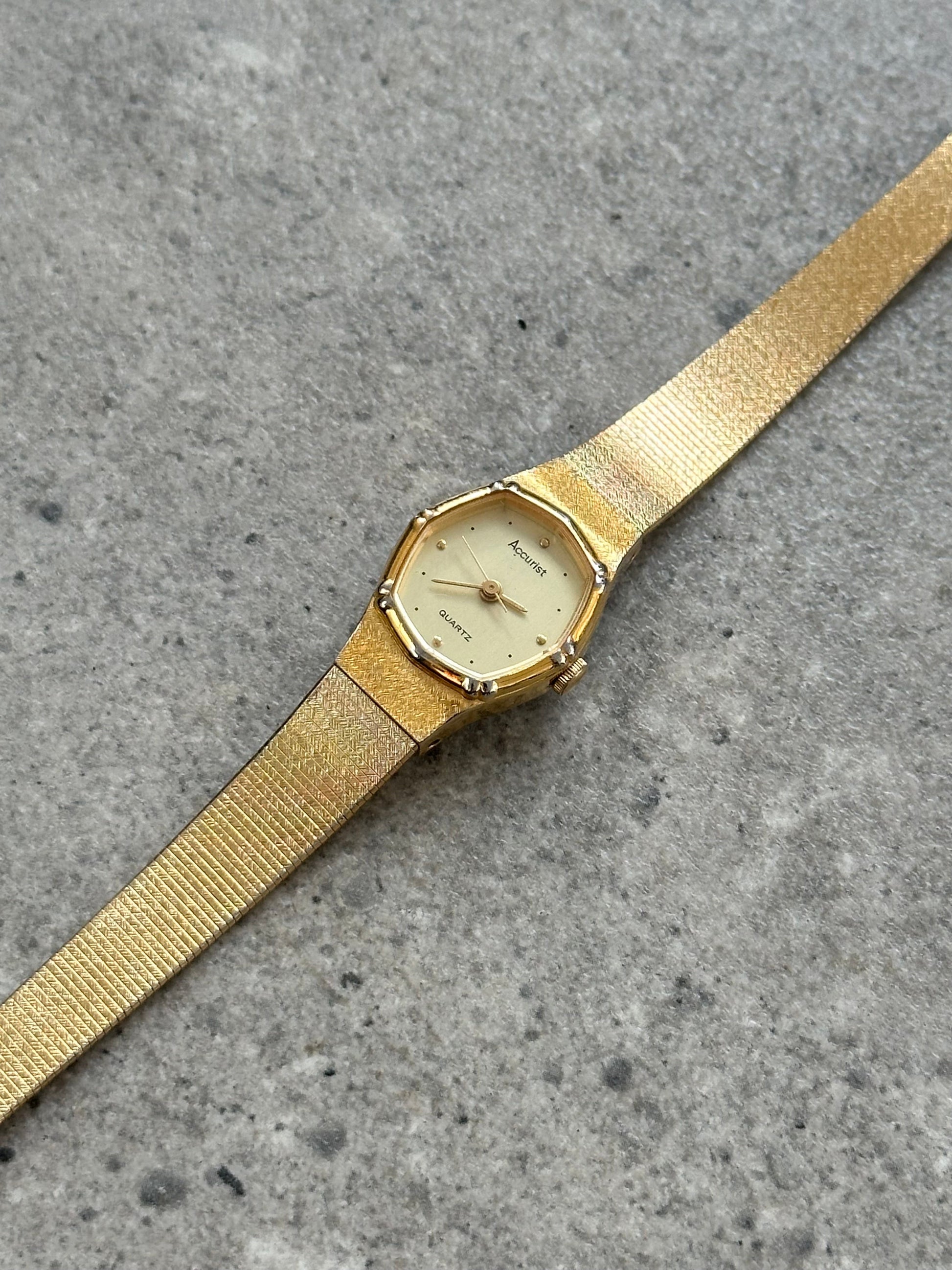 Vintage Accurist wristwatch featuring a gold tone octagonal case and textured integrated bracelet. The champagne dial is finished with minimalist dot hour markers and slim hands, reflecting the refined jewellery watch styling popular in the late 1980s and 1990s.