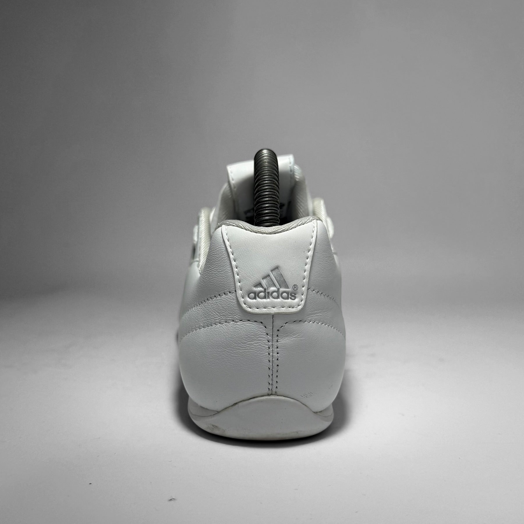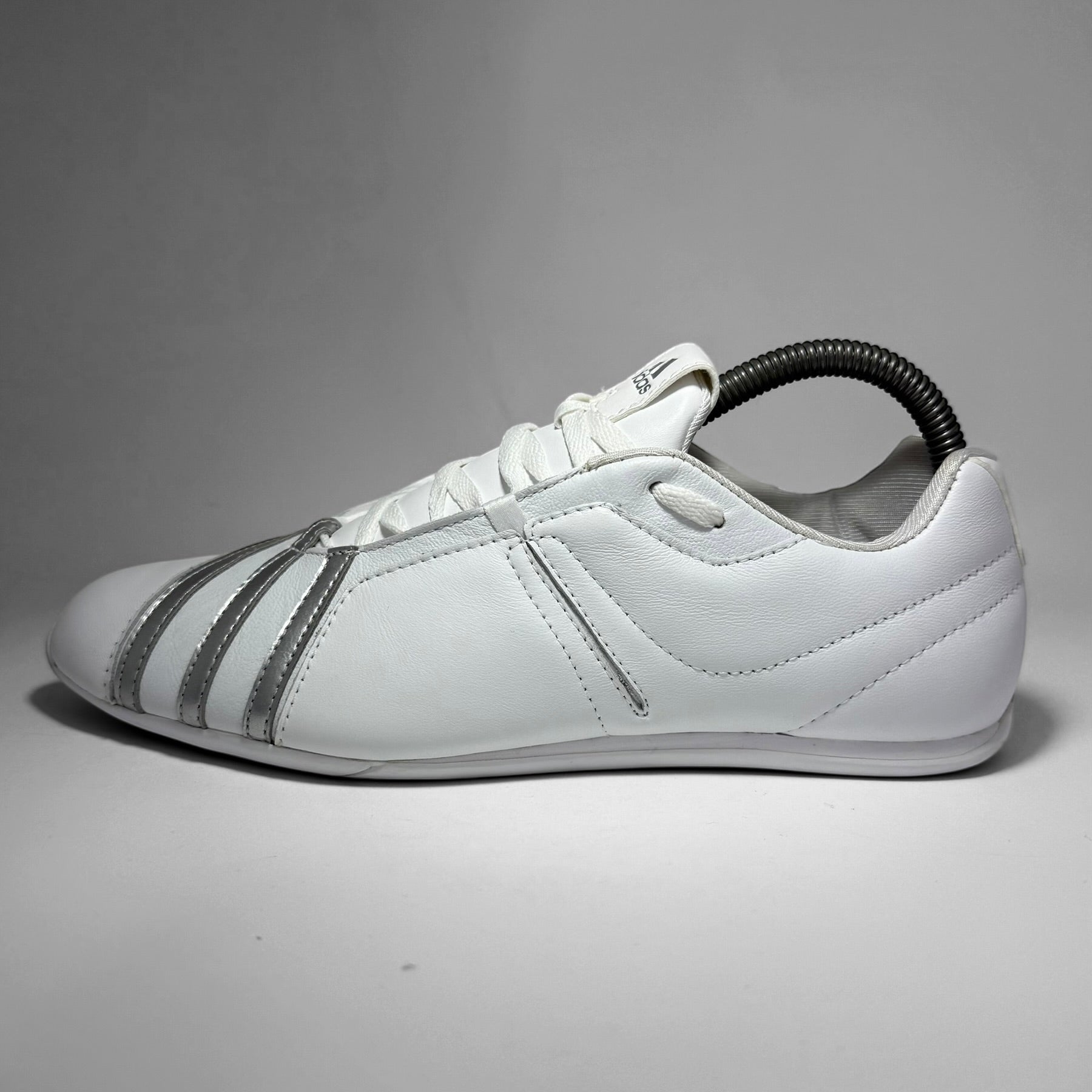 Double stacked smooth white leather uppers with striking silver three-striped panels running diagonally along the top.