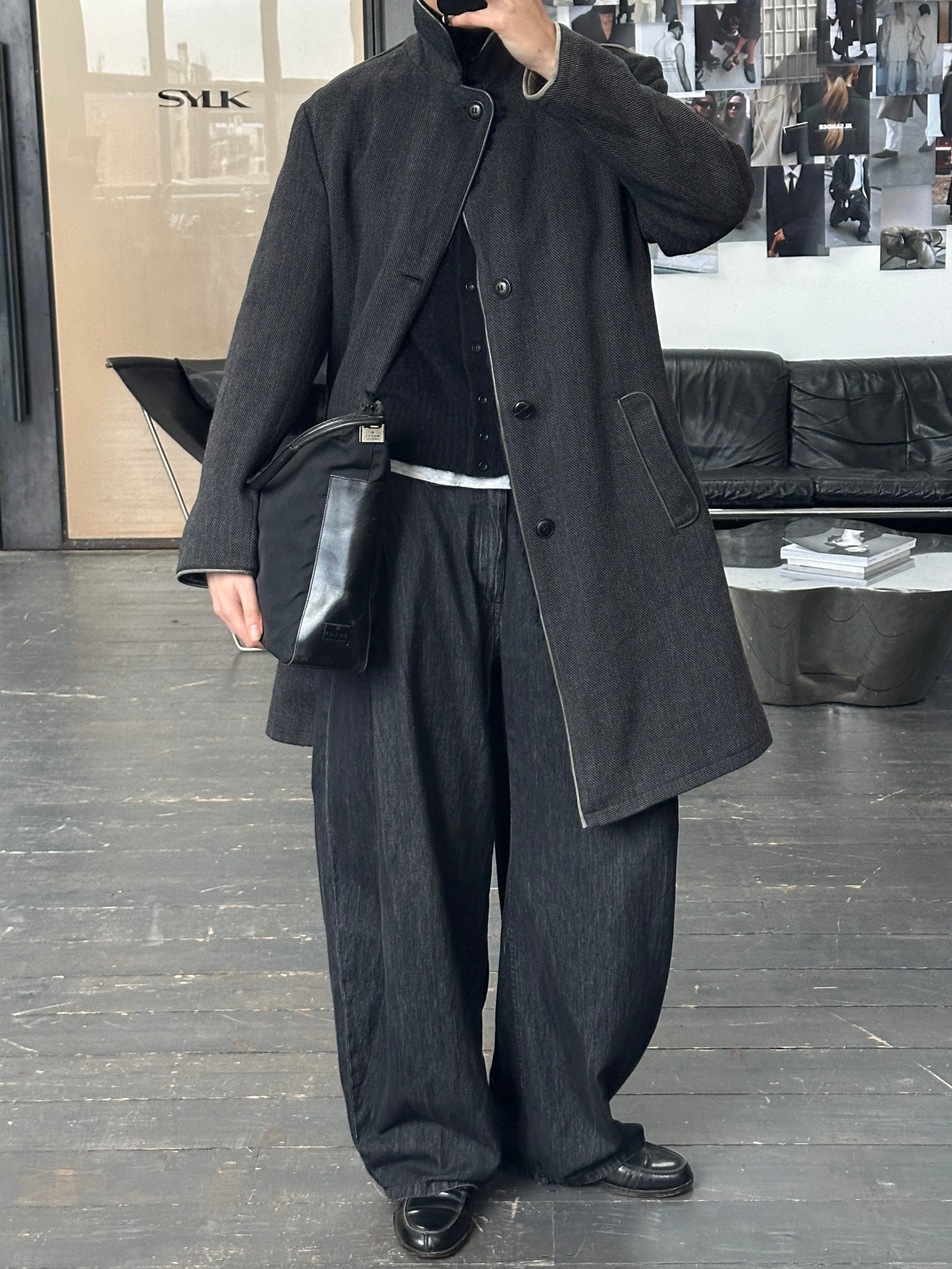 Armani Collezioni 2000s coat crafted in a grey wool blend, finished with a plush fur collar and subtle leather piping that elevates the silhouette.