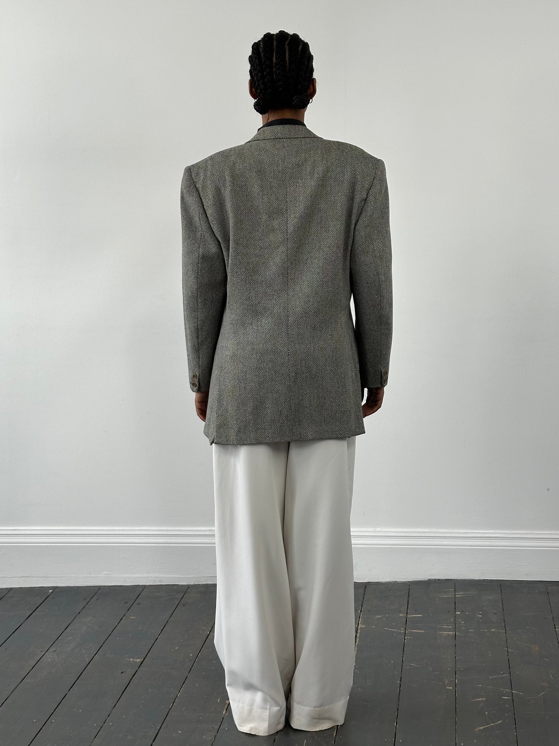 A 1990s vintage Burberry single breasted blazer in grey herringbone wool with a softly structured silhouette and classic tailoring. Finished with a two button front and clean lines, the interior features the historic Burberrys of London label, placing it firmly in the pre rebrand era.