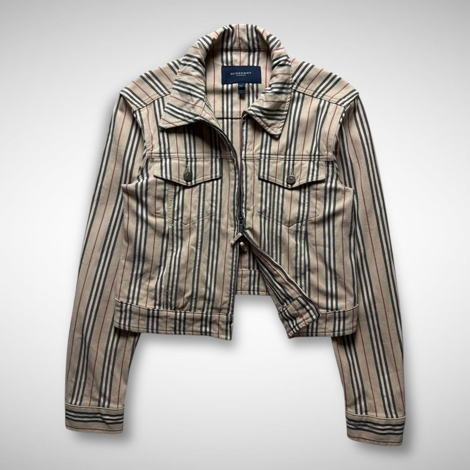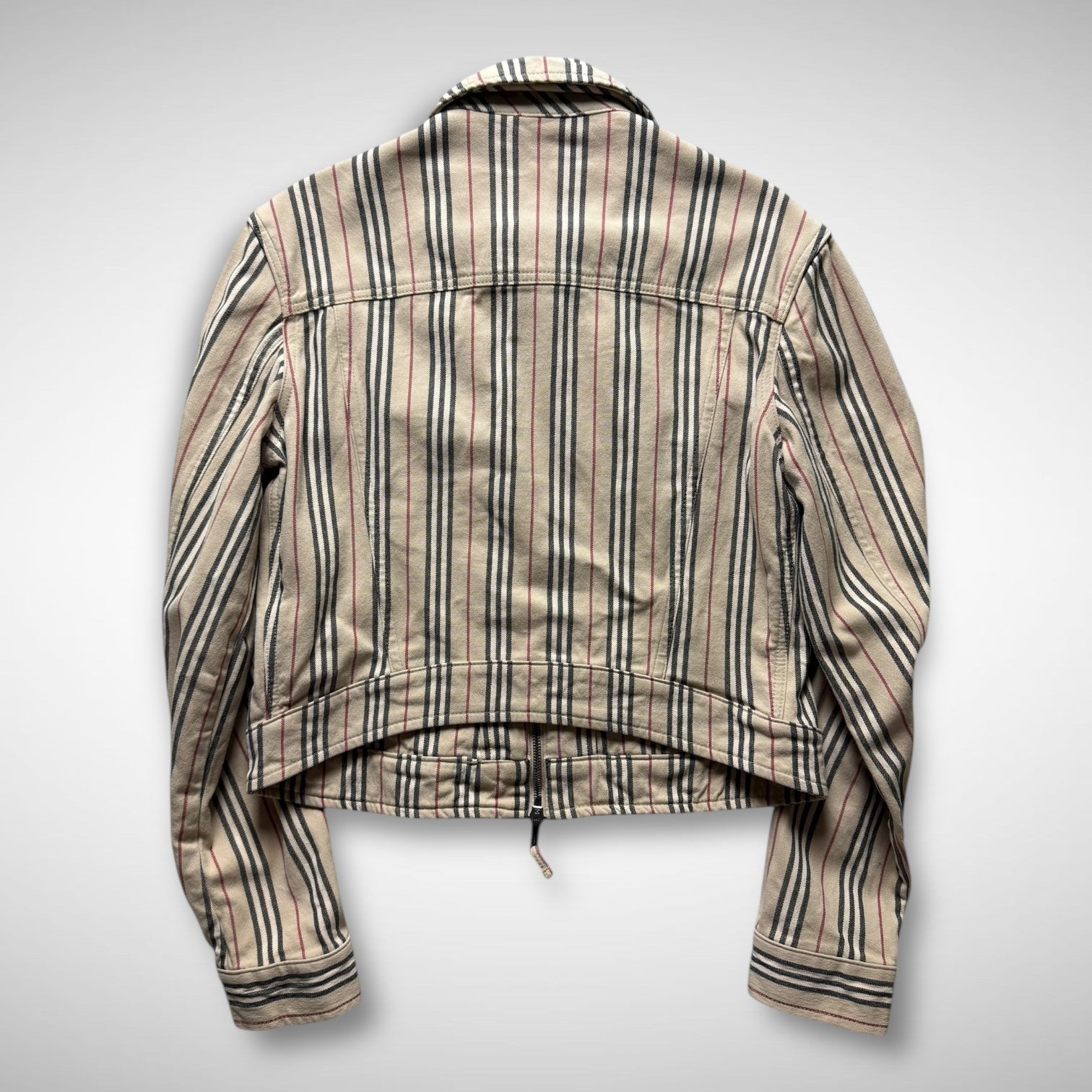 A cropped Burberry jacket in heavy cotton with a zip front and buttoned chest pockets. It features Burberry’s Icon Stripe pattern, executed here in vertical black, cream, and red stripes.