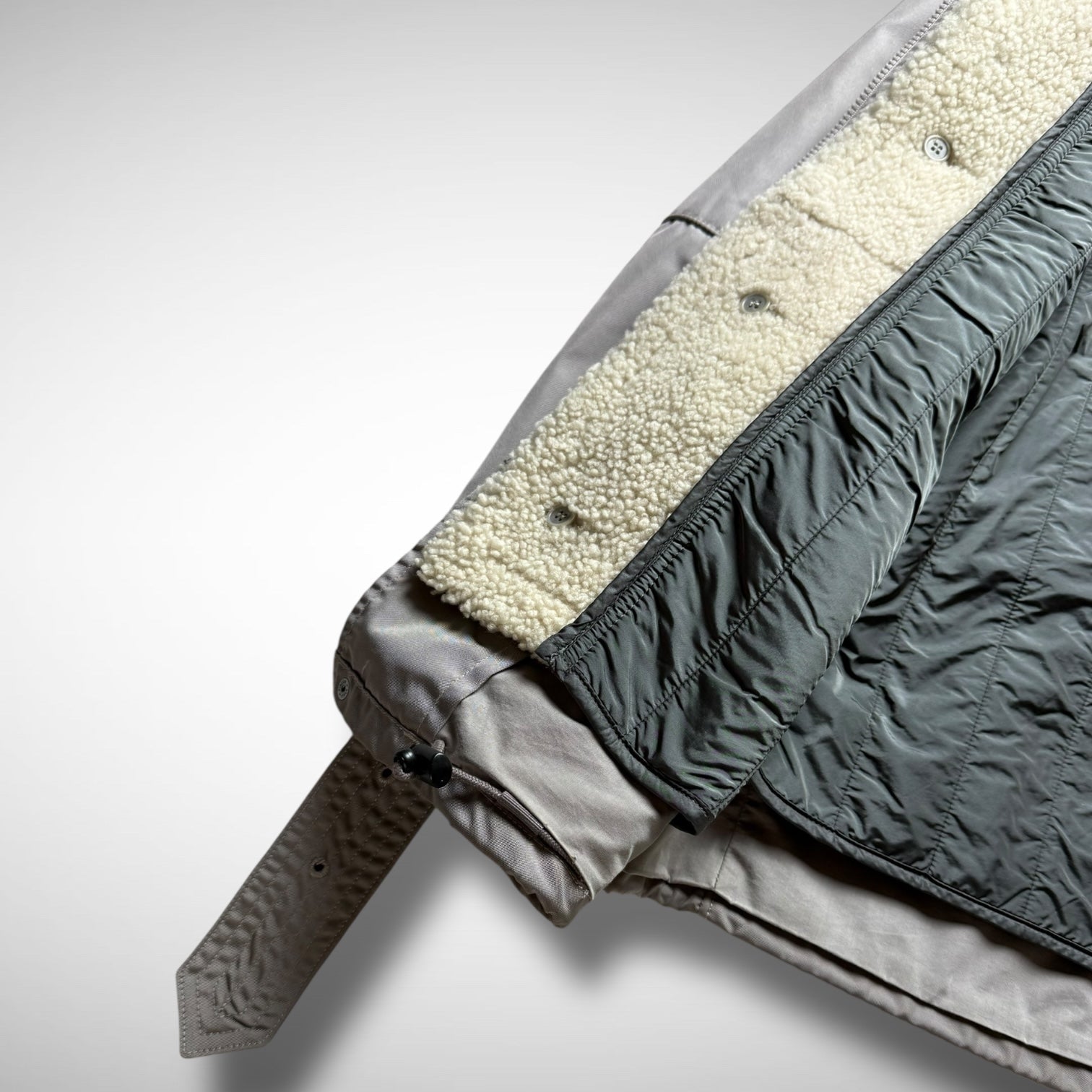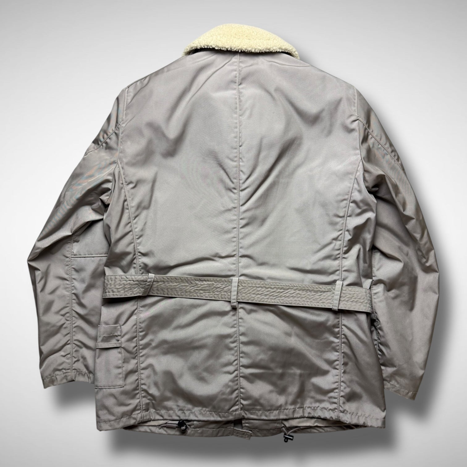 Crafted from durable Dynafil fabric, this jacket features a removable liner made of padded nylon for insulation and a shearling collar and panel along the centre for added warmth and comfort. Designed with multiple utility pockets, branded buttons, hand-warmer pockets, a removable waist-belt and adjustable collar with hook to stand-up.
