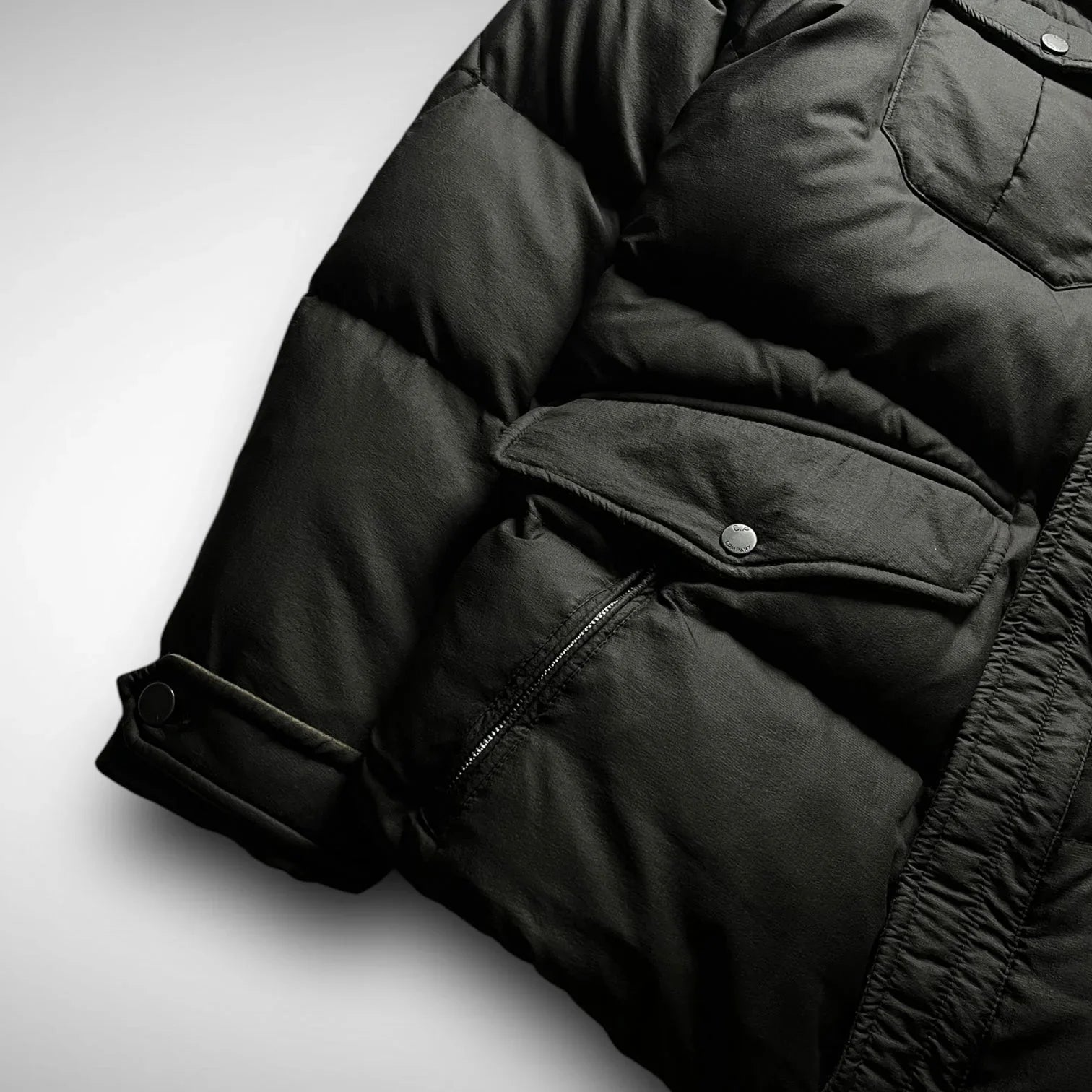 Down filled nylon hooded jacket featuring a shimmer ranging from brown to black and a slight green hue (colour best seen in fourth image), fleece lining and rope & button adjustable hood, six front compartments both zip and button-pocket closure, double stash pockets, adjustable cuffs, and reinforced panels made from ballistic nylon along the side skirts and hood.