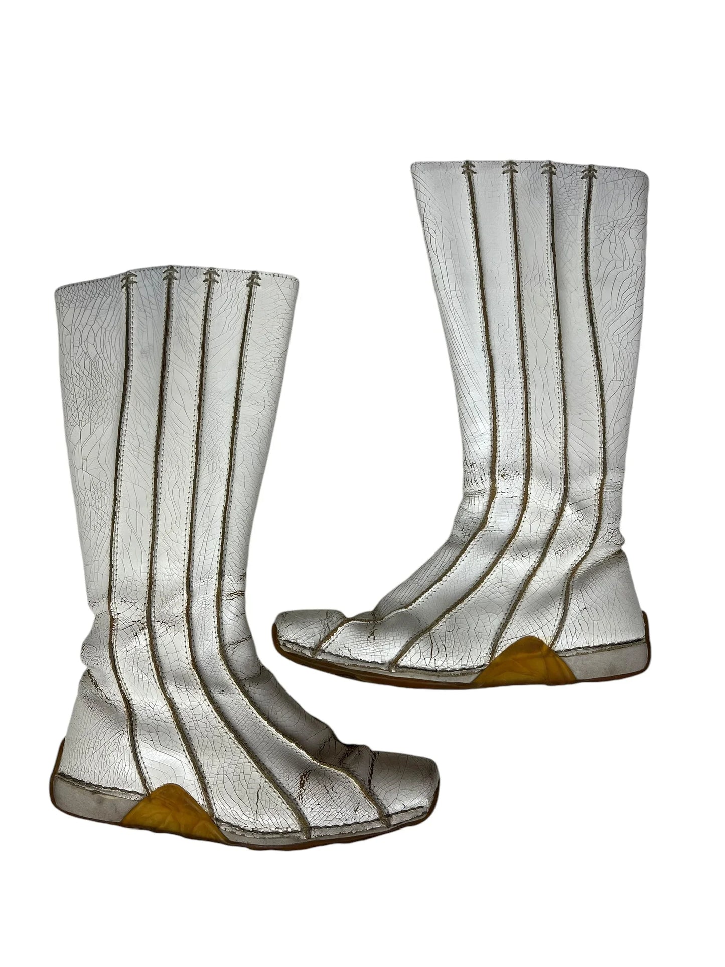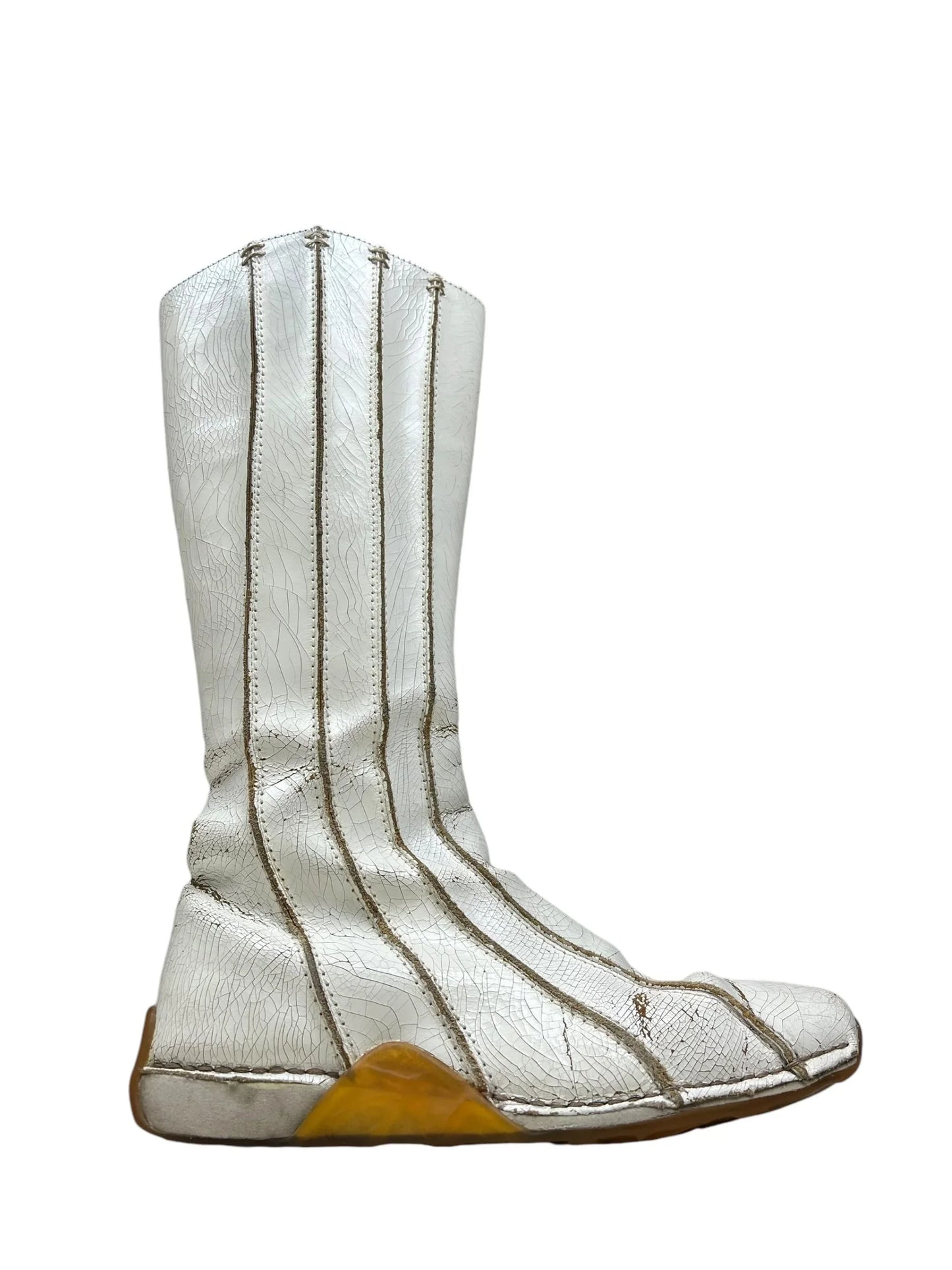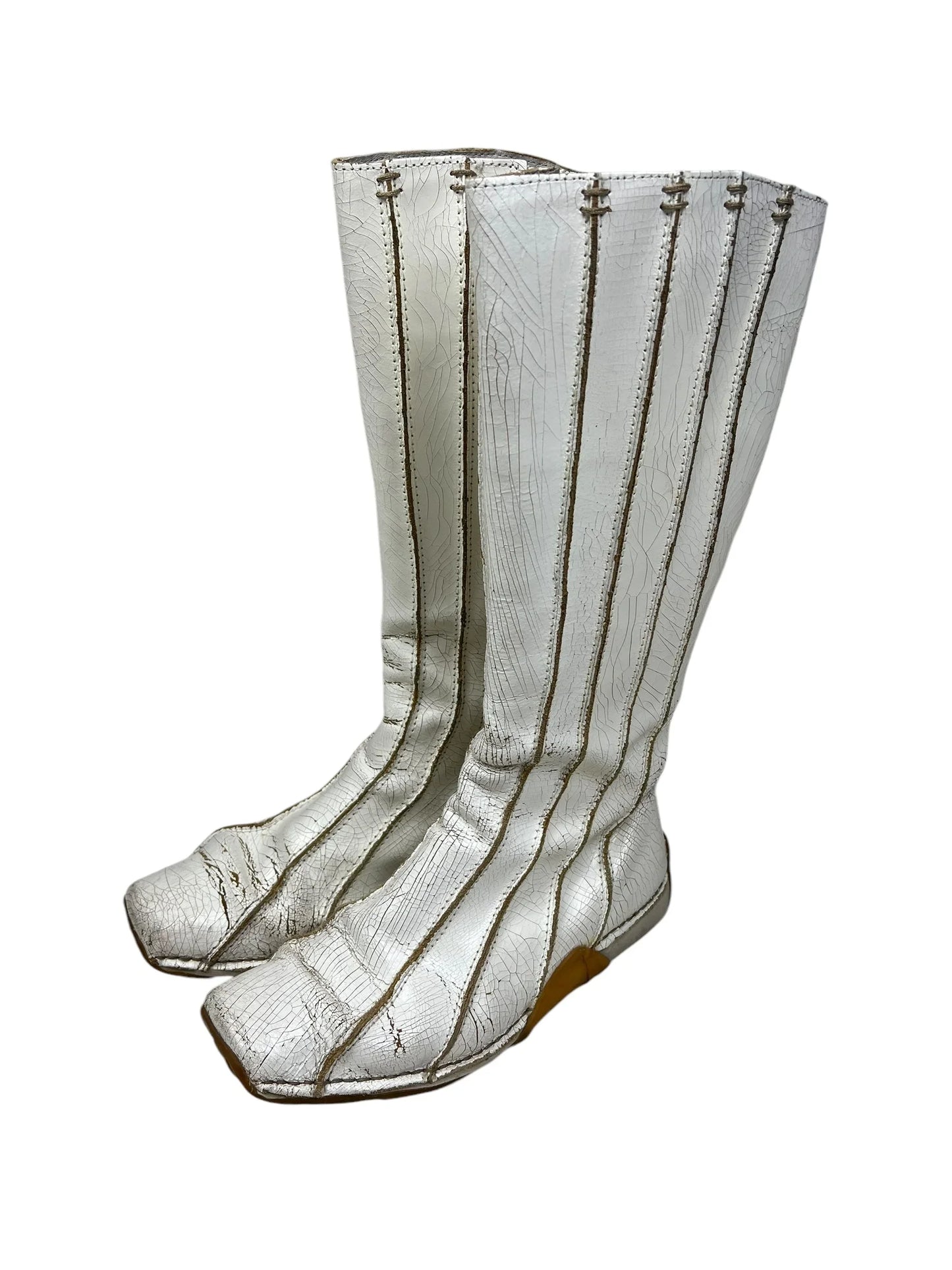 🐥 Condition is very good - light general wear but no major outer signs of wear. Inside ankles have worn through a little but still comfy. Bottom soles lightly worn. Original box included. Please be aware that the paint will crack and peel more with time and wear - an intensional outcome of the design, adding to the dystopian worn out look intended when originally made. 100% leather upper with paint on top. Rubber soles.