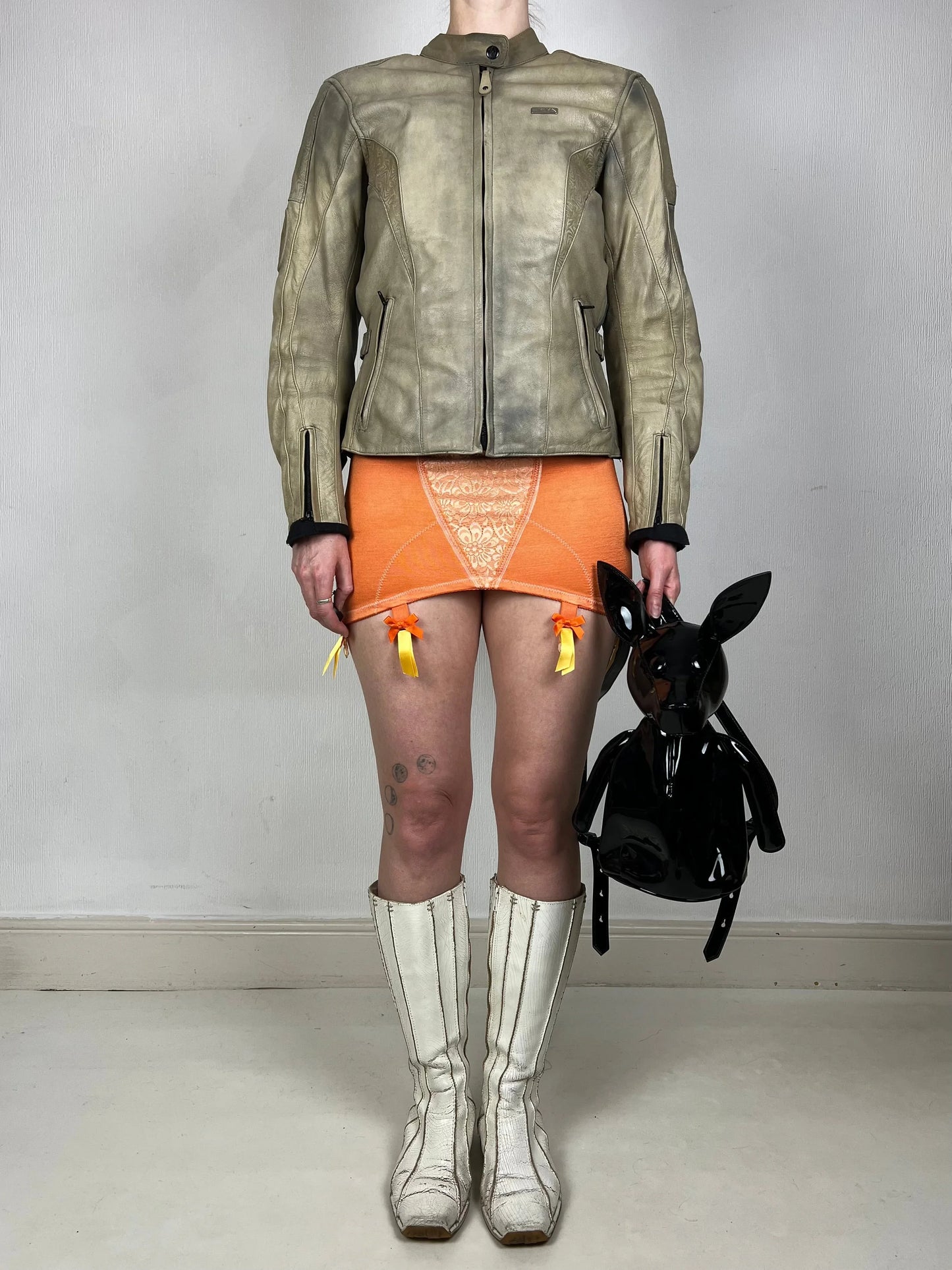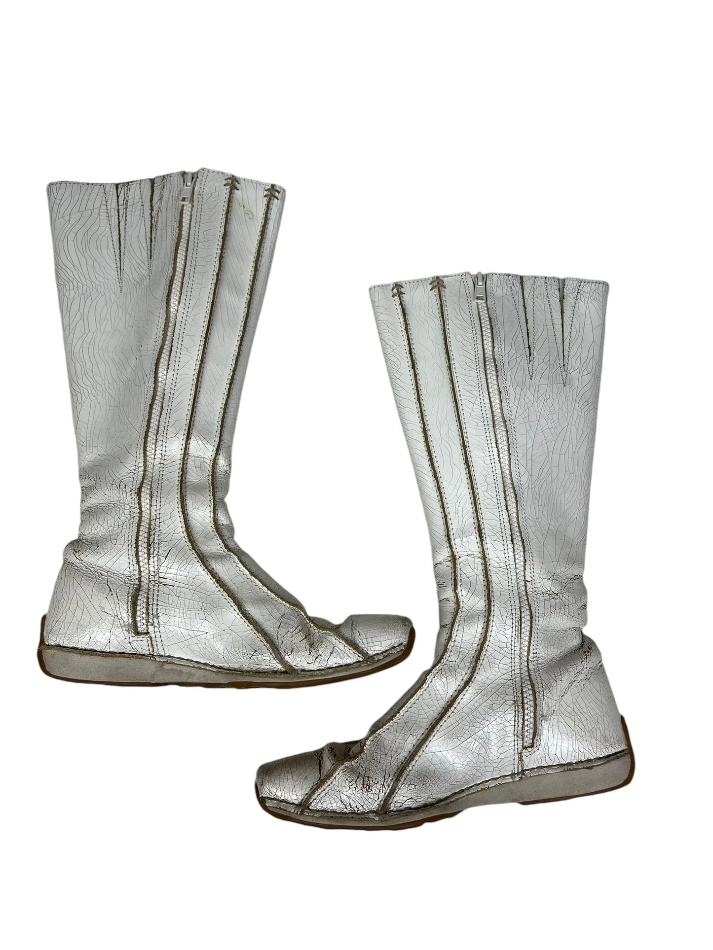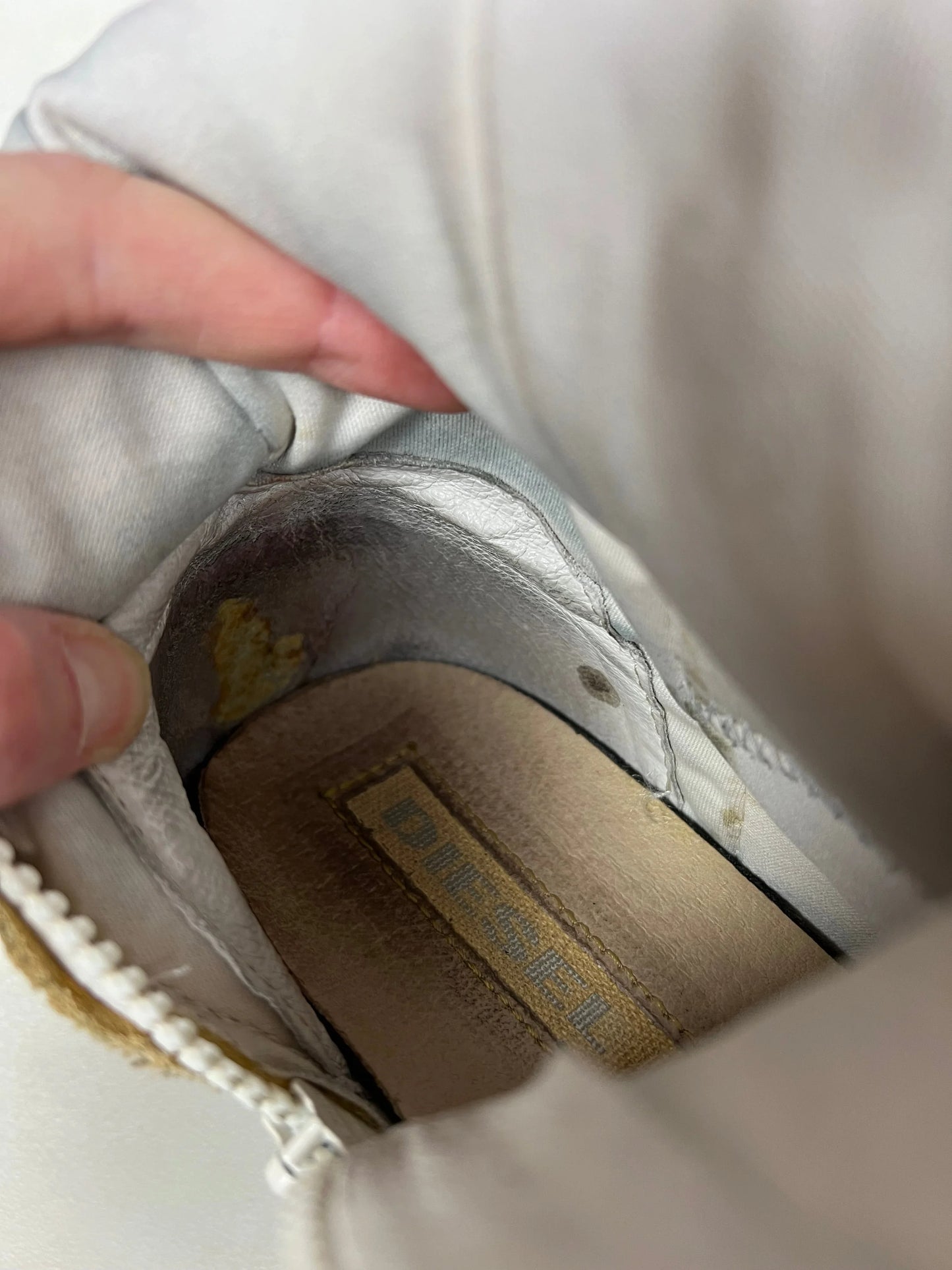 🐥 Condition is very good - light general wear but no major outer signs of wear. Inside ankles have worn through a little but still comfy. Bottom soles lightly worn. Original box included. Please be aware that the paint will crack and peel more with time and wear - an intensional outcome of the design, adding to the dystopian worn out look intended when originally made. 100% leather upper with paint on top. Rubber soles.