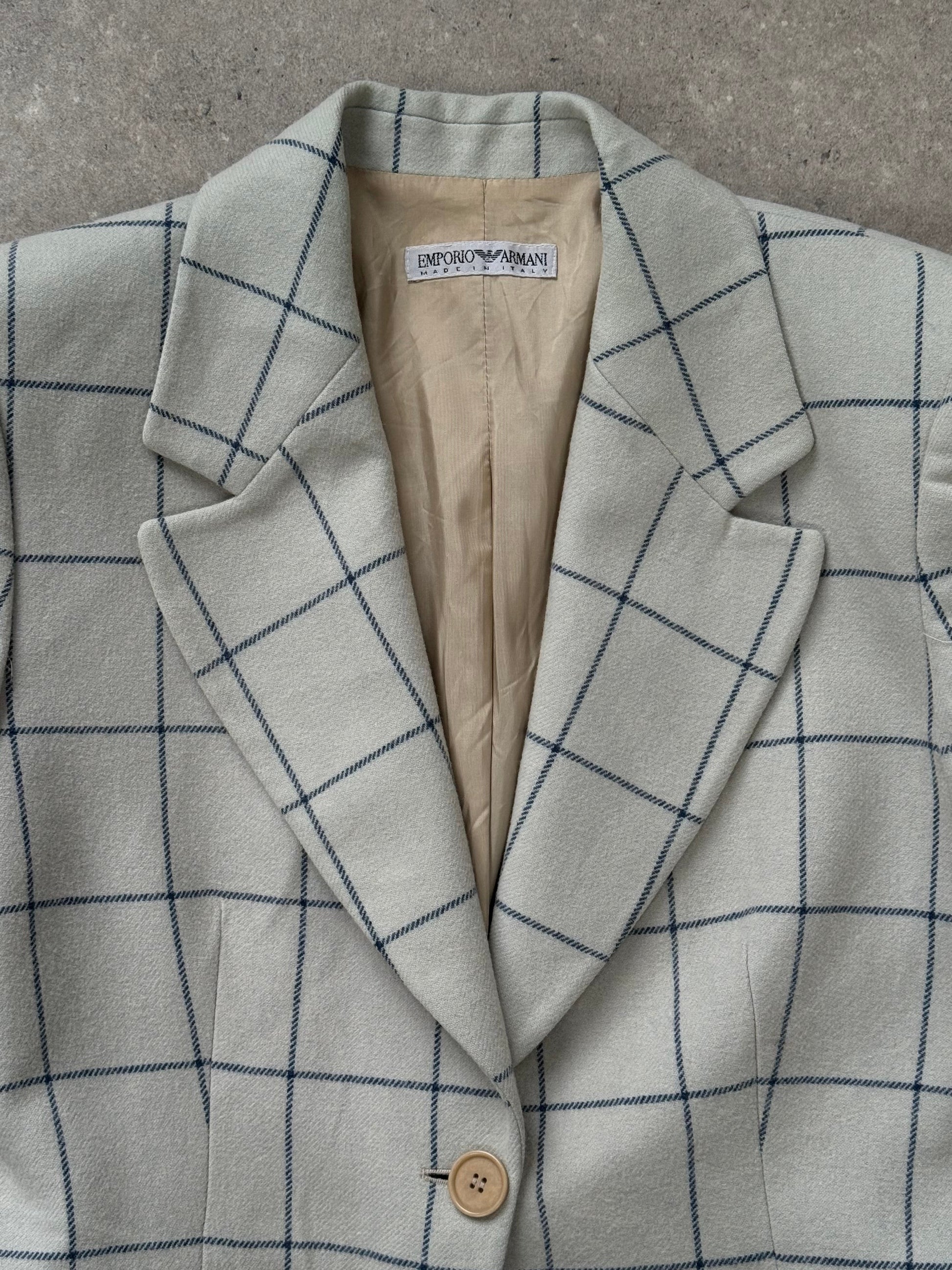 Emporio Armani soft green blazer with a subtle blue windowpane check and beige lining. Cut in a structured silhouette with defined shoulder pads, peak lapels and a single button front, offering a tailored 1990s fit with clean, architectural lines.