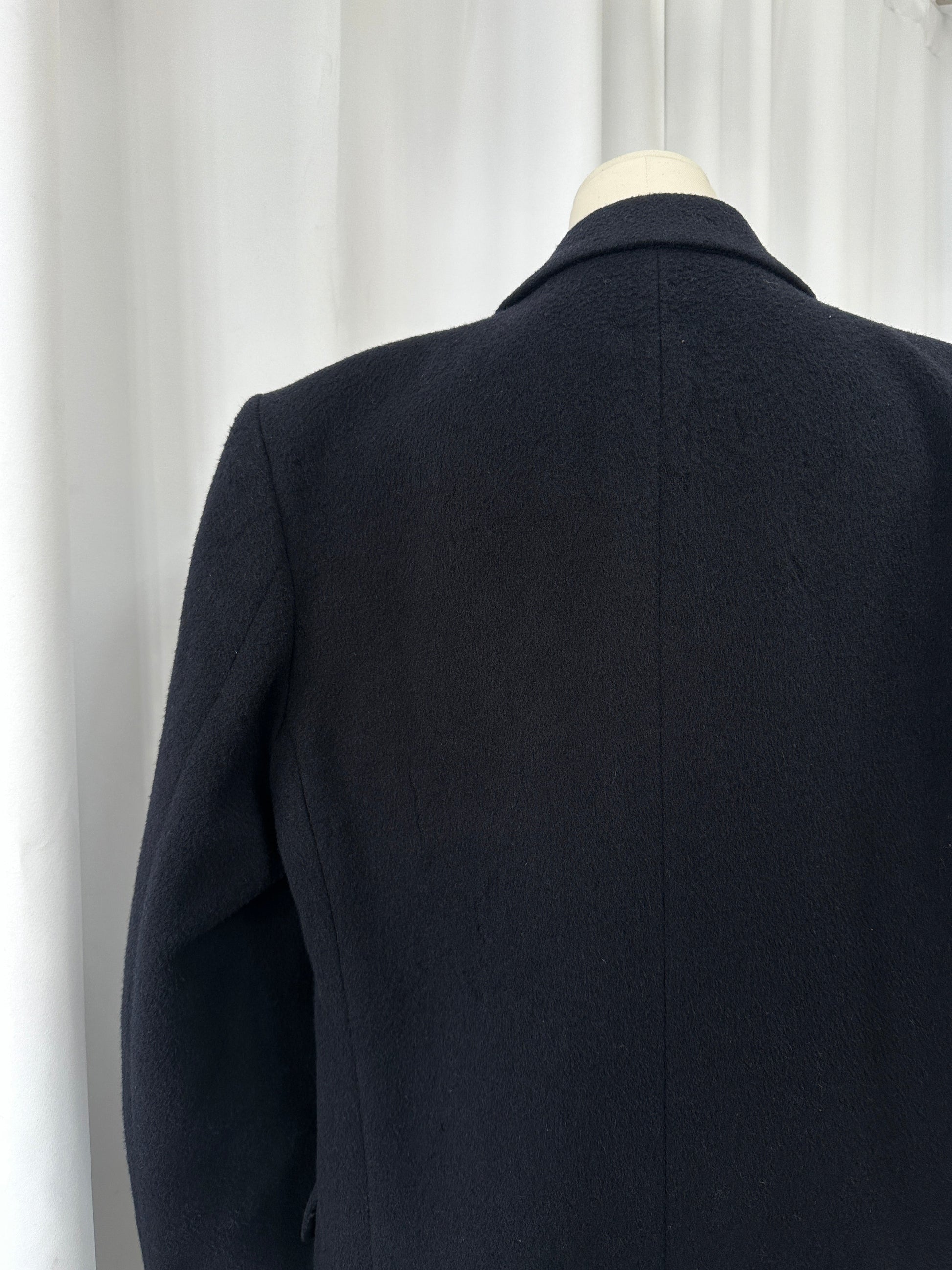 Vintage 1990s double breasted coat with wide lapels, expertly tailored in England from a luxurious wool cashmere blend.