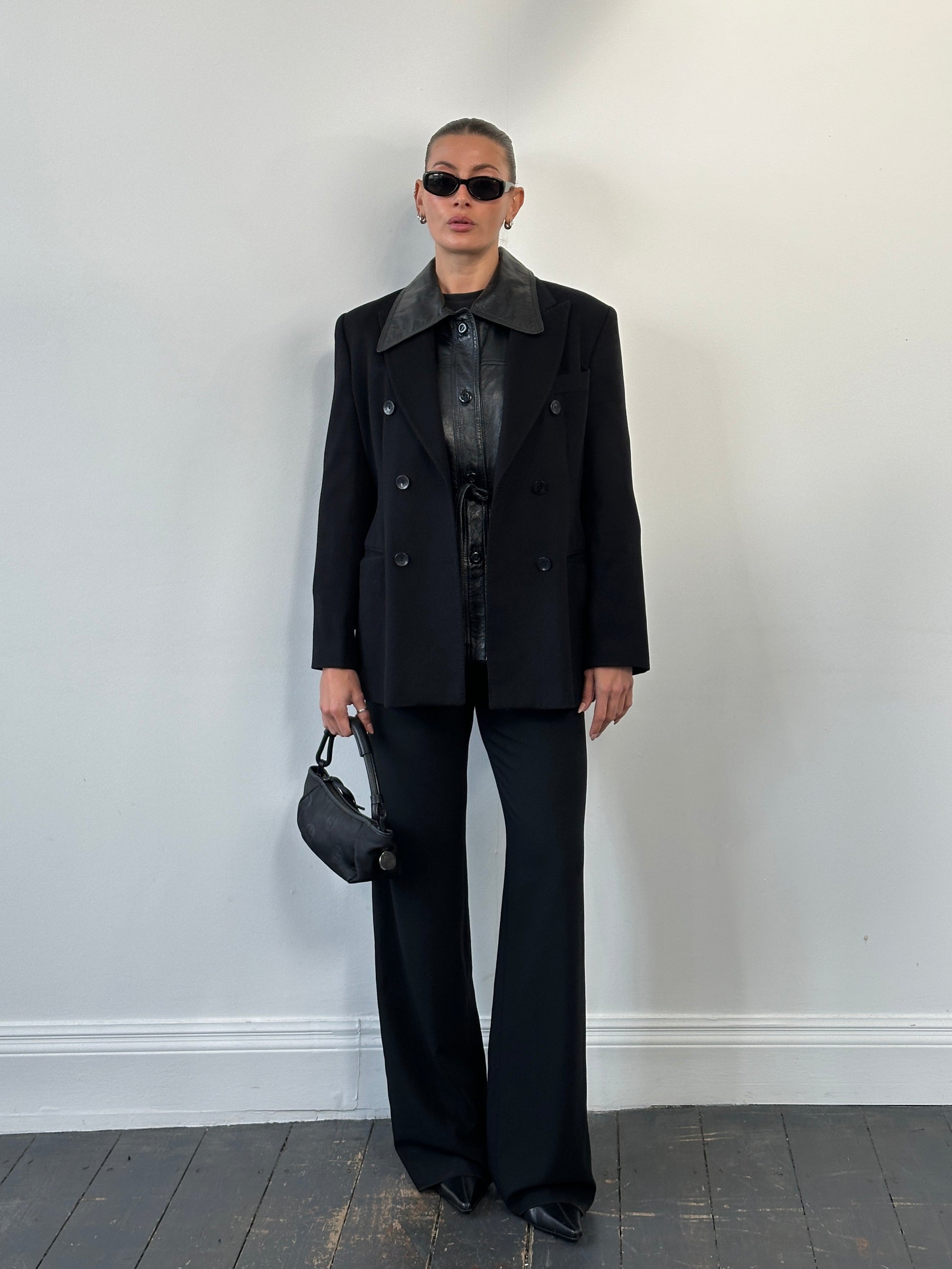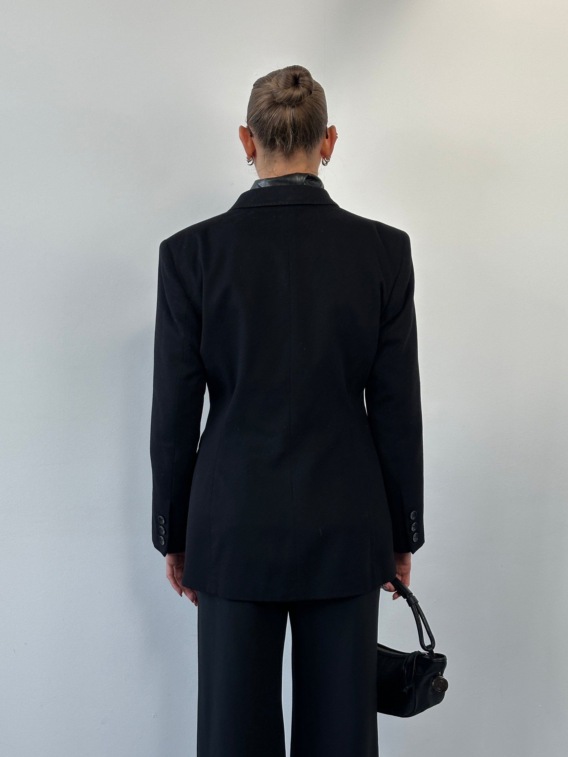 A sharply tailored Gianfranco Ferré Studio blazer crafted in Italy from a brushed wool and cashmere blend with a structured double breasted front. Finished with branded logo buttons and a clean architectural silhouette, this piece reflects Ferré’s refined 1990s tailoring language.