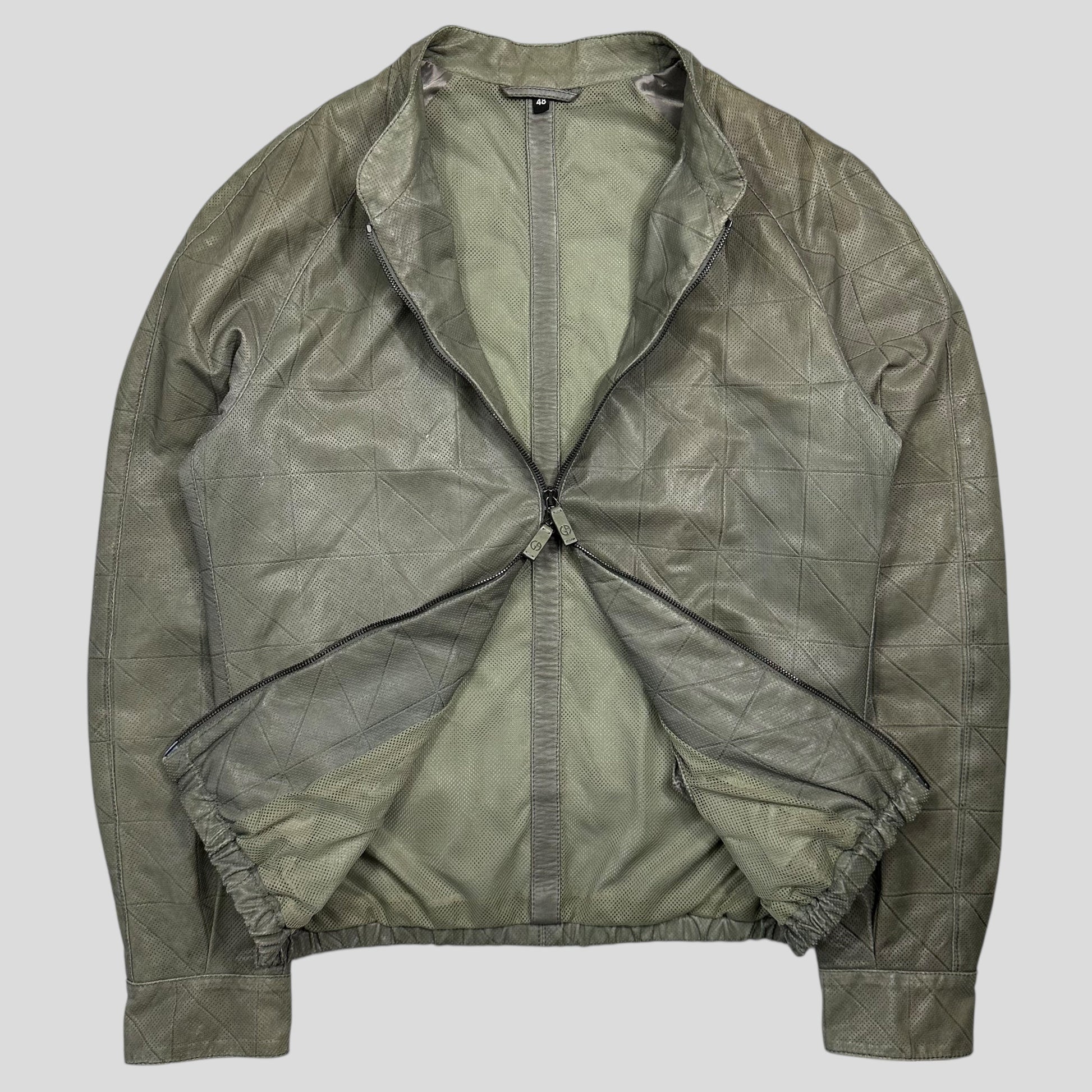 Extremely rare Giorgio Armani mainline lightweight lambs leather bomber jacket, lovely cropped sporty moto cut, unique perforated mesh leather with all over embossed grid pattern, soft khaki grey colour, dual branded lampo zips, made in Italy, buttoned cuffs and hand pockets, inside pockets and mesh lining.