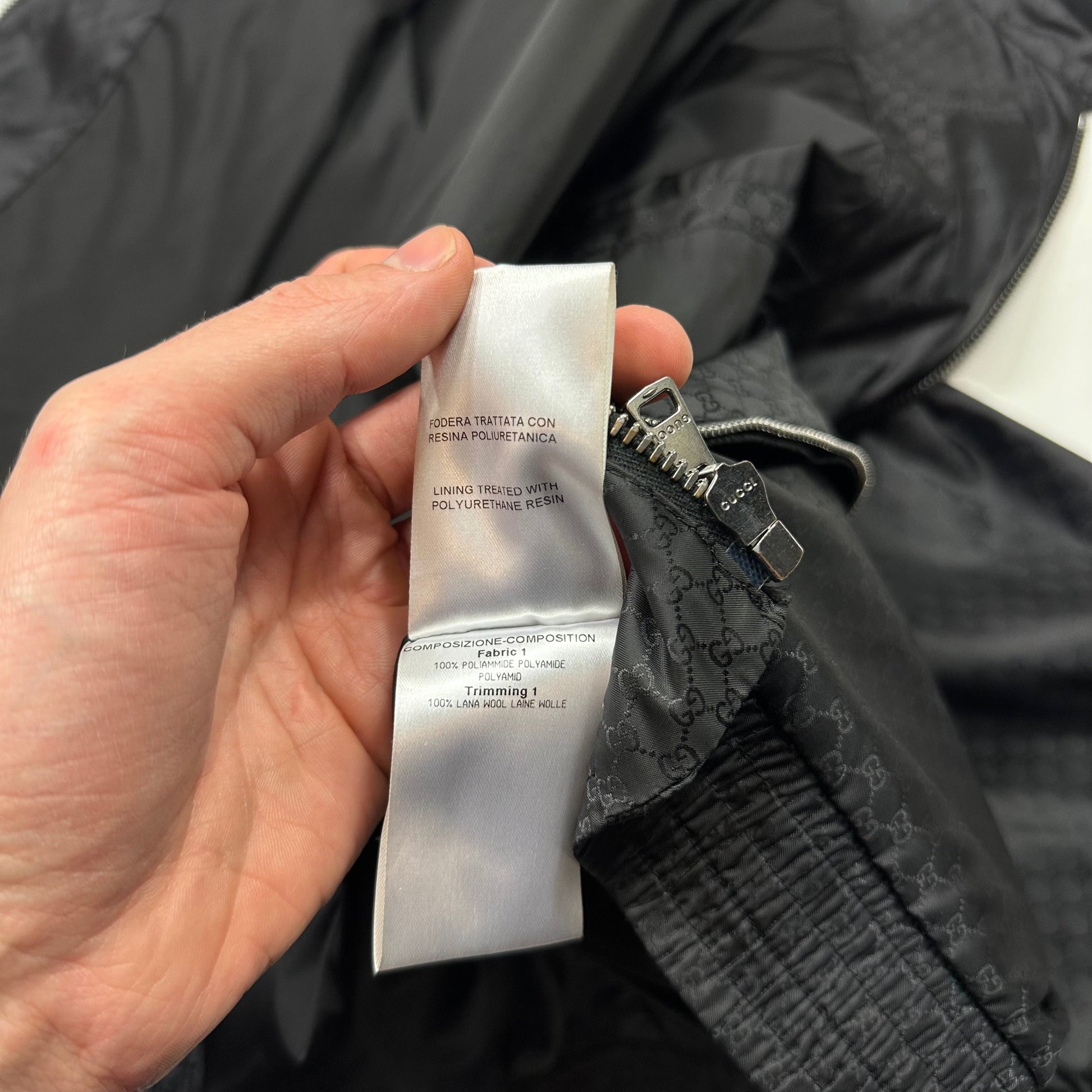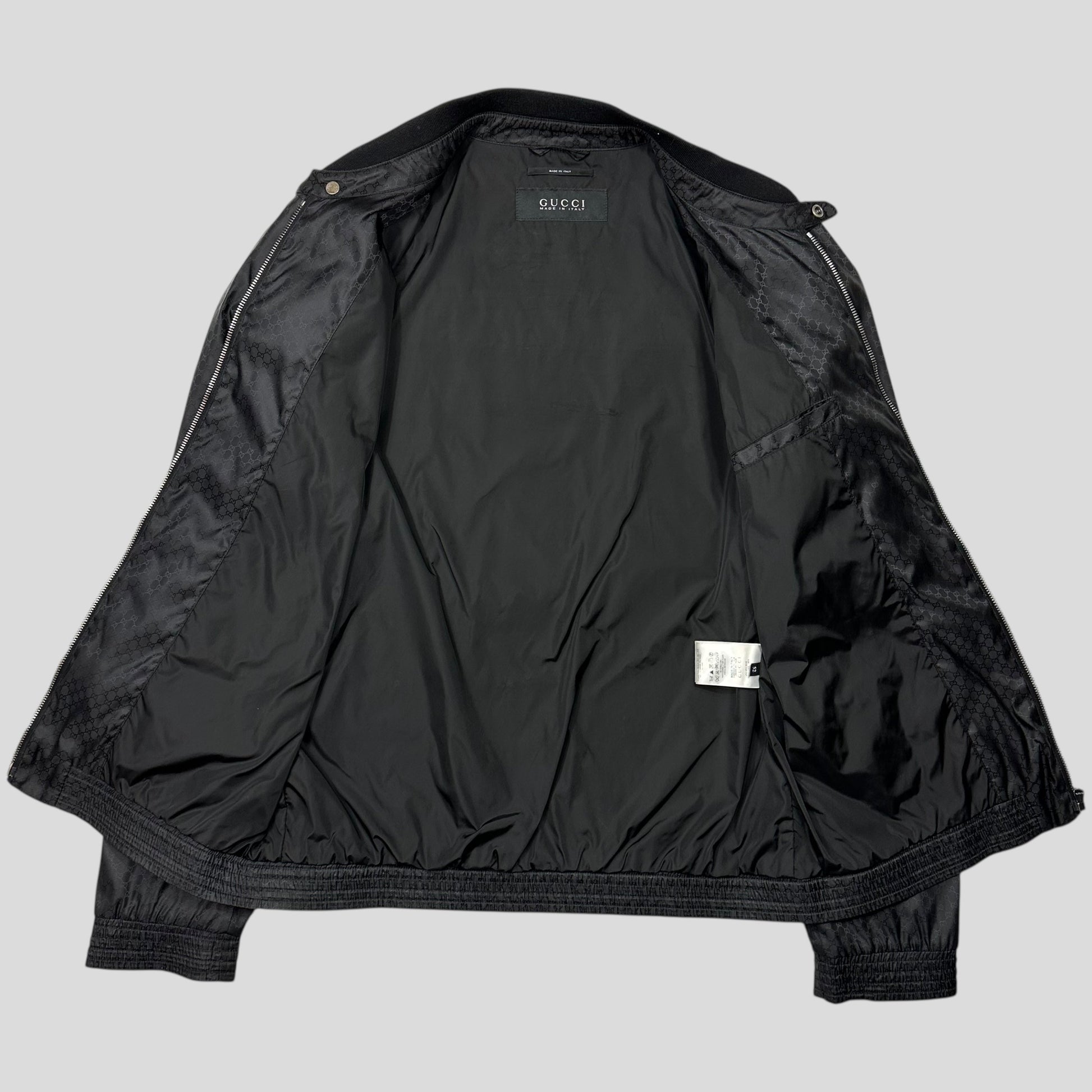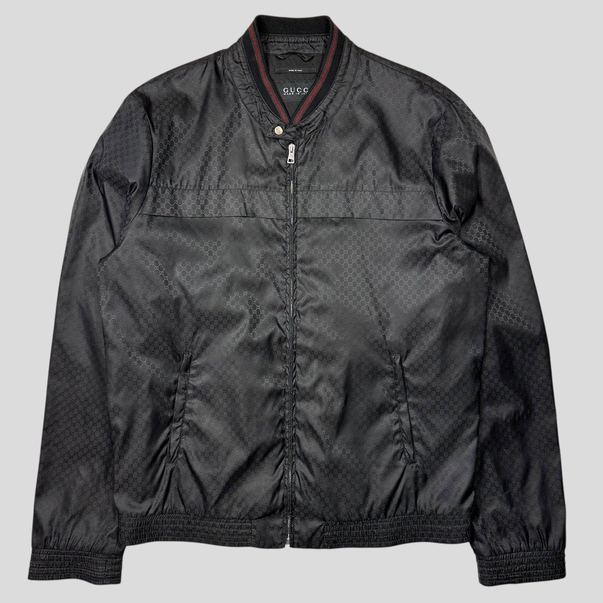 Very rare black Gucci all over monogram GG print nylon windbreaker bomber track jacket, web stripe logo to neck, Gucci metal zips and buttons, made in Italy.
