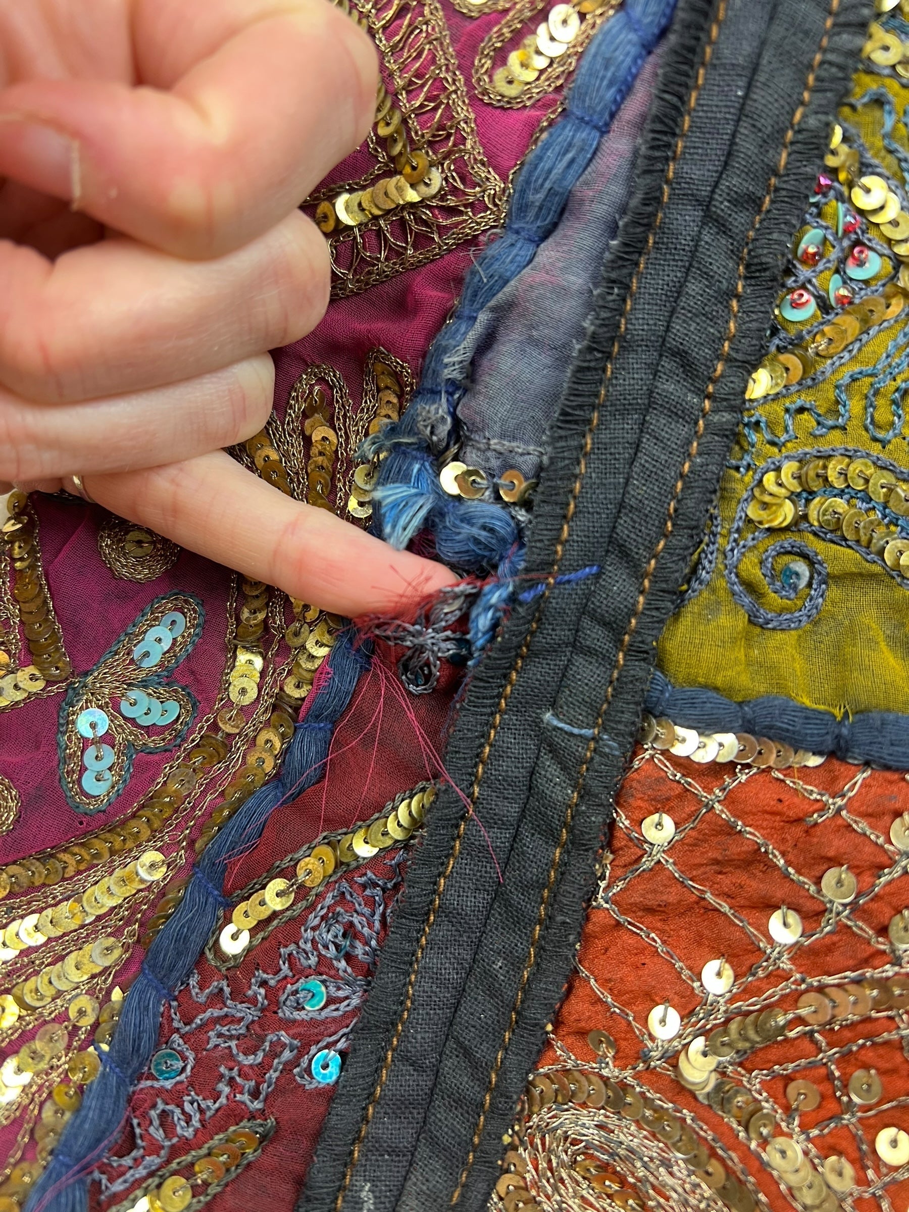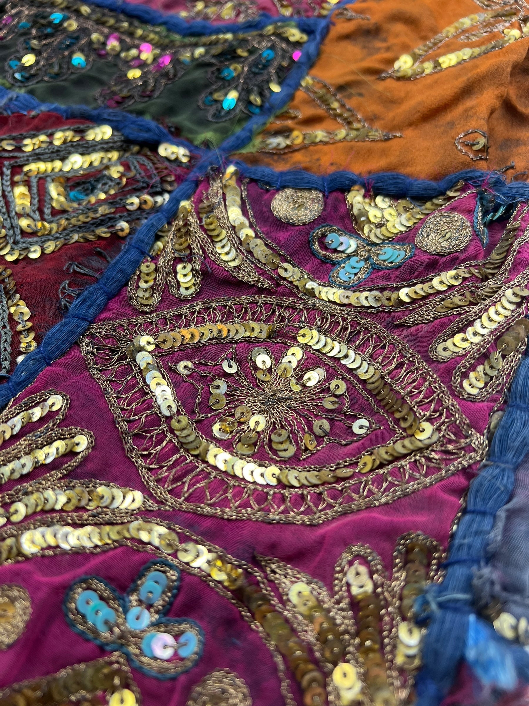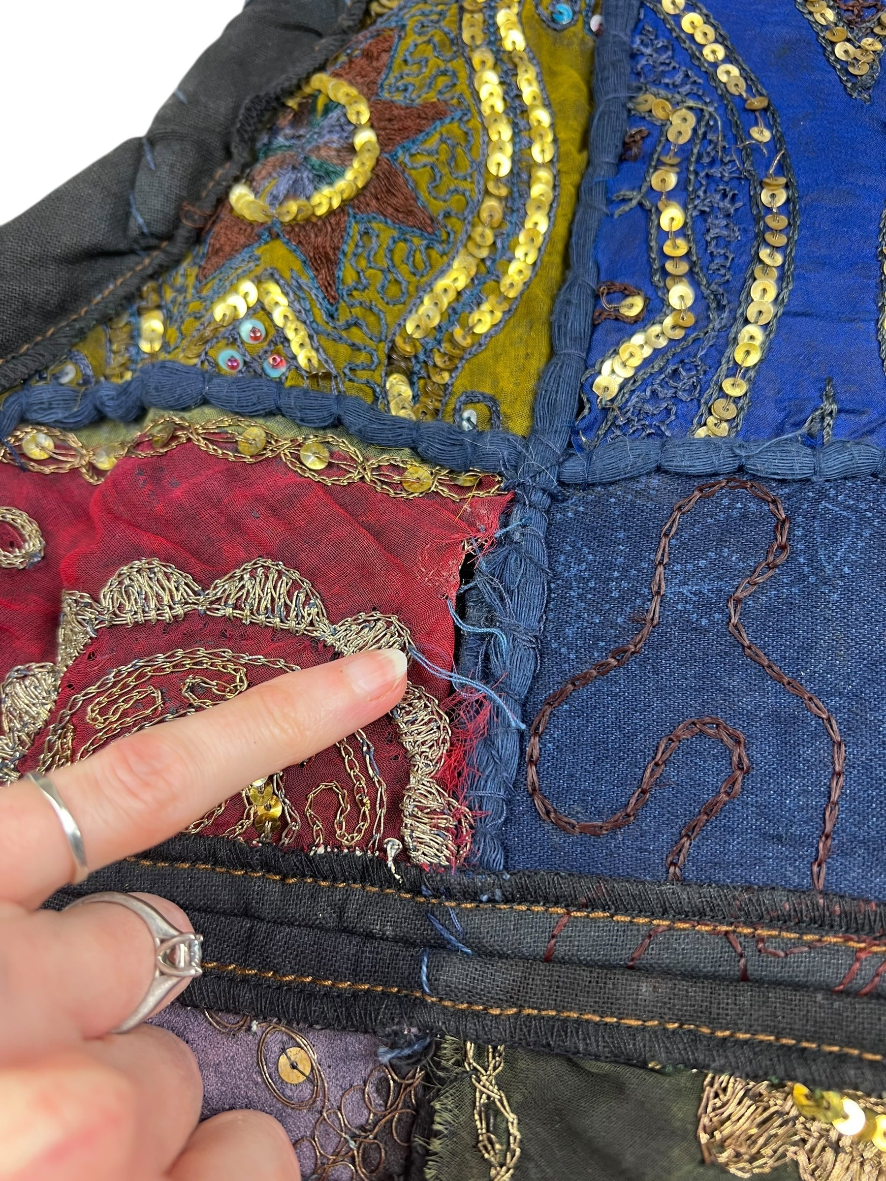 🫶 Condition is good overall with some age related wear which is common with this particular design. Some fraying and loose edges around some patches as shown. Armpits clean and stain-free. Some loss of embellishments but not noticeable. Specialist dry clean only.