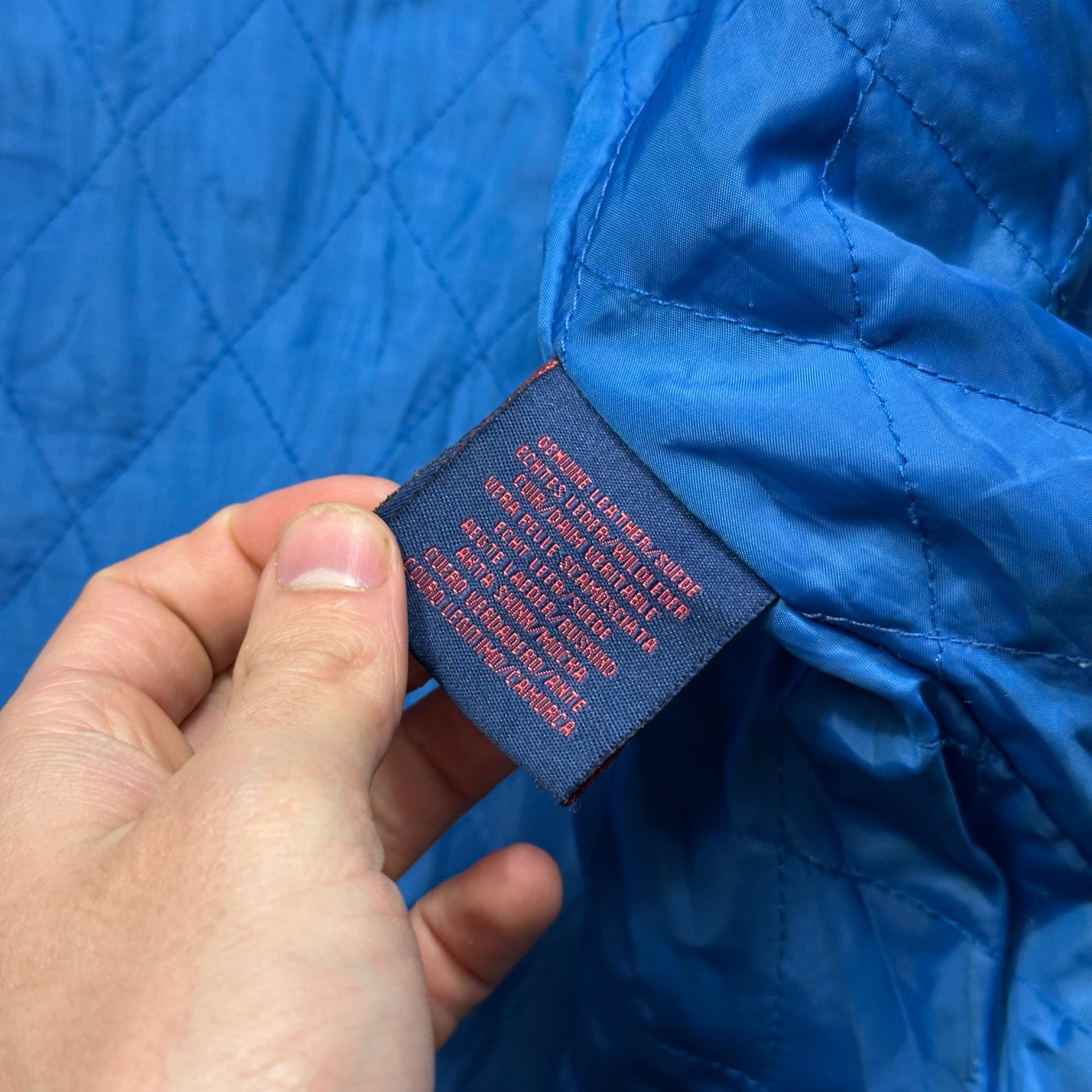 Rare 2000’s black real leather Kathrine Hamnet biker jacket, blue contrast nylon packable hood and quilted warm lining, quilted detailing to leather shoulders, pop button chest pockets and zip hand pockets.