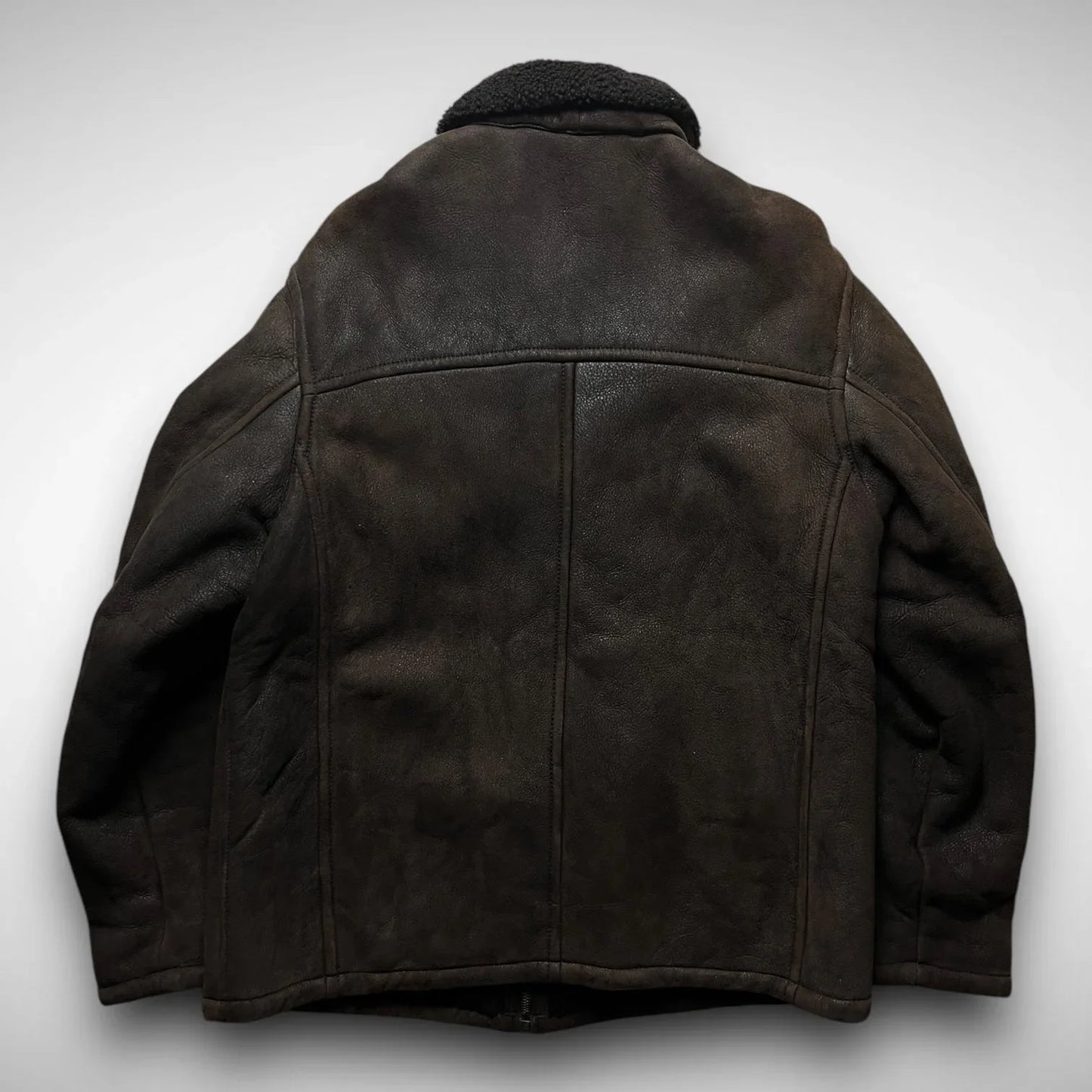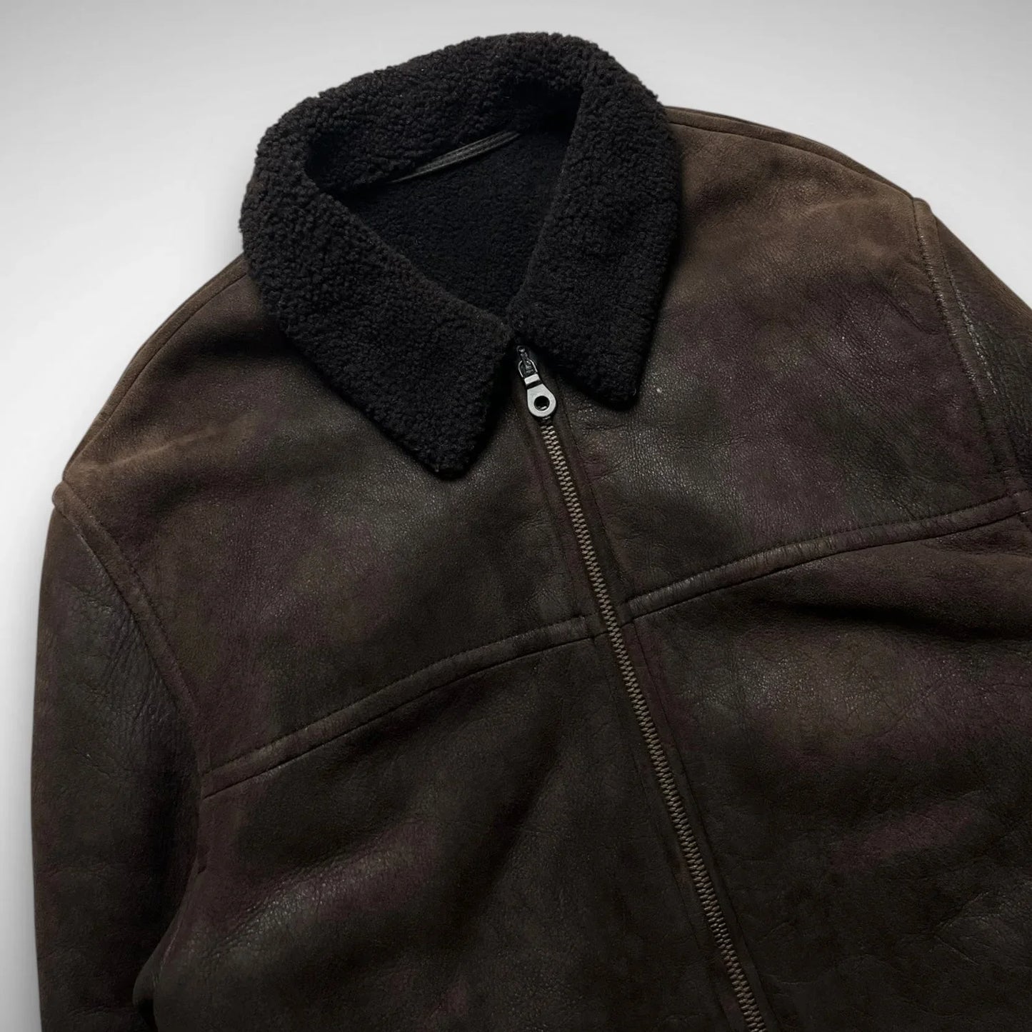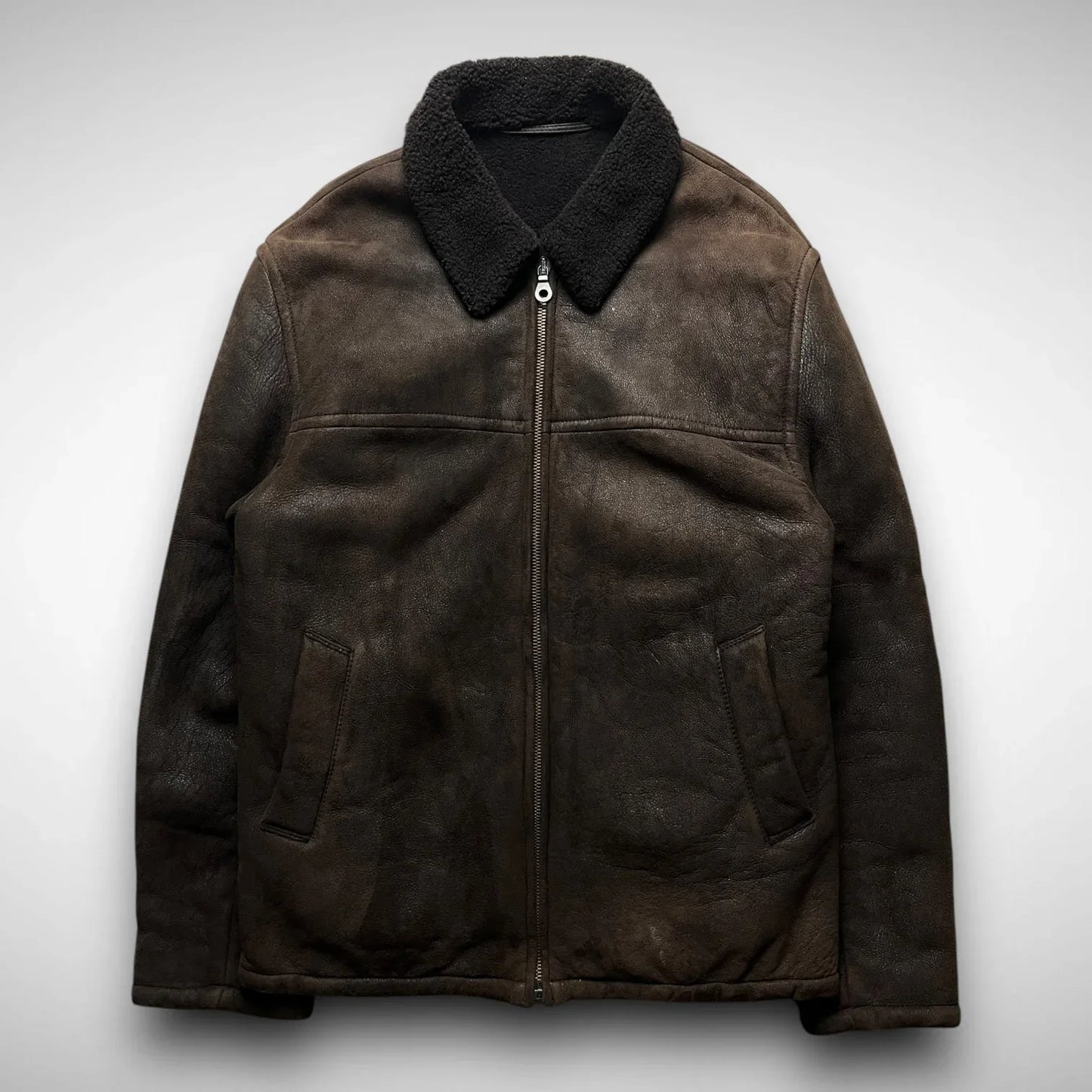 Thick leather jacket with a shearling collar and wool lining, double slide entry pockets, and a fat, made in Italy, MRS zipper.