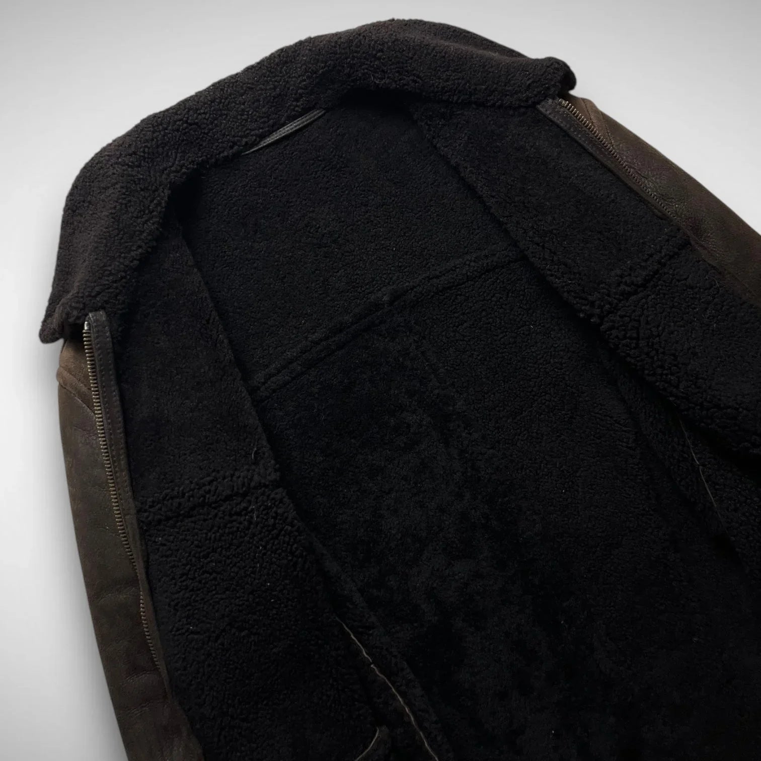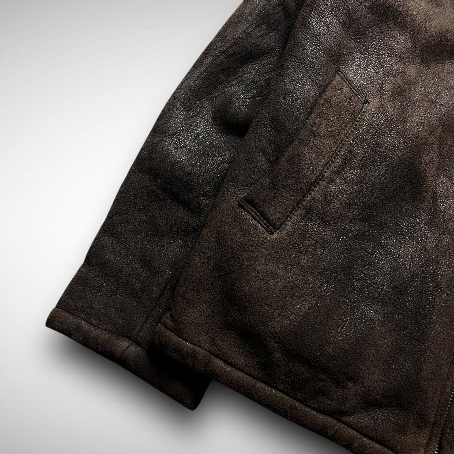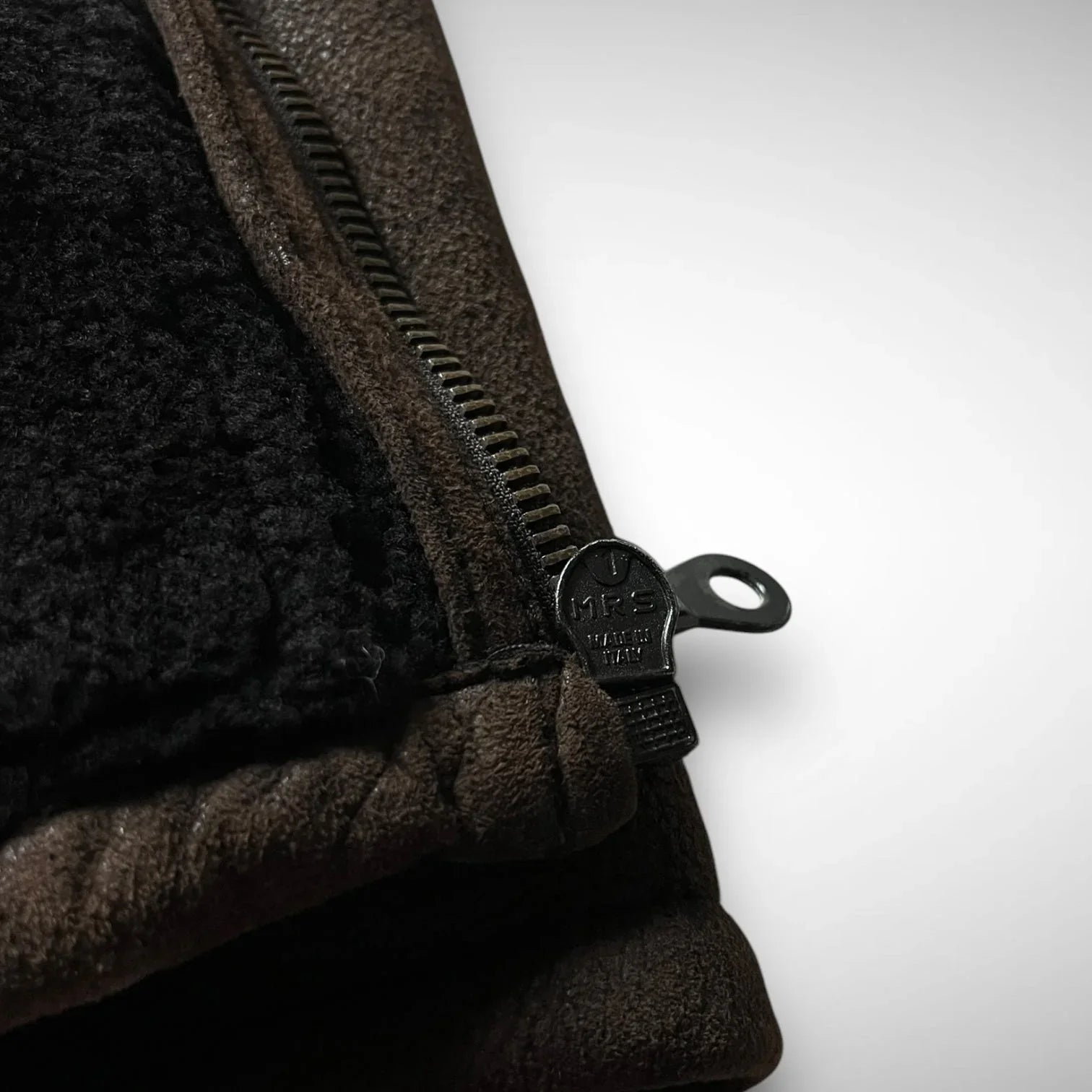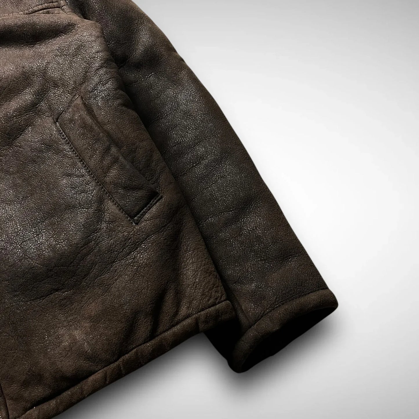 Thick leather jacket with a shearling collar and wool lining, double slide entry pockets, and a fat, made in Italy, MRS zipper.