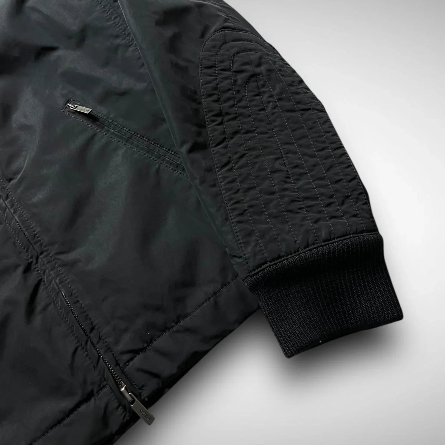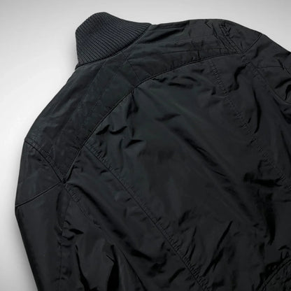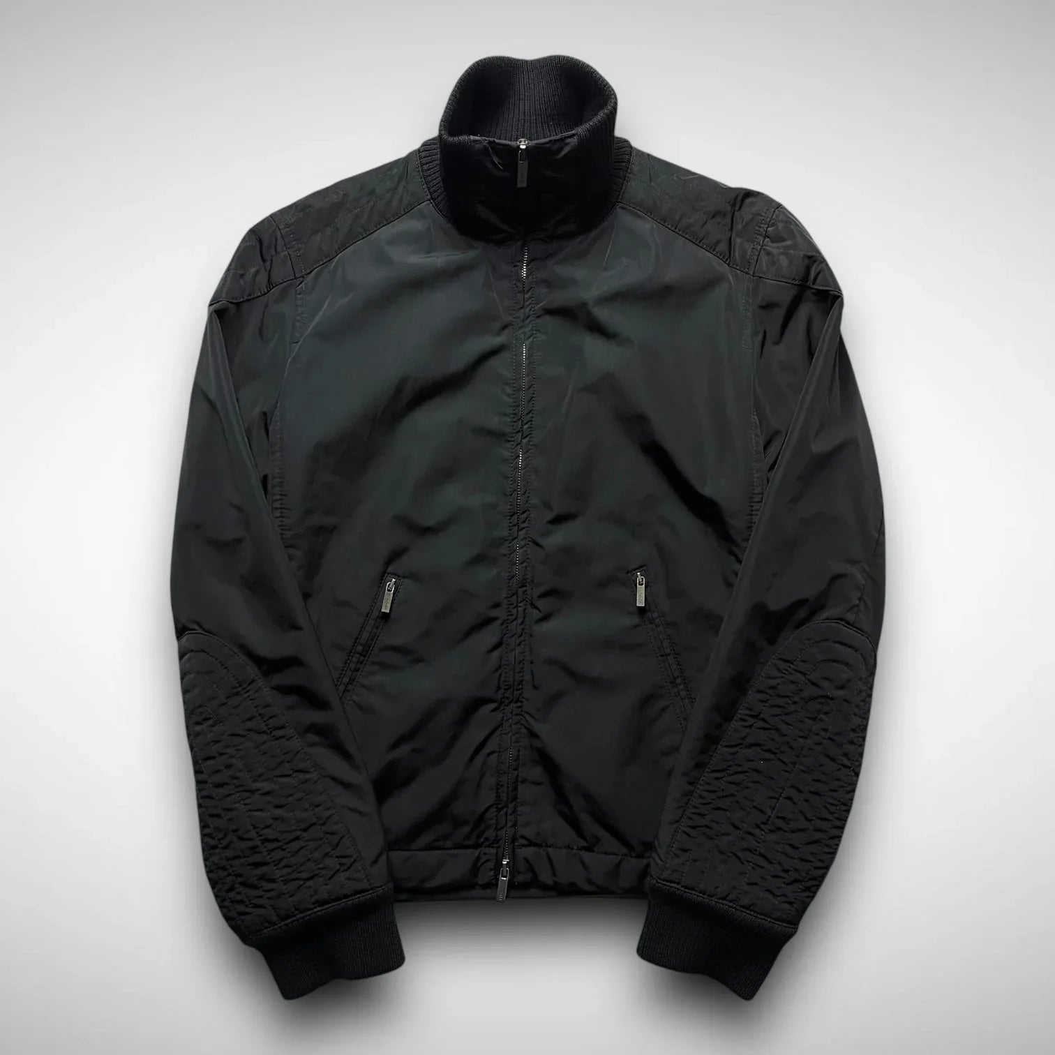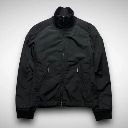 This Kenzo jacket from the late '90s to early 2000s is crafted from lightweight nylon, blending utilitarian detailing with a sleek silhouette. It features reinforced panels at the back shoulders, elbows, and lower back for added durability and structure. The design includes a ribbed funnel neck, ribbed cuffs, and a two-way zip closure, along with angled zip pockets for functionality.