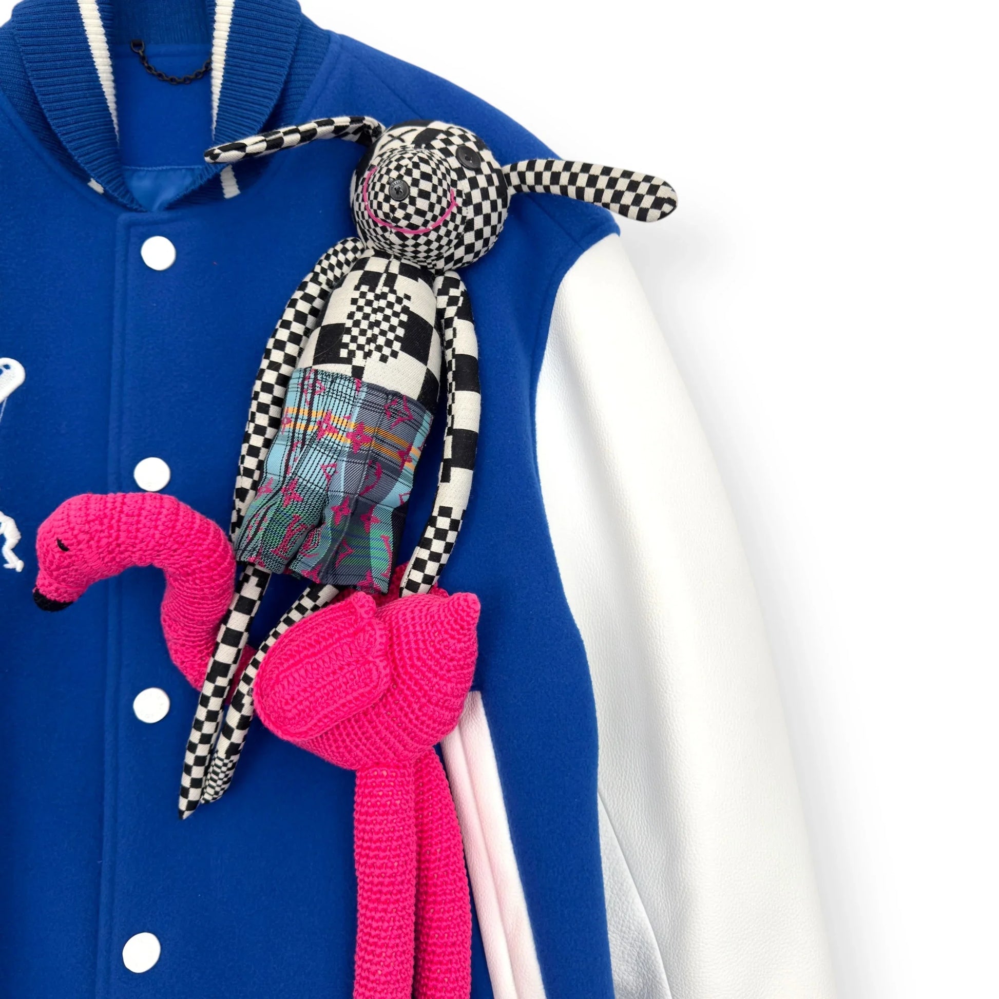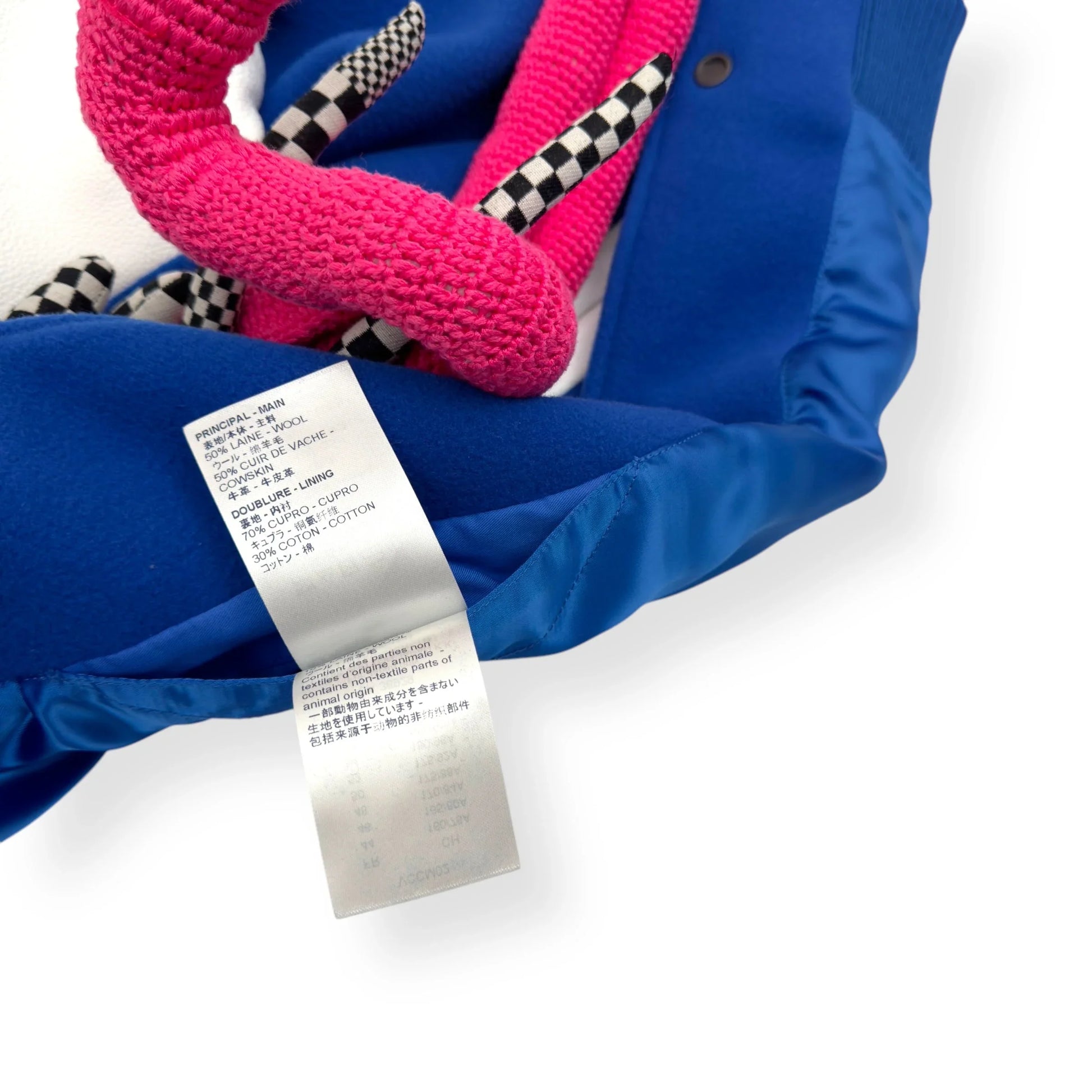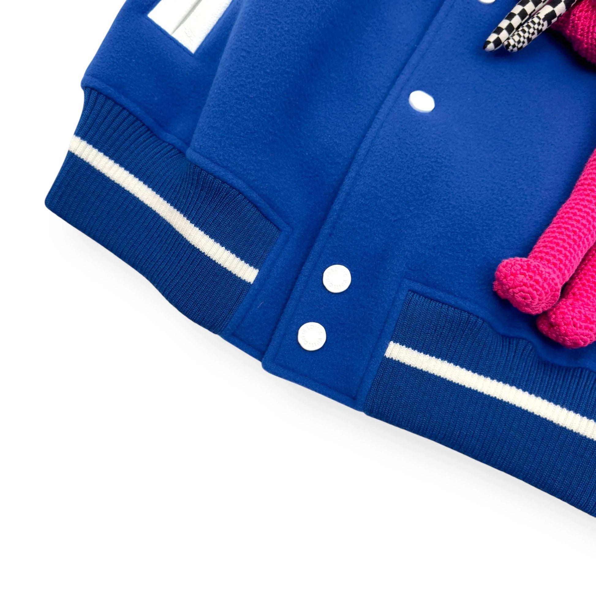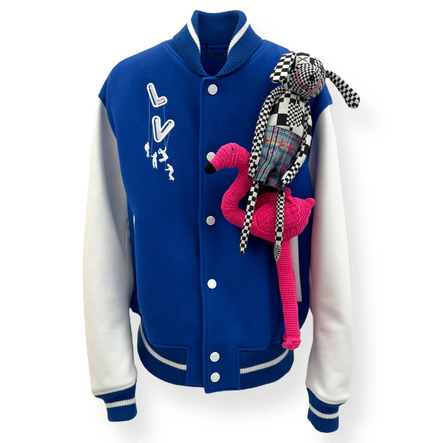 Size : S / 48 Condition : 2 RRP : £4,000 Measurements : Pit To Pit - 63cm , Shoulder To Shoulder - 54cm , Sleeve Length - 66cm , Length - 61.5cm The Louis Vuitton Blue & White Puppet Varsity Jacket is a standout piece from the brand's Spring/Summer 2021 collection, designed under the creative direction of Virgil Abloh. This jacket features a royal blue wool body complemented by white leather sleeves, embodying a classic varsity silhouette. Distinctive elements include blue and white striped ribbed knit detailing on the collar, cuffs, and hem, along with a white snap front closure. Embroidered white LV logos adorn the right chest and back, adding to its signature appeal. A unique aspect of this jacket is the inclusion of pink crocheted and checkerboard-patterned dog and mouse puppets attached to the left chest, enhancing its playful and avant-garde aesthetic. All our products come directly from professional footballers and celebrities, giving you access to the rarest, most exclusive pieces—each with a unique VIP history.