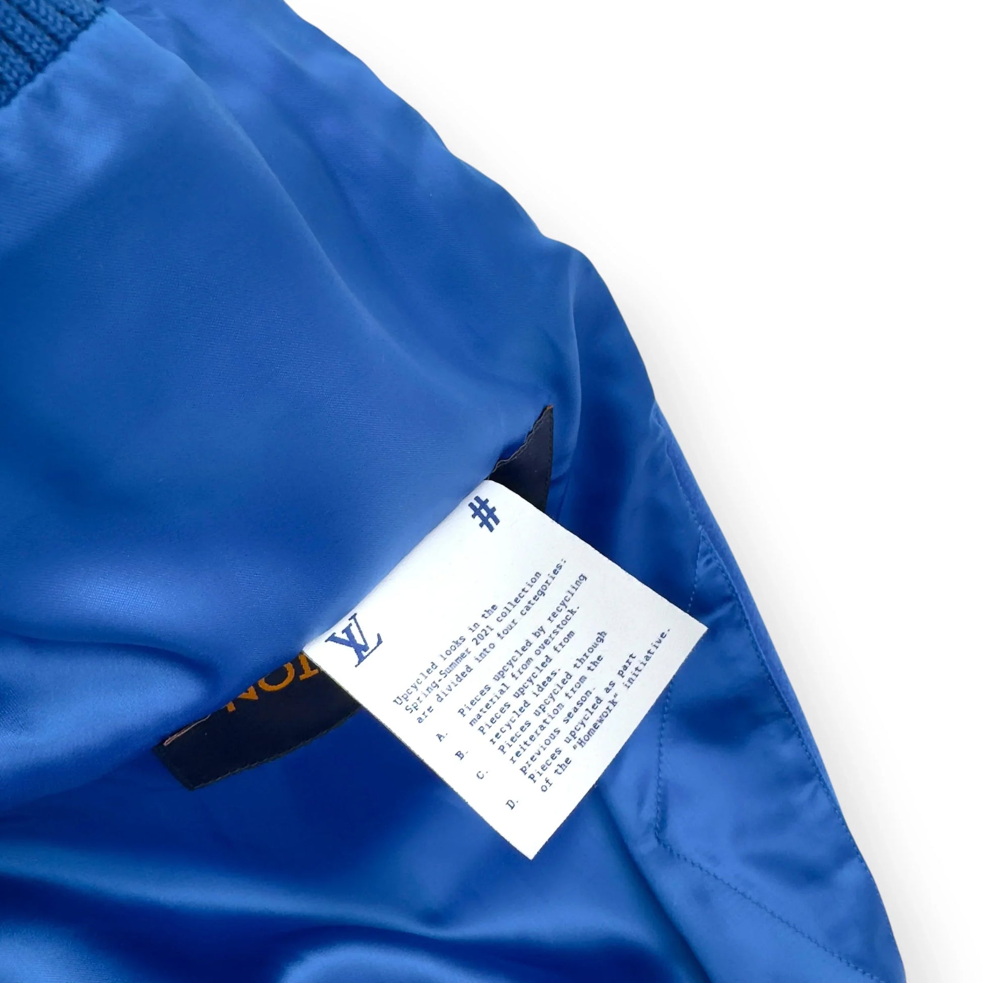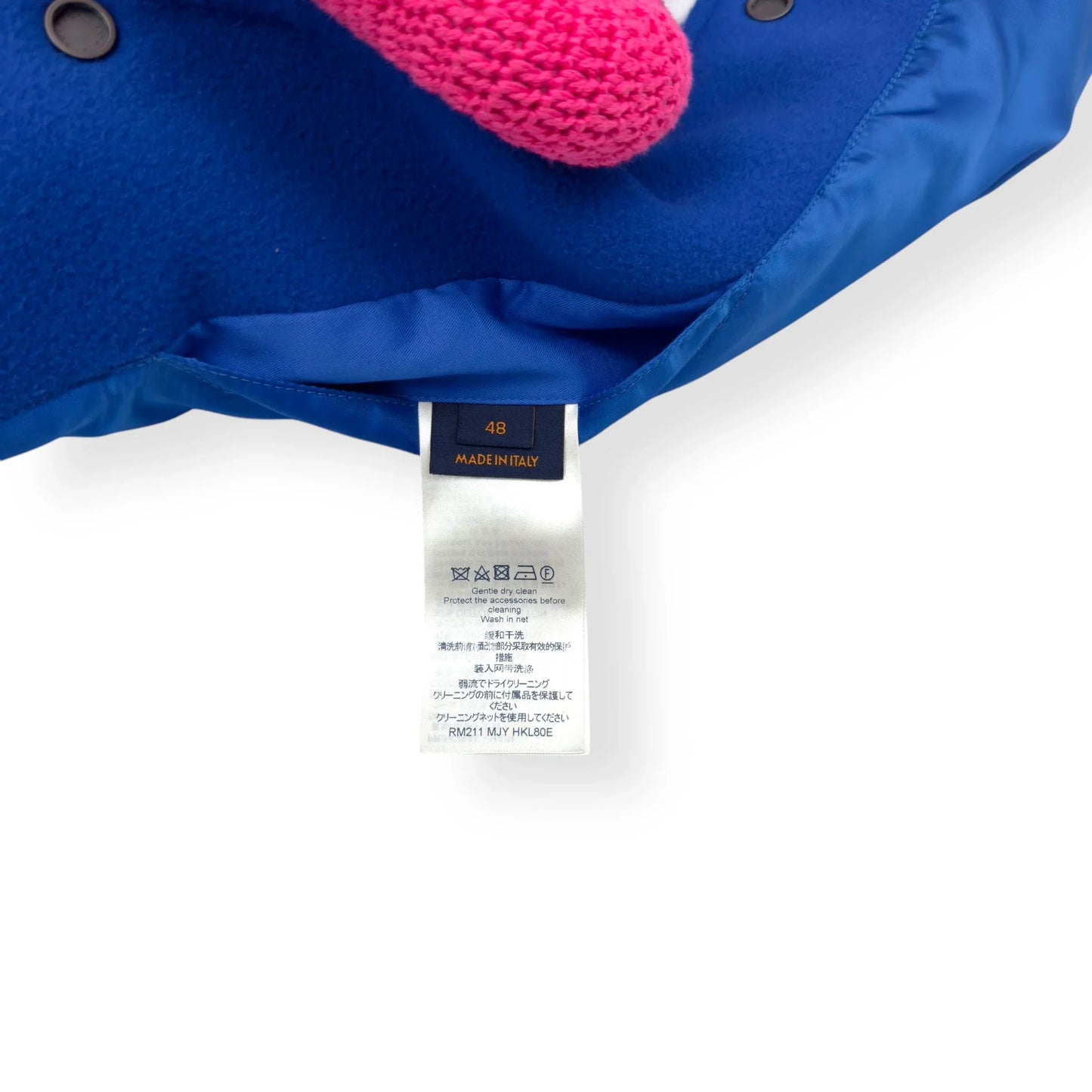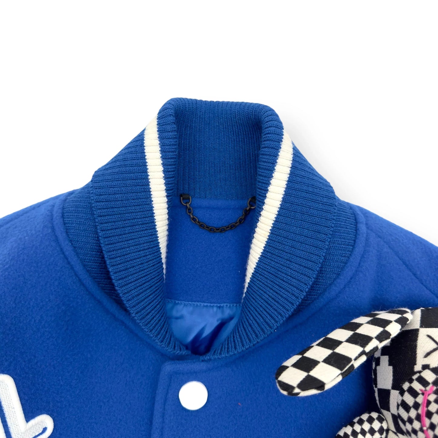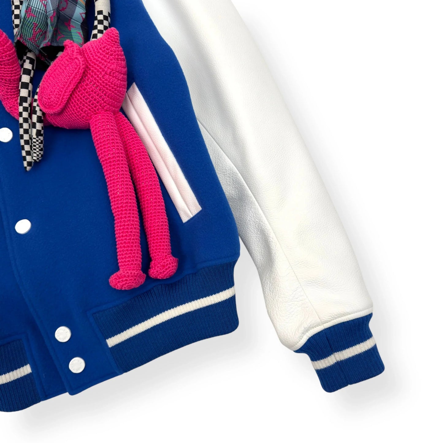 Size : S / 48 Condition : 2 RRP : £4,000 Measurements : Pit To Pit - 63cm , Shoulder To Shoulder - 54cm , Sleeve Length - 66cm , Length - 61.5cm The Louis Vuitton Blue & White Puppet Varsity Jacket is a standout piece from the brand's Spring/Summer 2021 collection, designed under the creative direction of Virgil Abloh. This jacket features a royal blue wool body complemented by white leather sleeves, embodying a classic varsity silhouette. Distinctive elements include blue and white striped ribbed knit detailing on the collar, cuffs, and hem, along with a white snap front closure. Embroidered white LV logos adorn the right chest and back, adding to its signature appeal. A unique aspect of this jacket is the inclusion of pink crocheted and checkerboard-patterned dog and mouse puppets attached to the left chest, enhancing its playful and avant-garde aesthetic. All our products come directly from professional footballers and celebrities, giving you access to the rarest, most exclusive pieces—each with a unique VIP history.