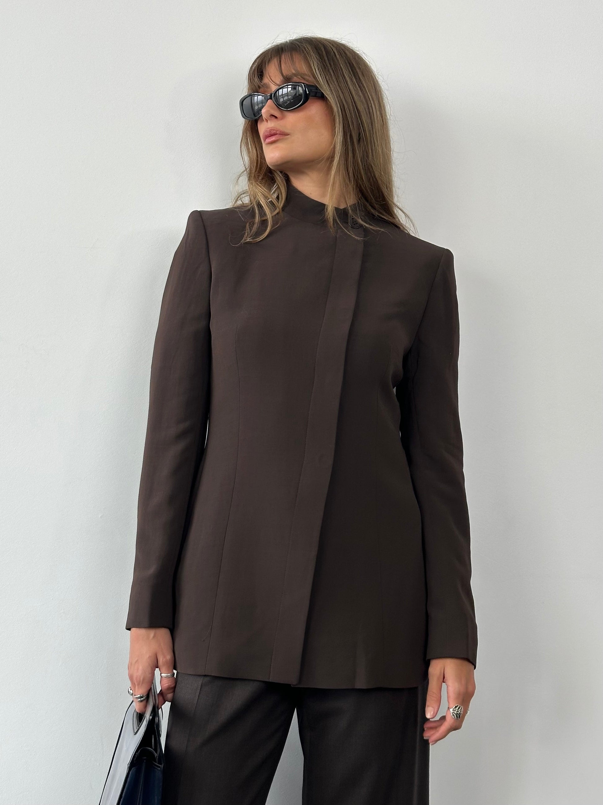 Max Mara 2000s tailored blazer featuring a high stand collar, concealed plackey and vertical dart seams for a streamlined asymmetrical silhouette.
