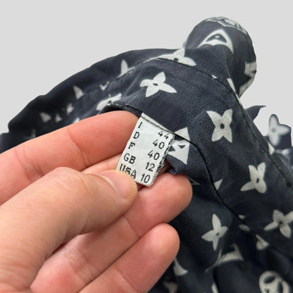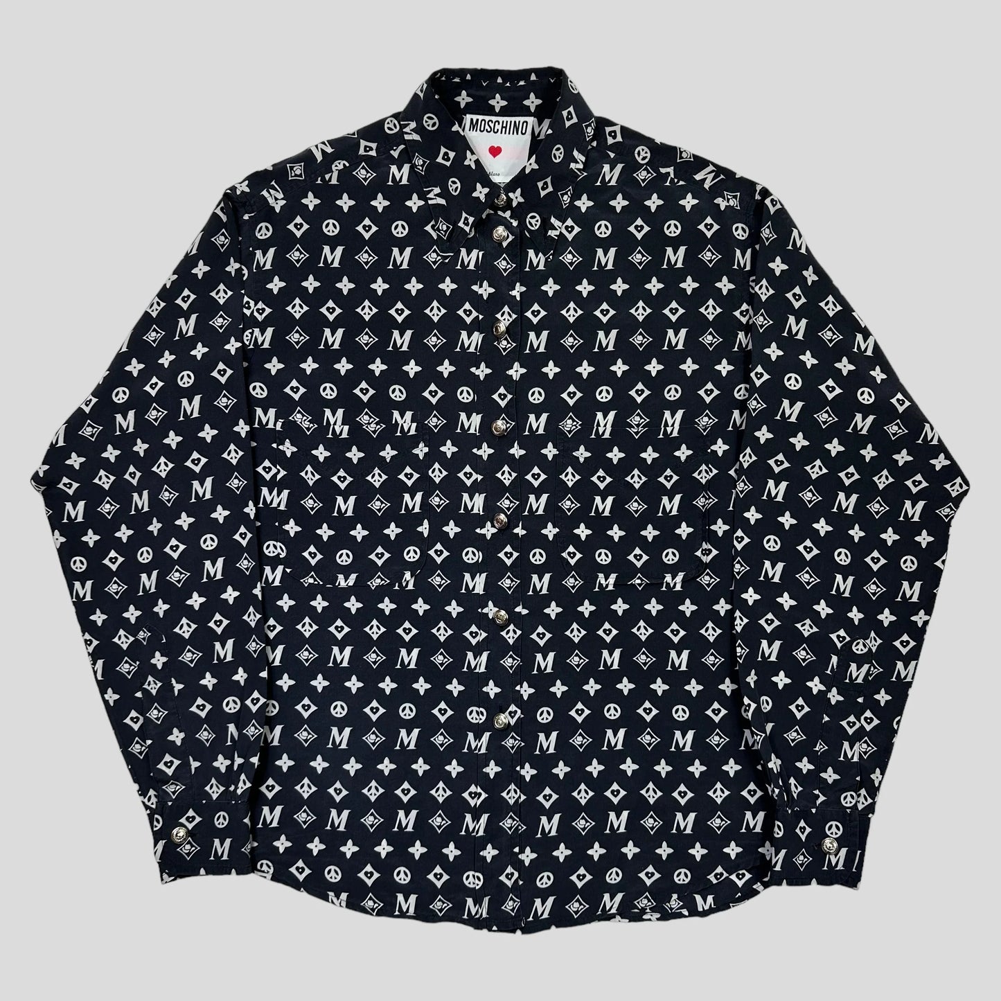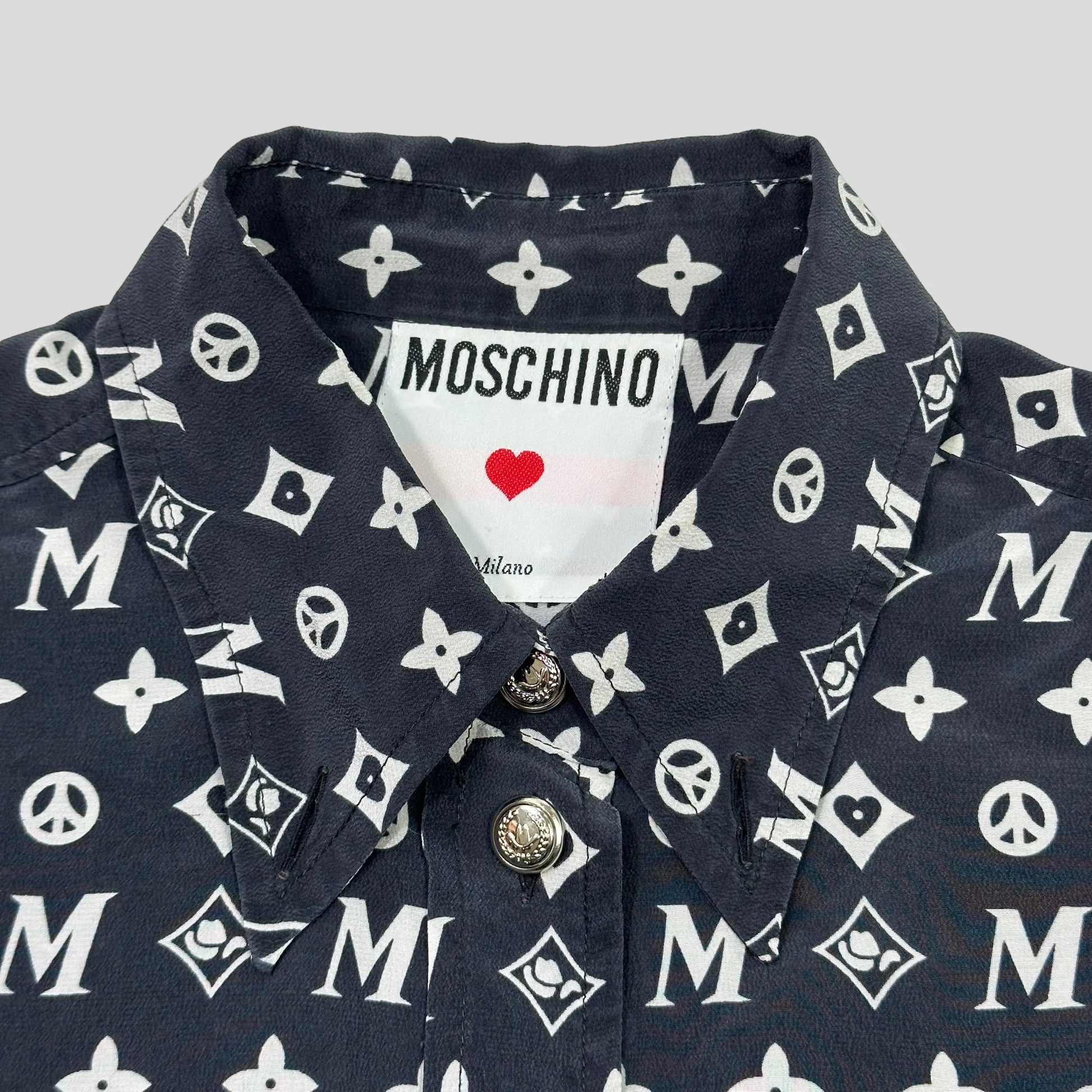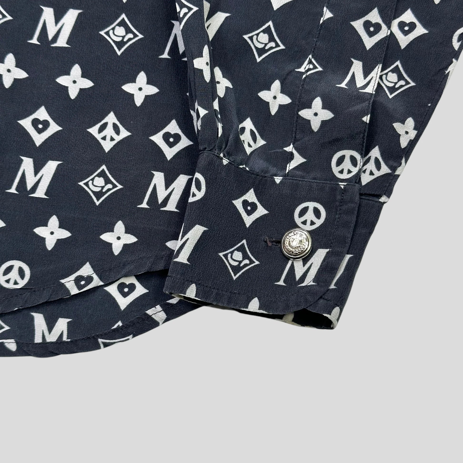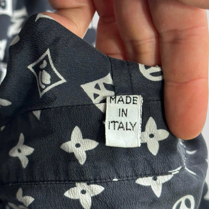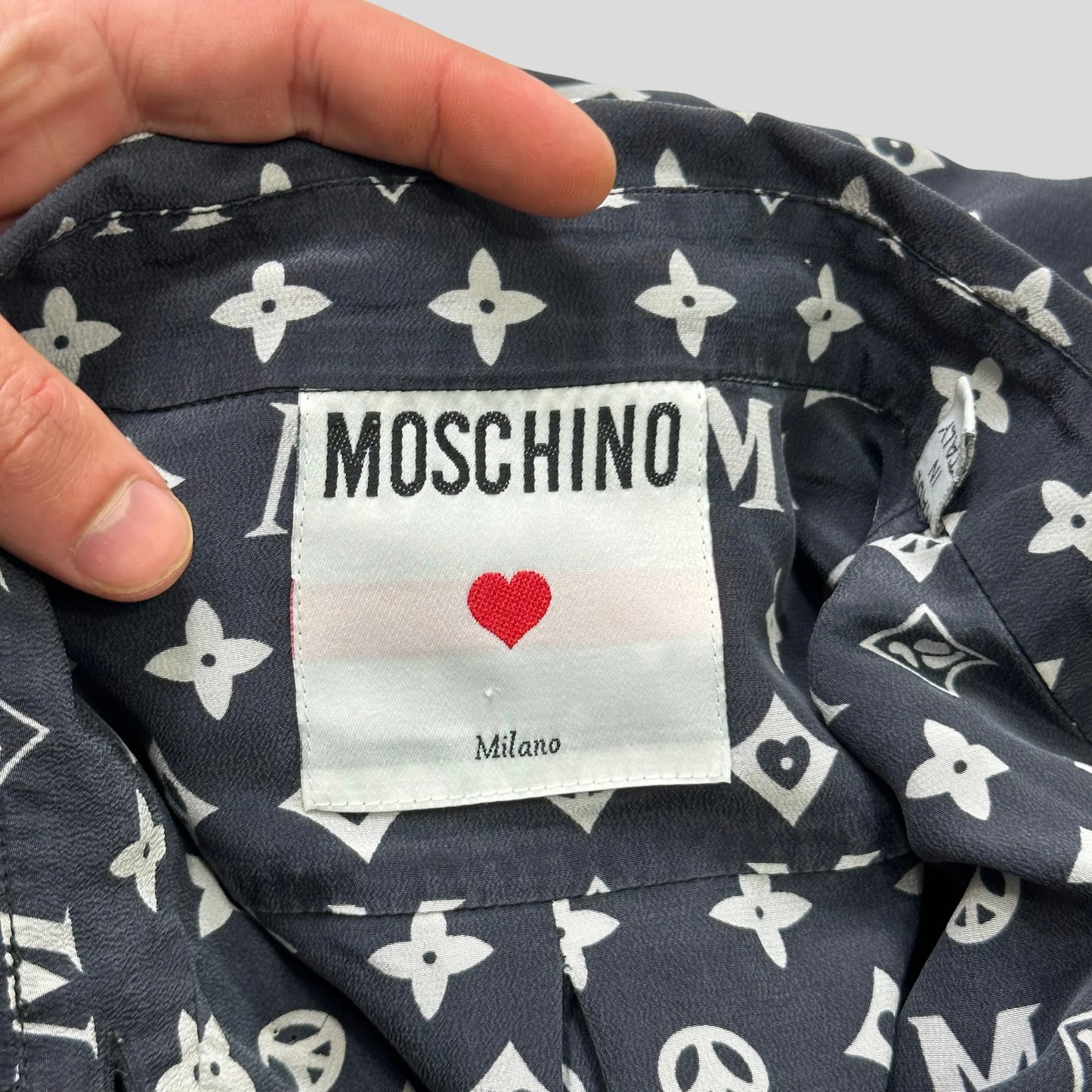 Extremely rare 1984 Moschino LV Rip Shirt, from the first ever Moschino season, an incredible 100% silk shirt with a fun Franco twist on the iconic LV print, beautiful silver metal buttons, double chest pocket, very dark grey colourway with soft white print.