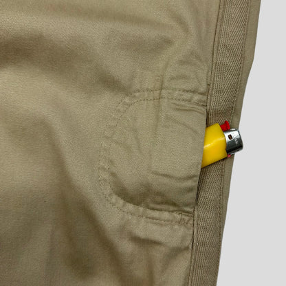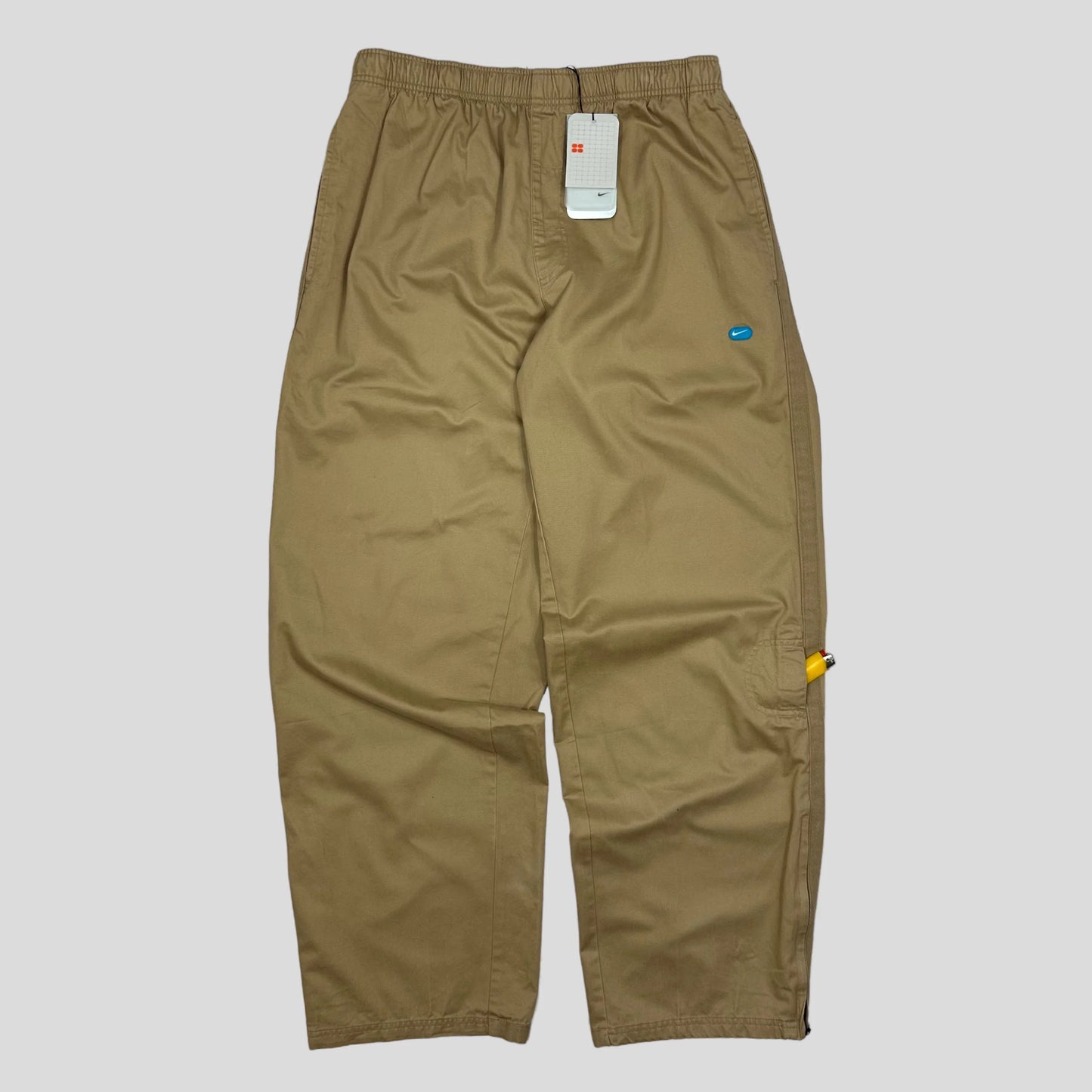 Brand new with tags from 2001, incredible pair of Nike Trackpants, lovely tan cotton construction with a taped seam on either side, embrodiered blue Nike swoosh patch and a unique mini stash pocket to the lower leg.
