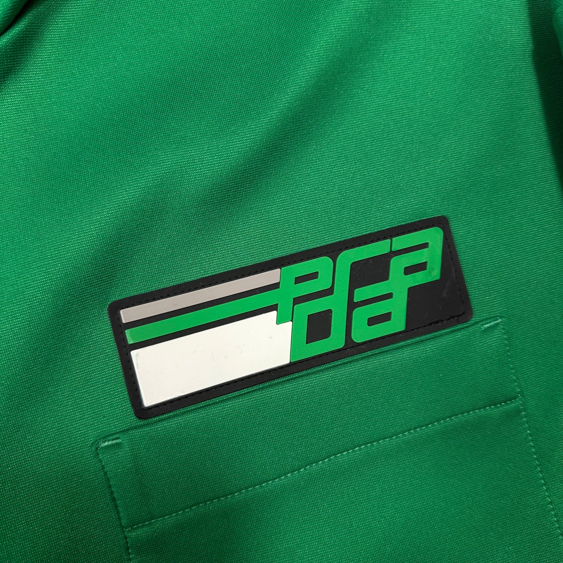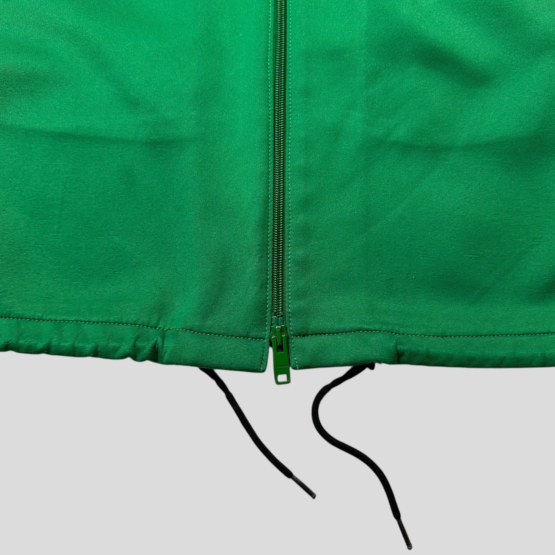 Extremely rare Prada 2018 vibrant apple green polyester scuba parka jacket with rubberised race chest logo, incredibly unique shape and material, cinchable drawstrings to hem and hood, hood is oversized and ninja style.