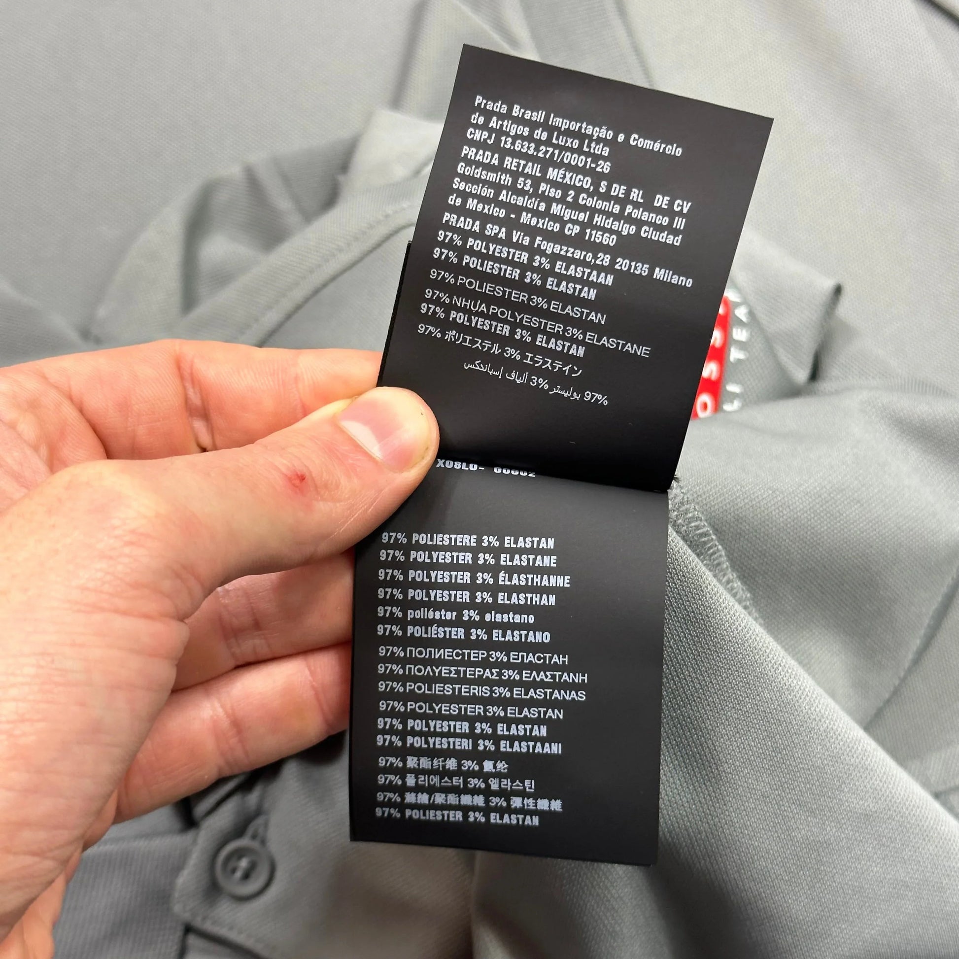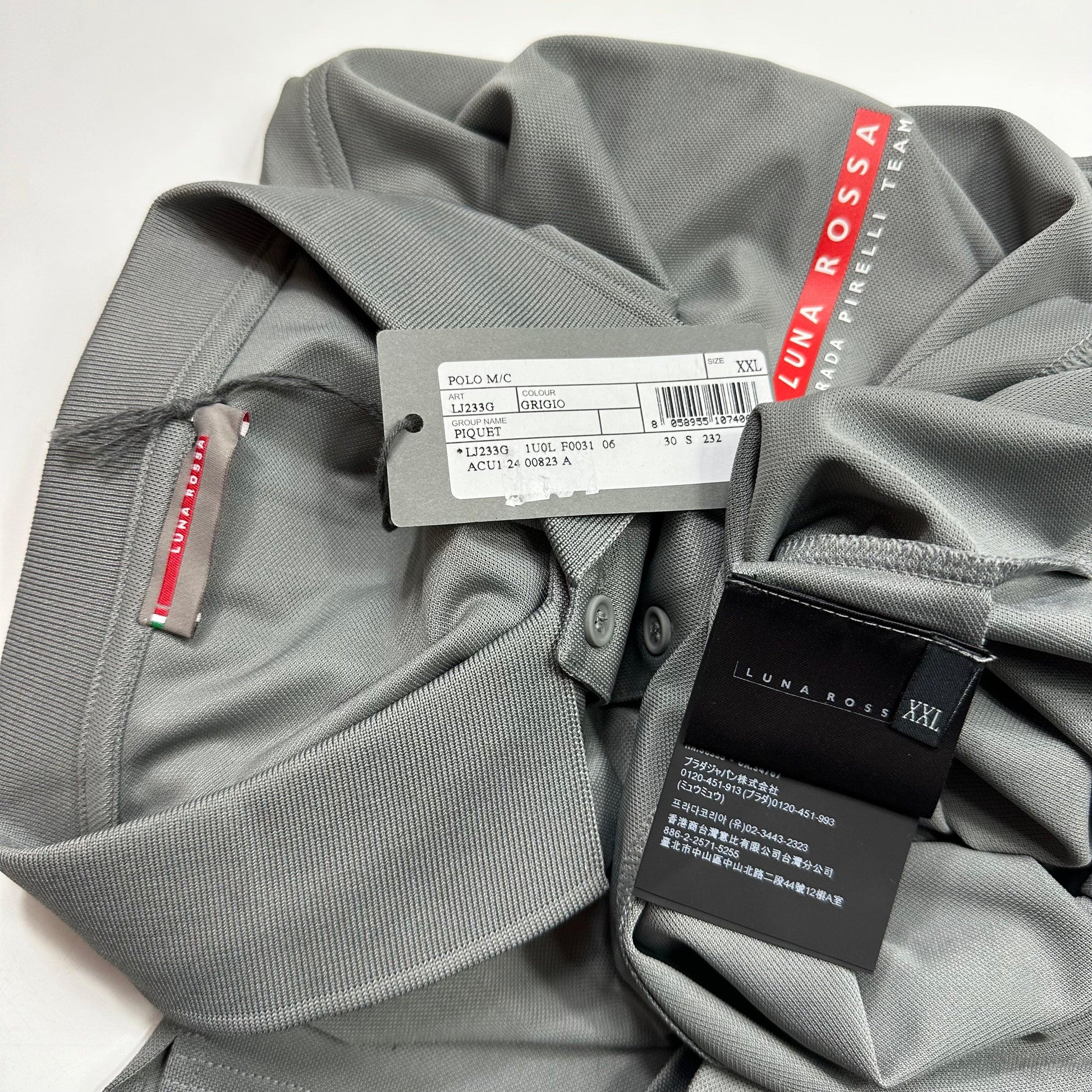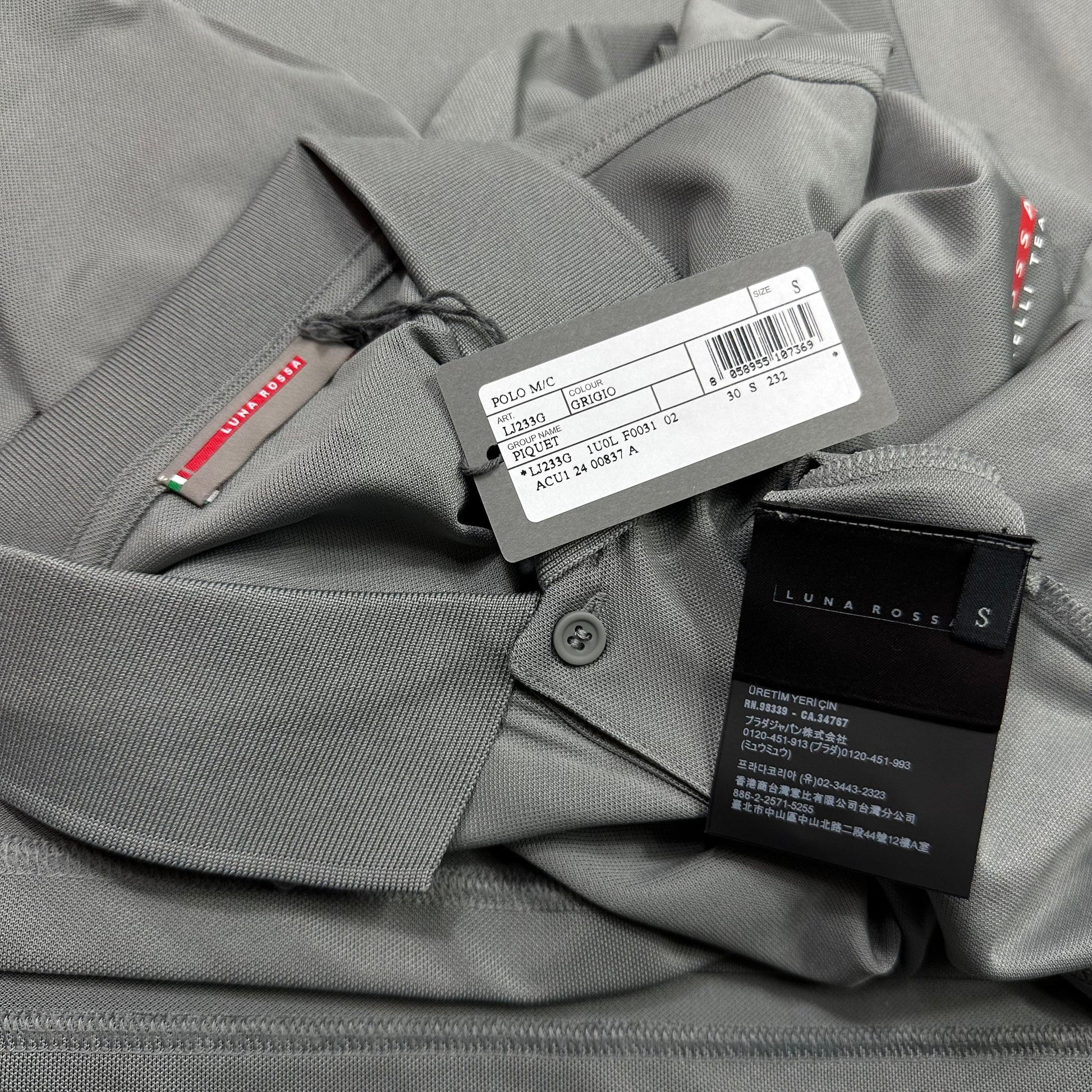 Brand new with tags Prada Americas Cup technical grey pique polo with Luna Rossa red stripe logo tabs and perelli branding.