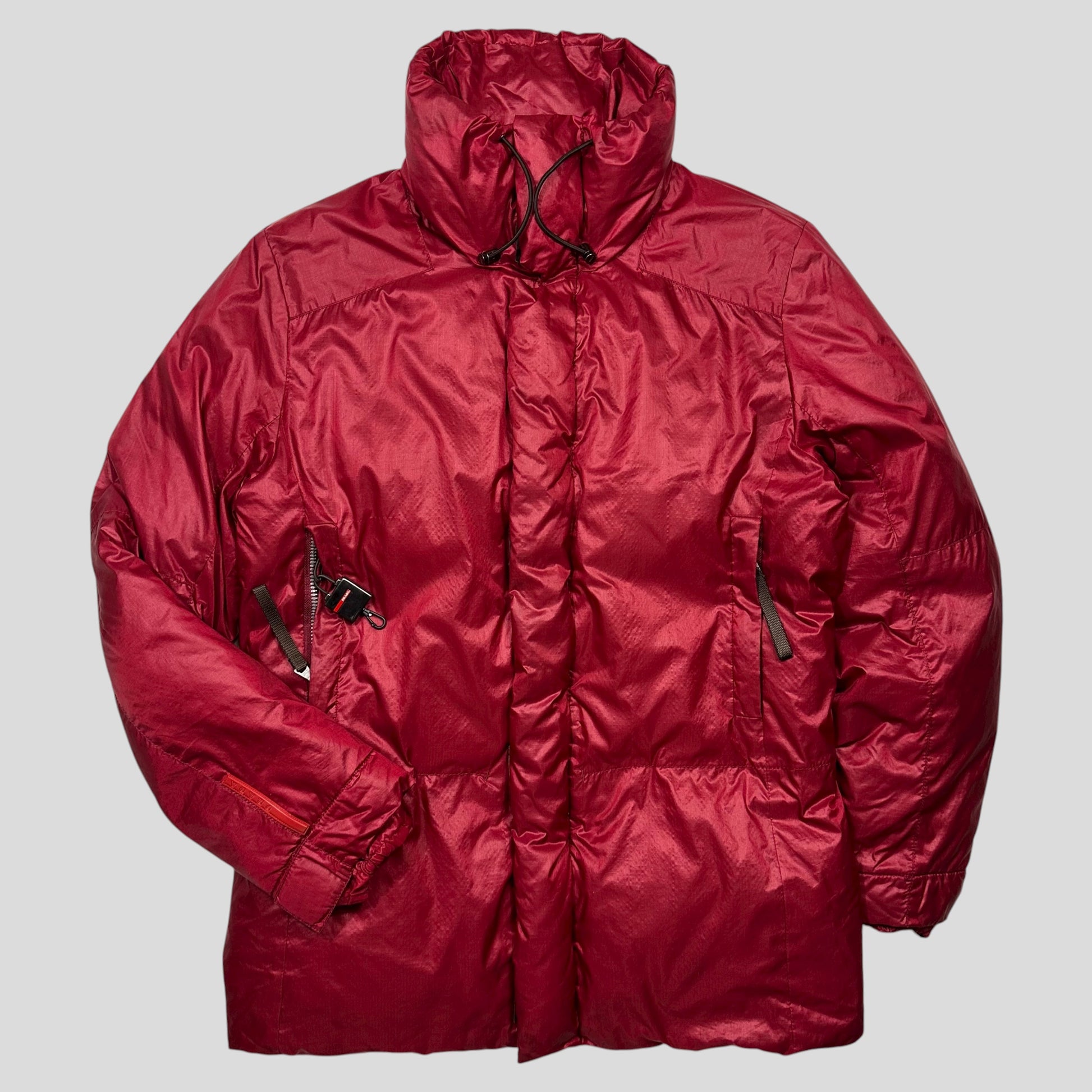Extremely rare Prada Sport Autumn Winter 2000 Red Ultralight Ripstop Nylon Long Puffer Jacket with Goose Down Fill, cozy brown fleece lining, adjustable drawstrings at mid, zip pockets, down filled high neck with cords to tighten, red rubber logo to wrist, inside storage, Prada lock in pocket.