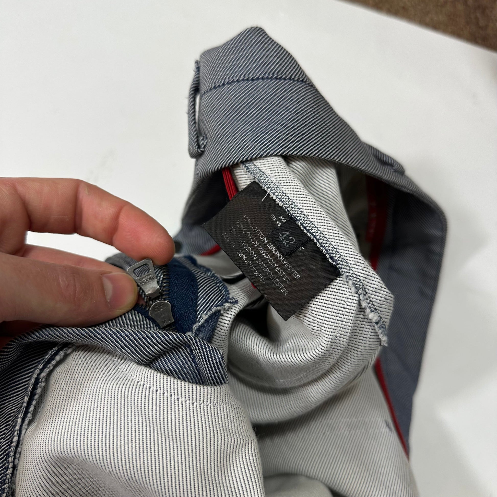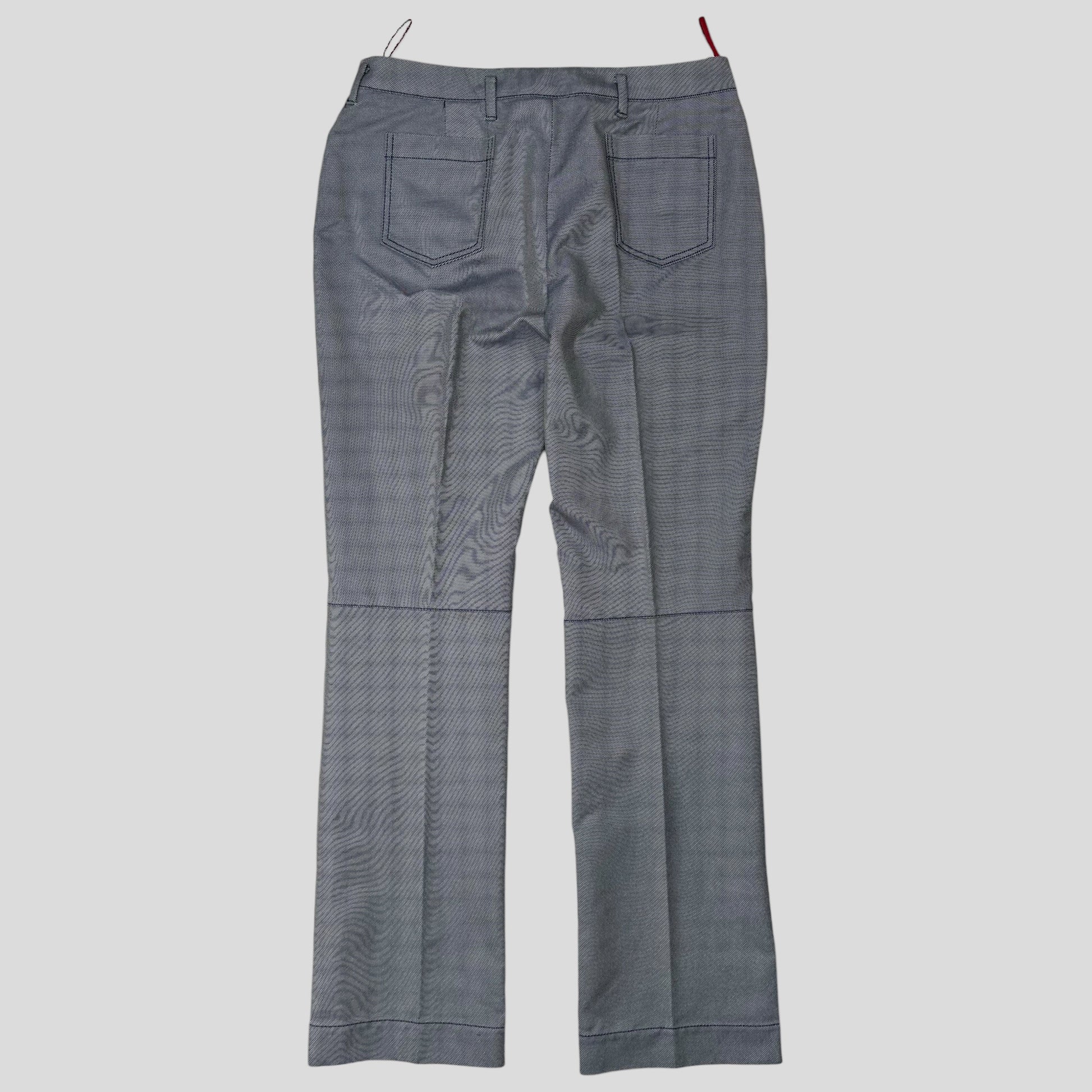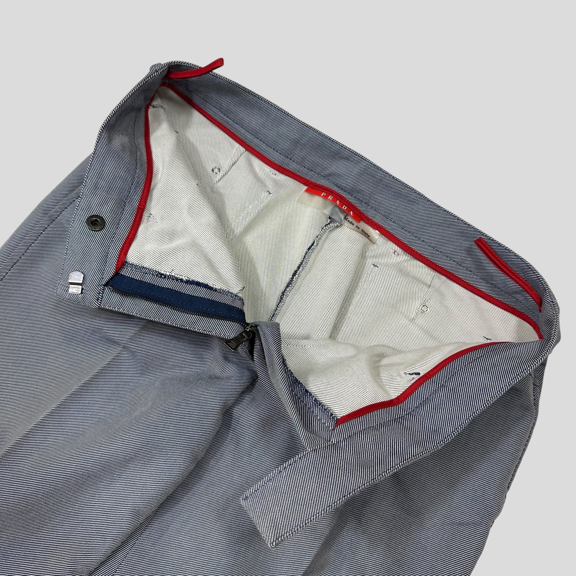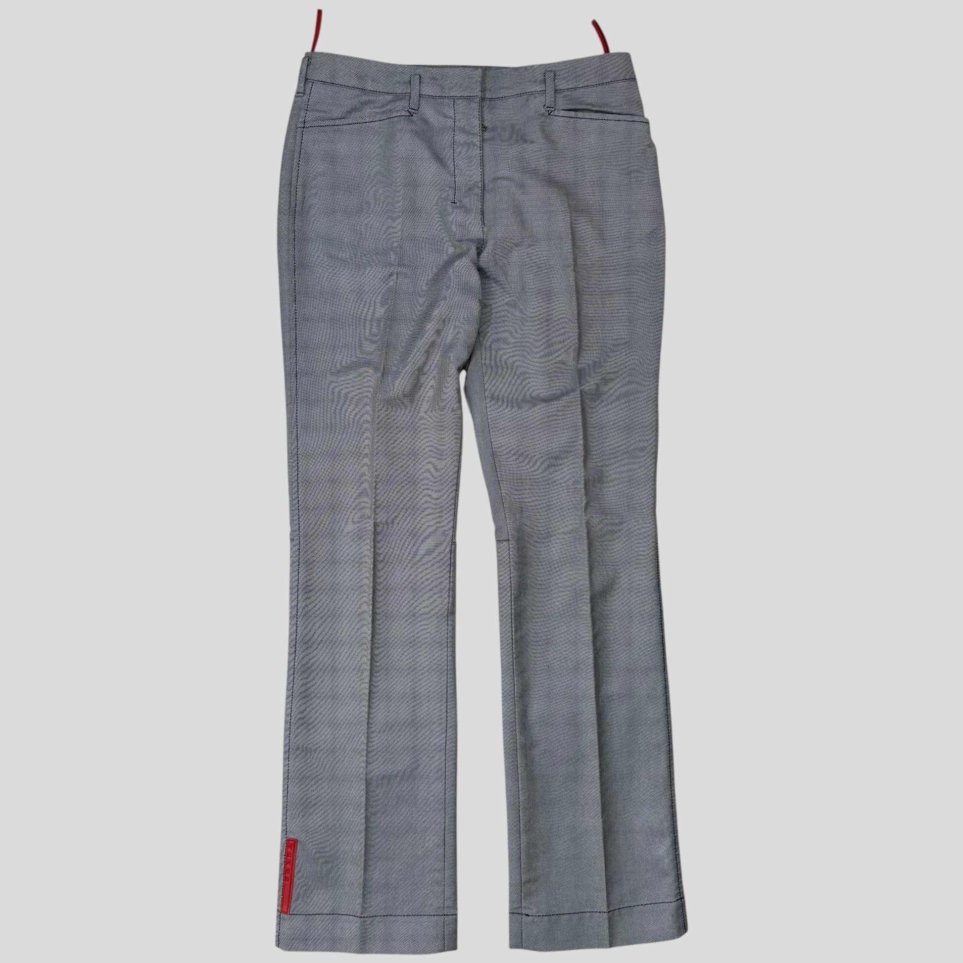 Rare Prada Sport autumn winter 2000 textured cotton poly mix trousers, unique material blending a two tone grey and black which creates an almost light blue blue denim colour to the eye, red sport logo to the ankle.