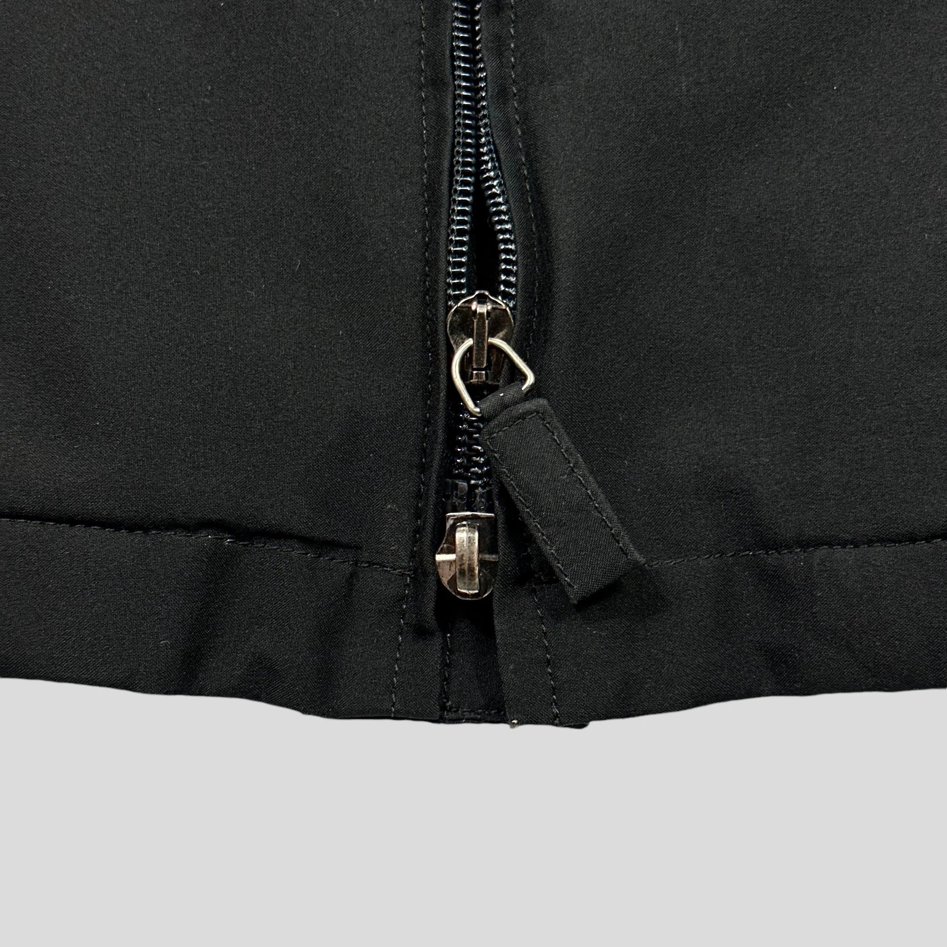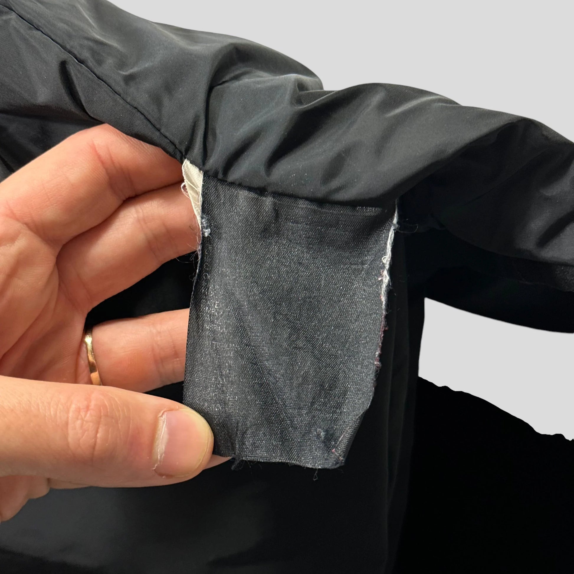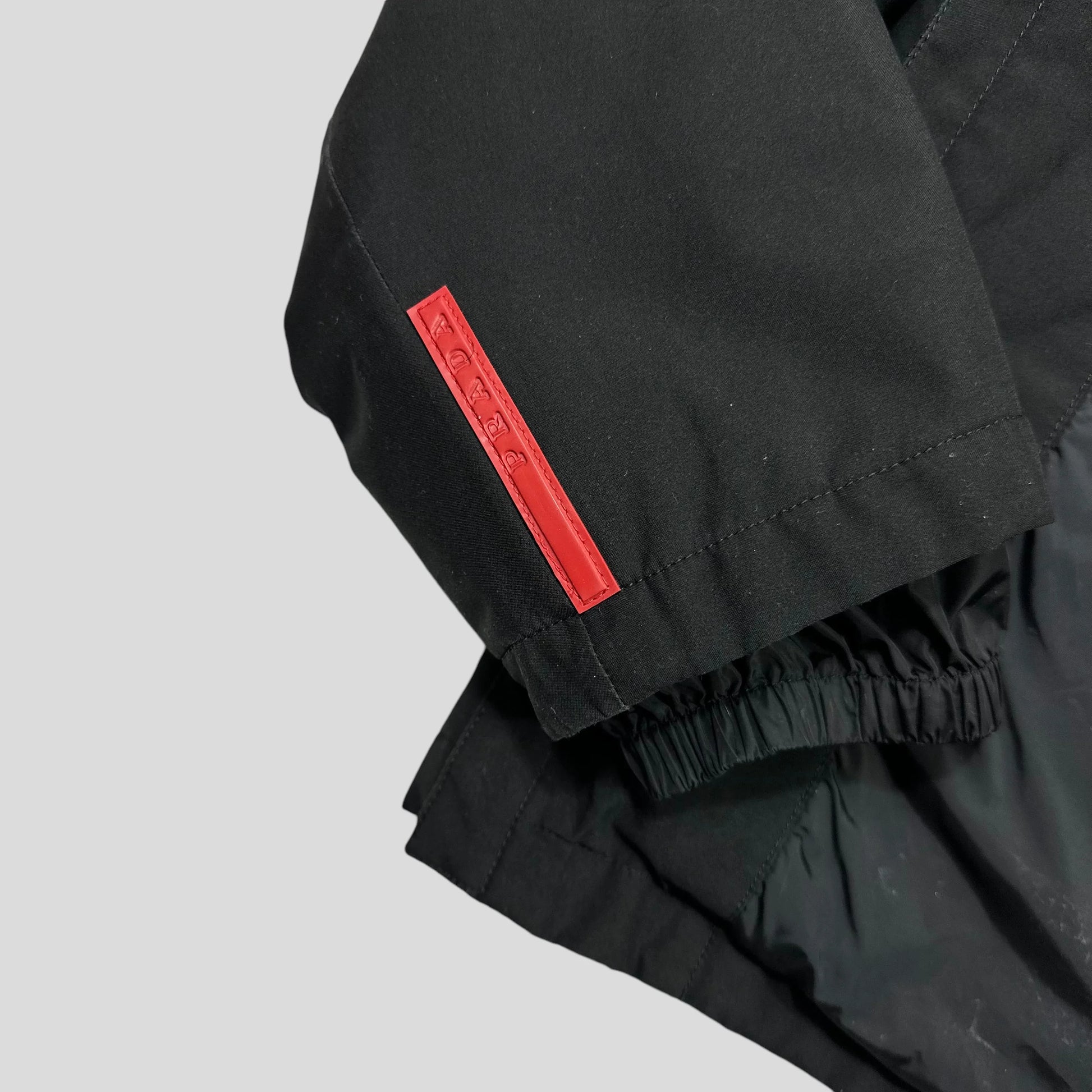 Very rare Prada Sport AW 2001 Goretex Jacket, nero black outer constructed from waterproof and wind proof Goretex filled with insulating polyester padding for warmth, windproof dual layer ski guards at wrist, red prada sport tab to cuff.