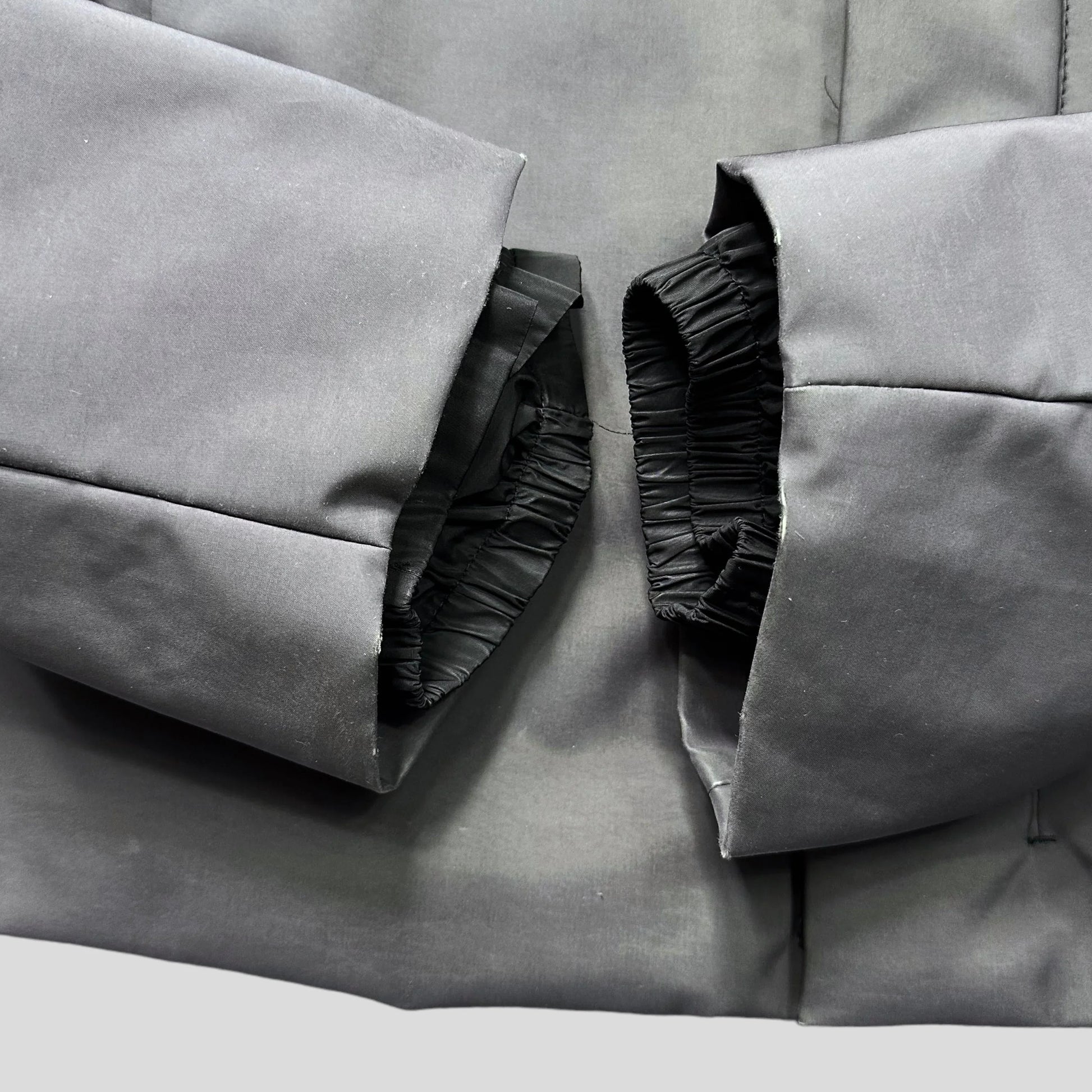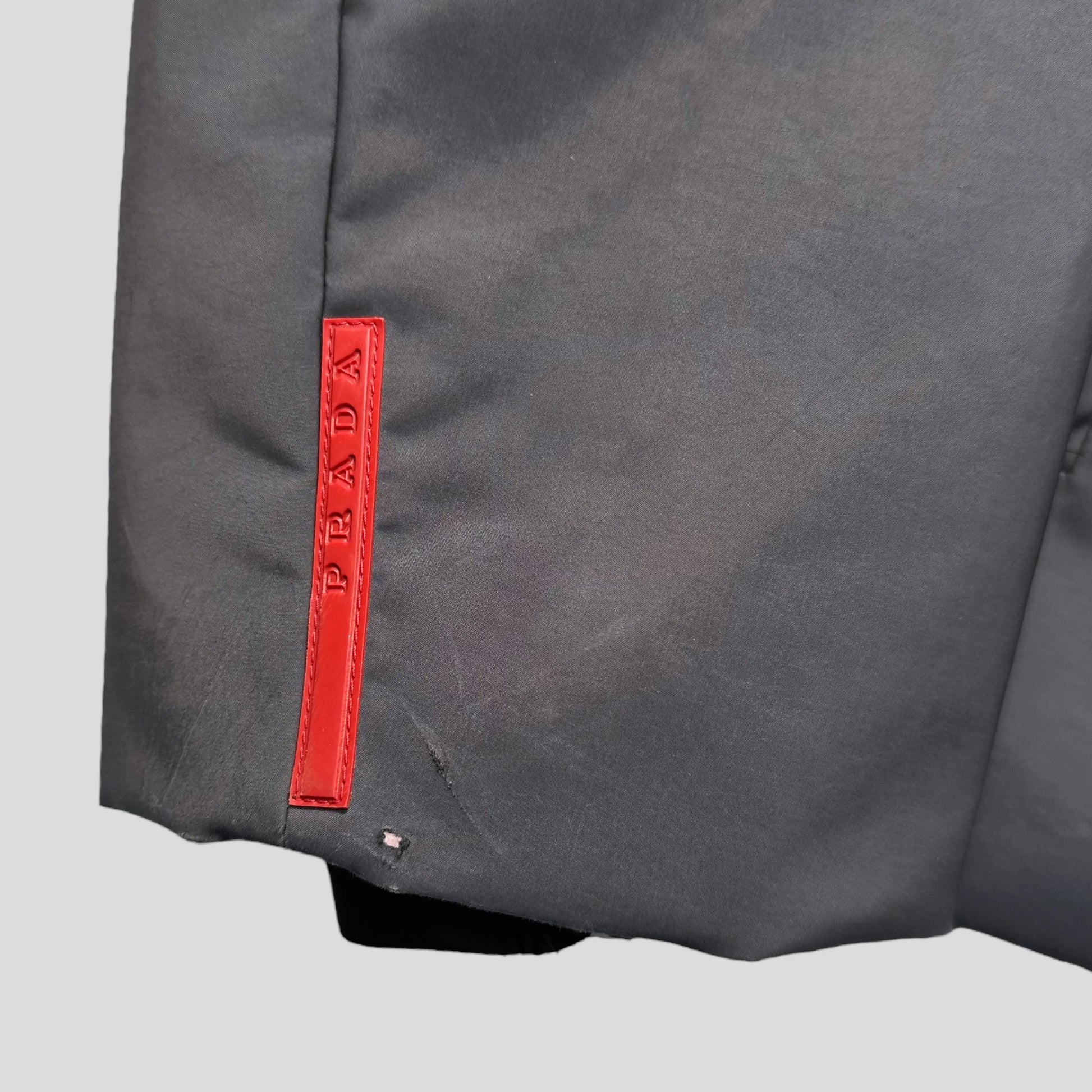 A unique piece from the Prada Sport AW99 collection, influenced by life jackets with clipped crotch straps to stop your jacket riding up while on the slopes. Extendable carabiner clip, removable nylon hood, the jacket is constructed from a grey reinforced padded poly mix that feels bombproof and shimmers in the sun.