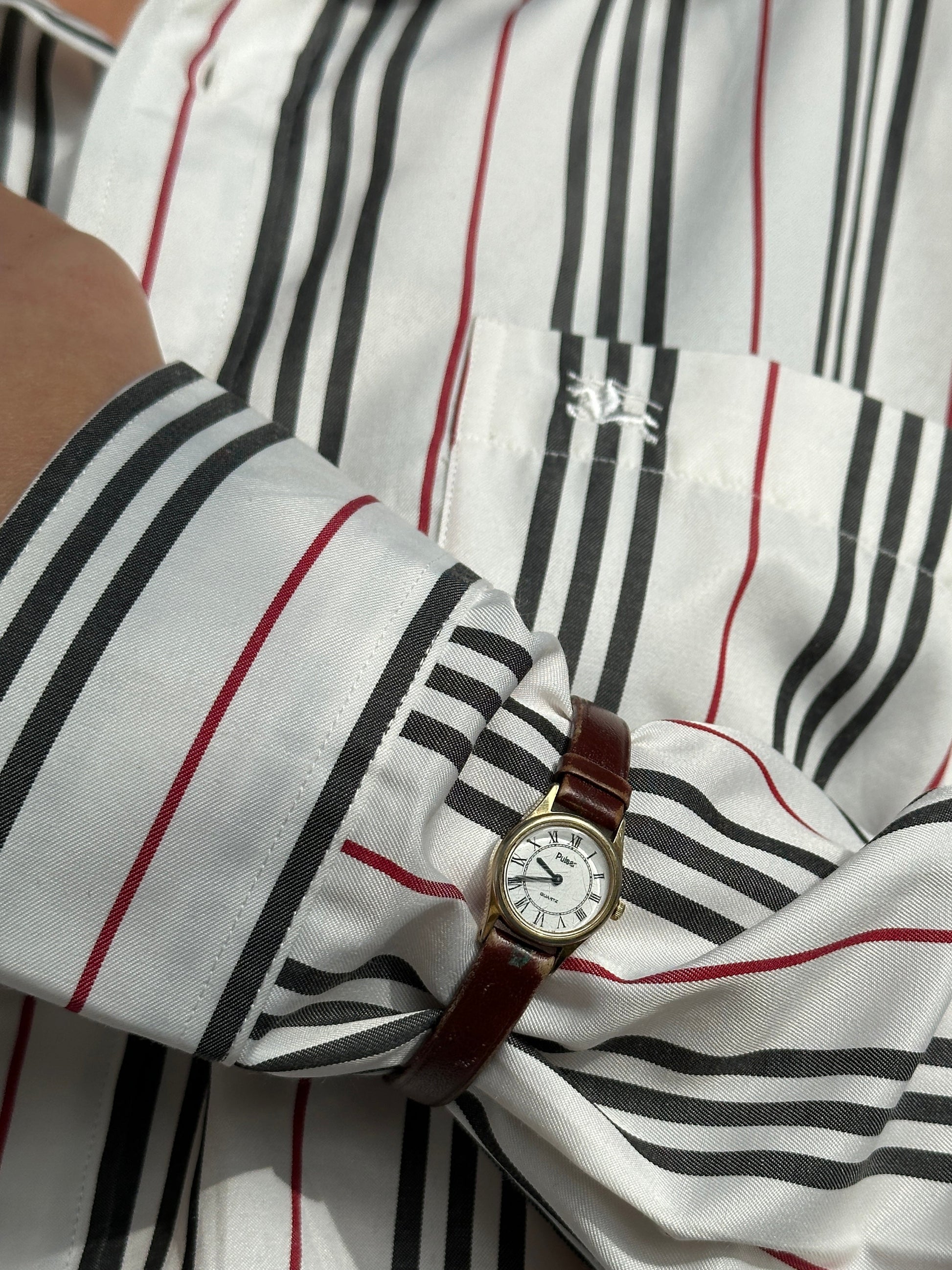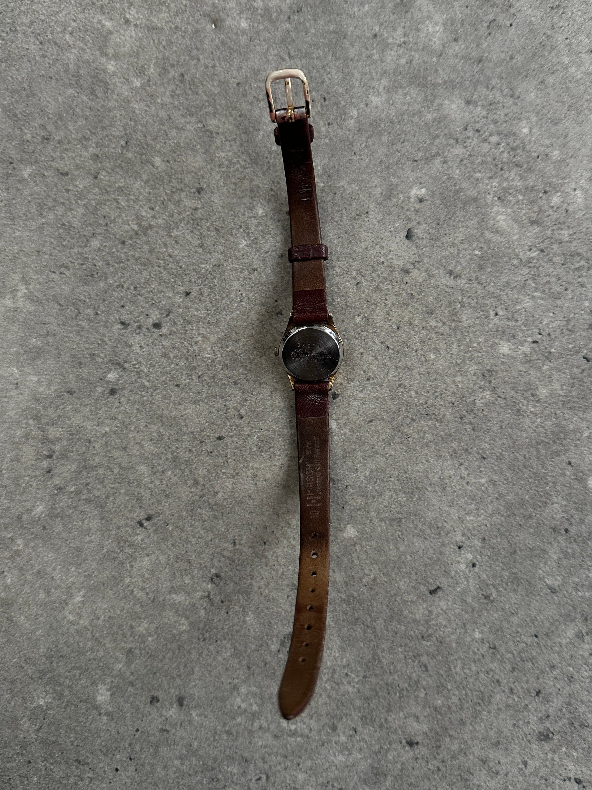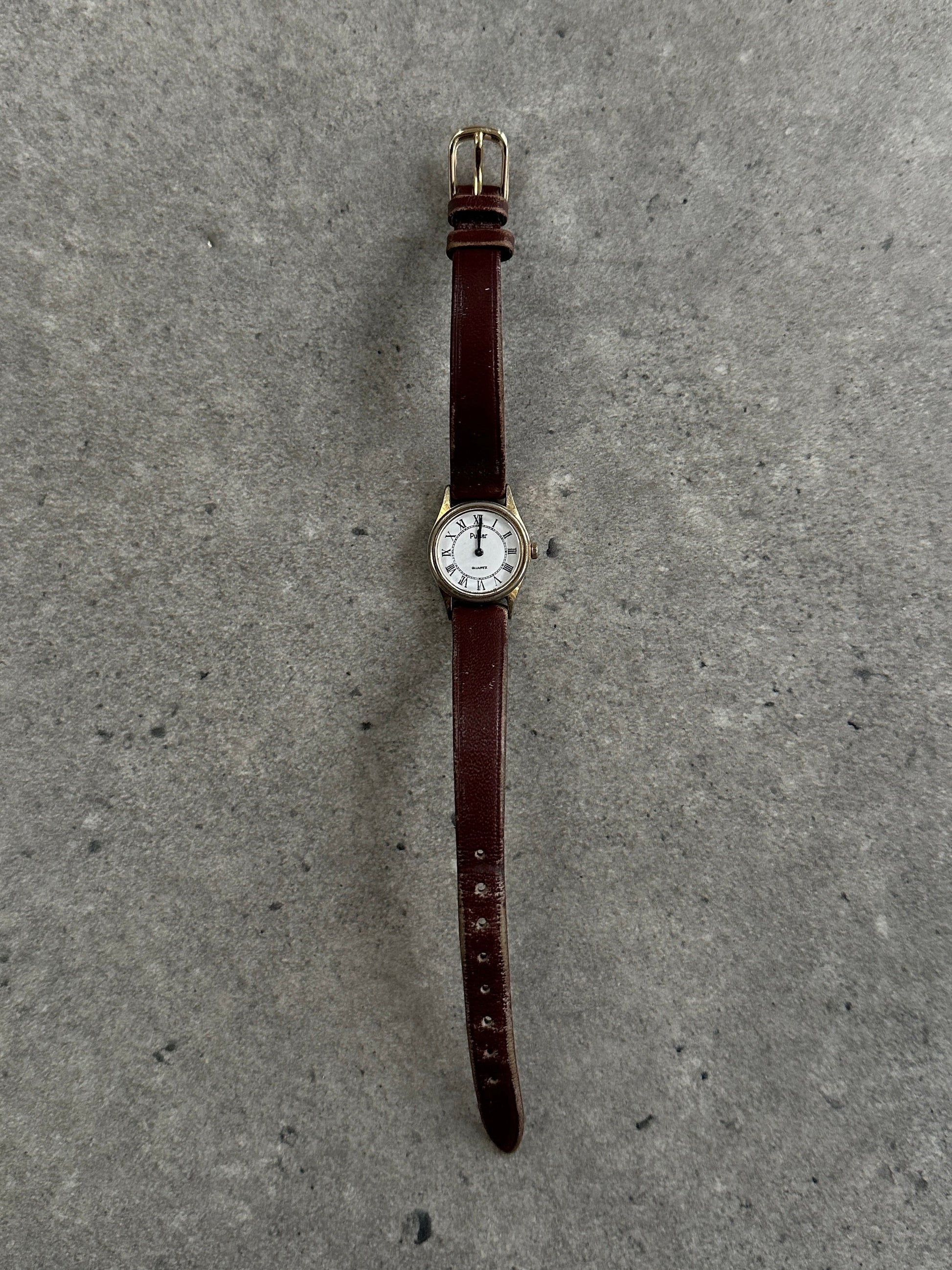 Vintage 1990s Pulsar gold tone quartz watch featuring Roman numeral dial, slim case design and genuine German leather strap.