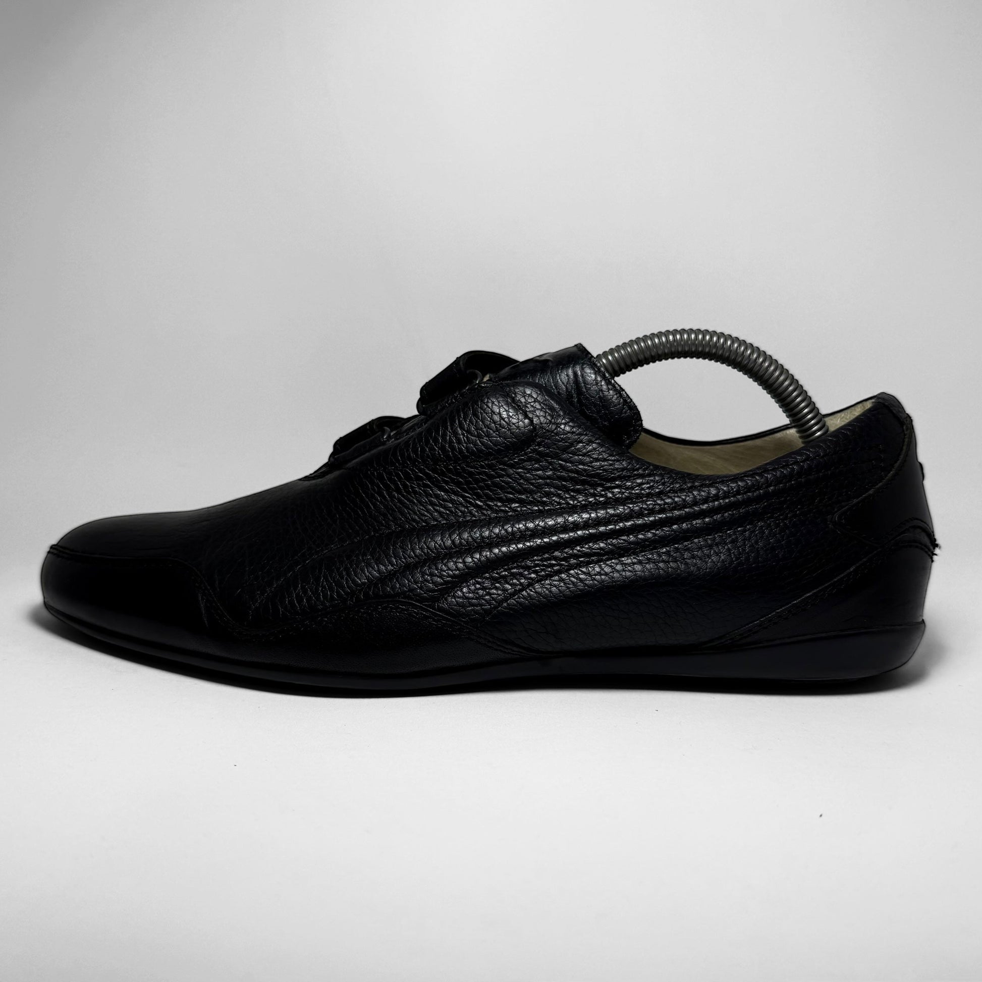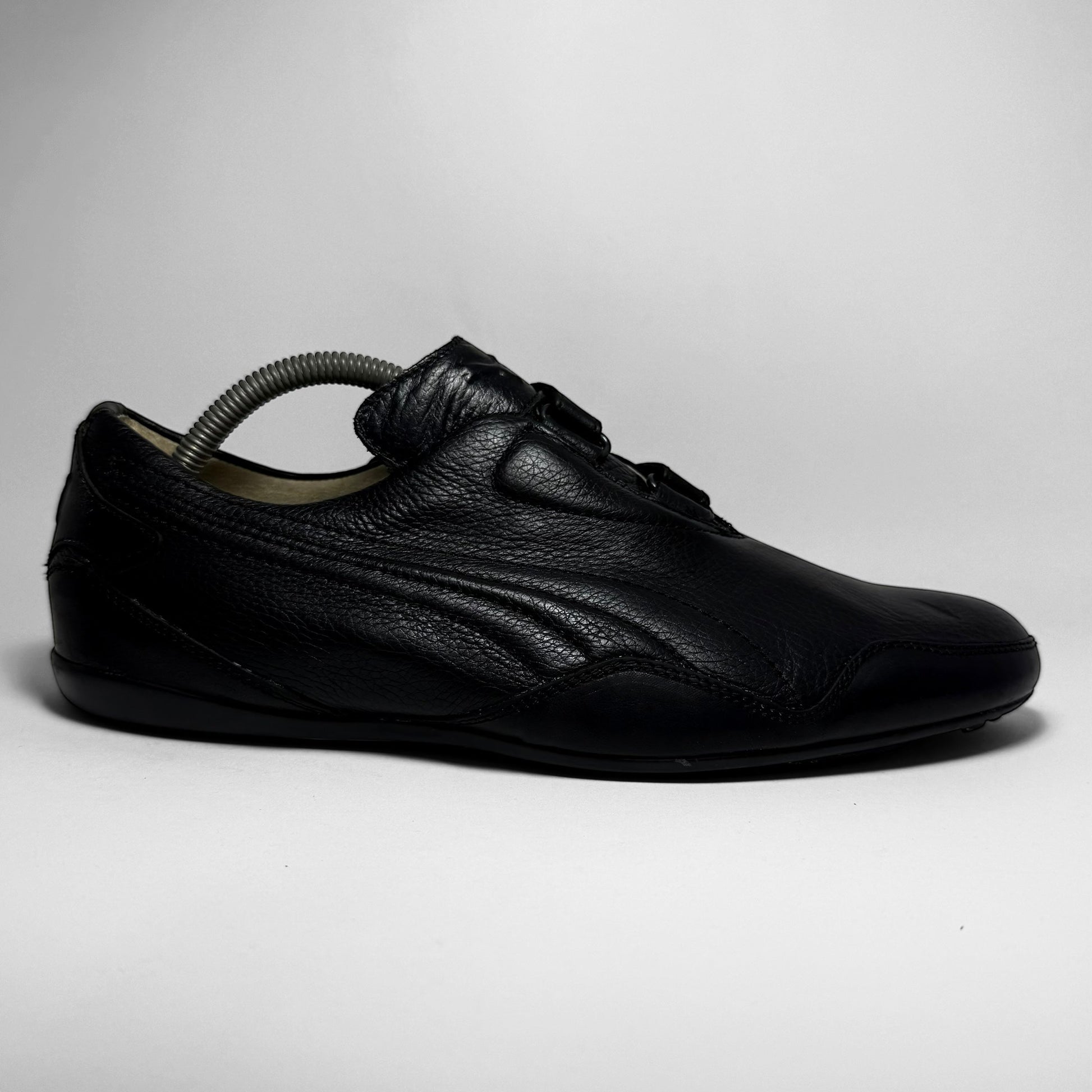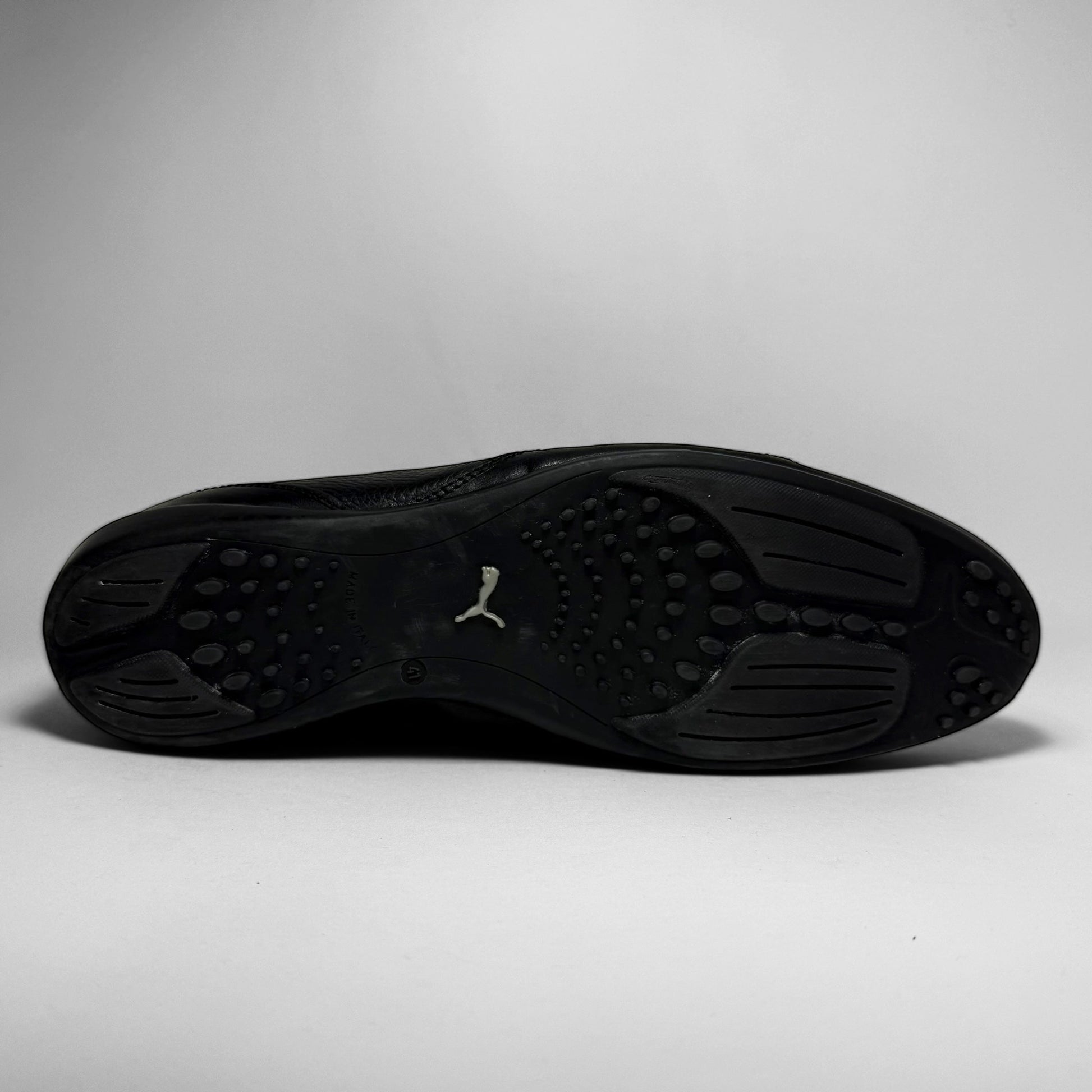 This sleek all-black Puma is a rare 2008 iteration of the Mostro, crafted from premium pebbled leather. The minimalist silhouette features the model’s signature asymmetrical velcro closure and a low-profile outsole with dotted traction. Subtle Puma form-strip embossing and logo details on the heel and sole.