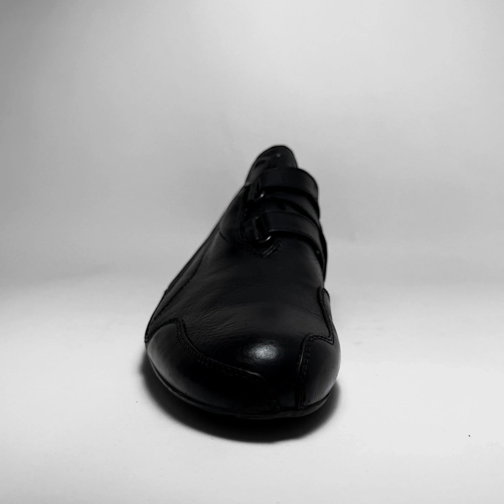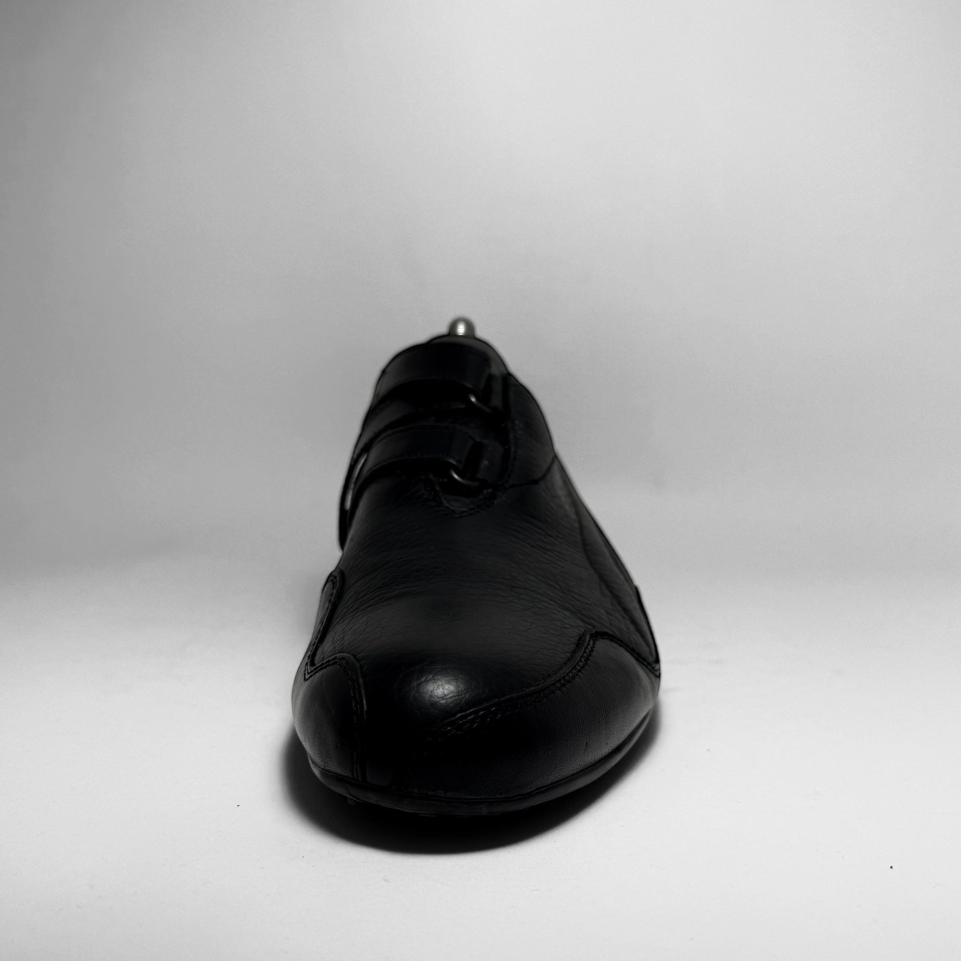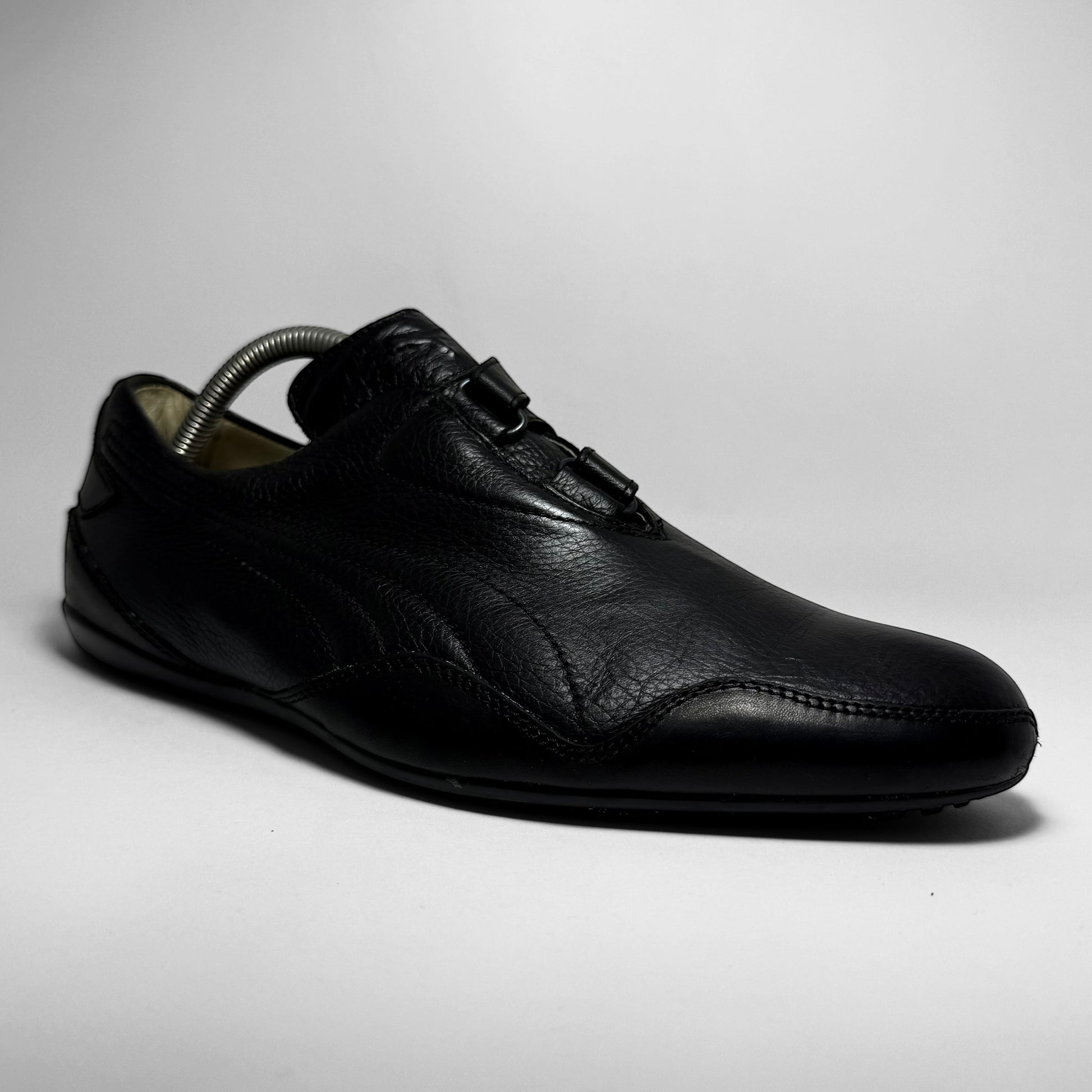 This sleek all-black Puma is a rare 2008 iteration of the Mostro, crafted from premium pebbled leather. The minimalist silhouette features the model’s signature asymmetrical velcro closure and a low-profile outsole with dotted traction. Subtle Puma form-strip embossing and logo details on the heel and sole.