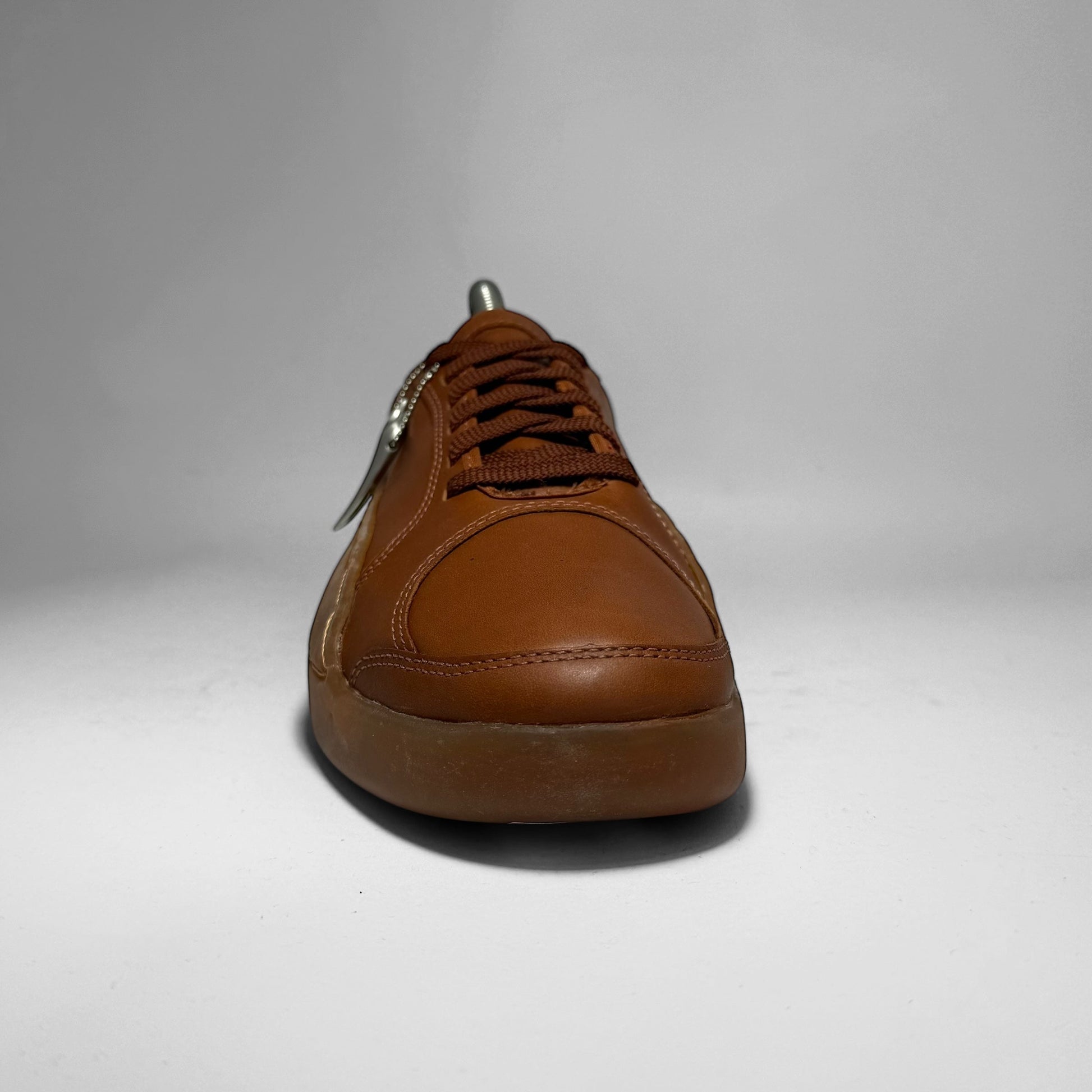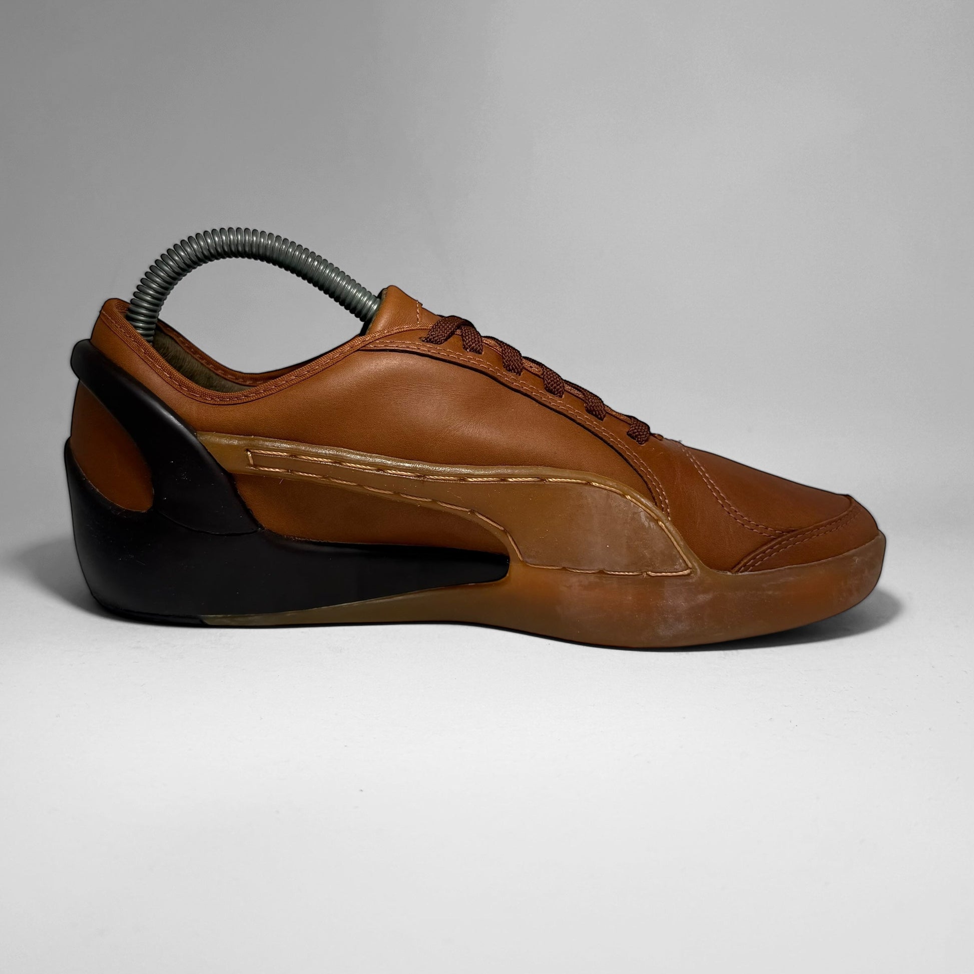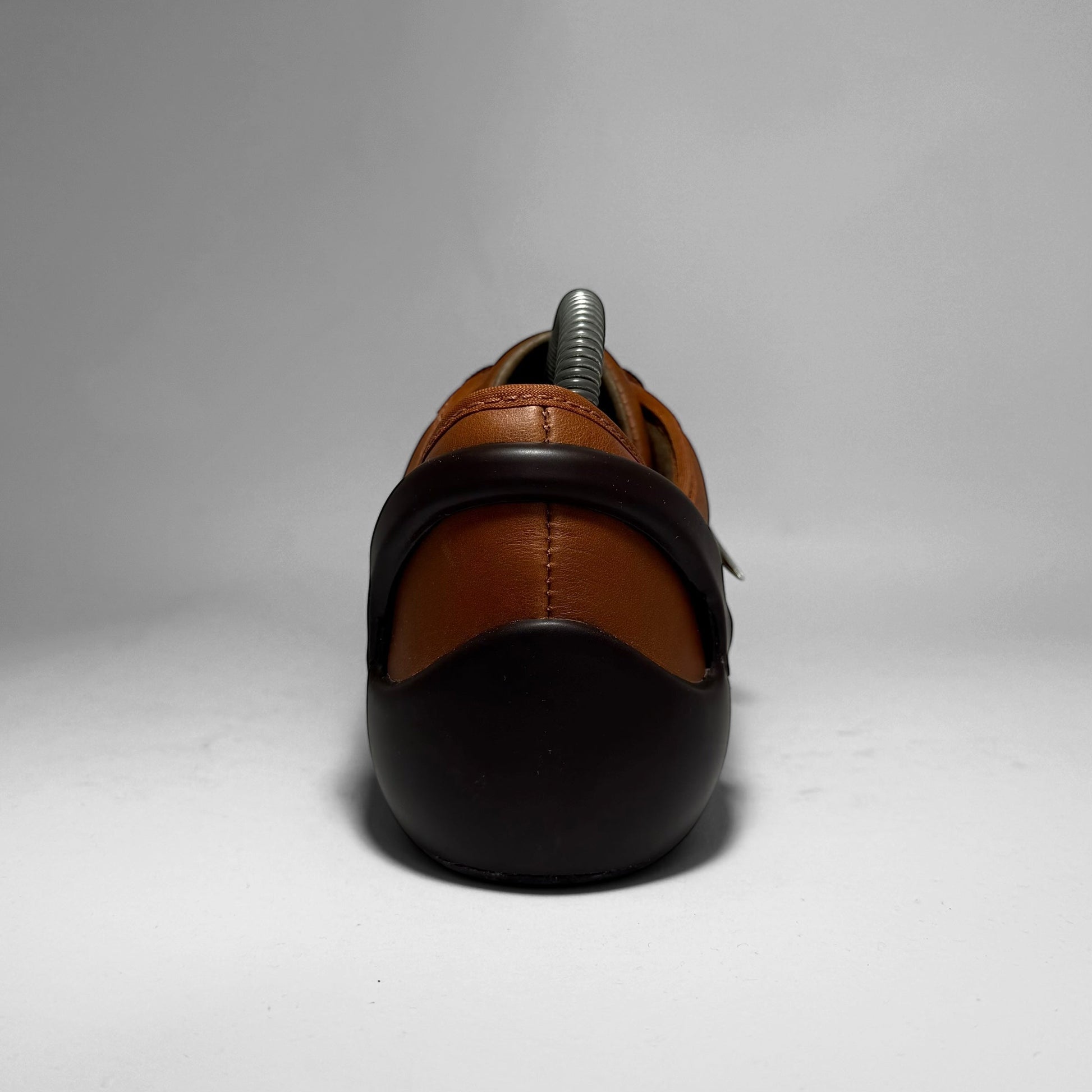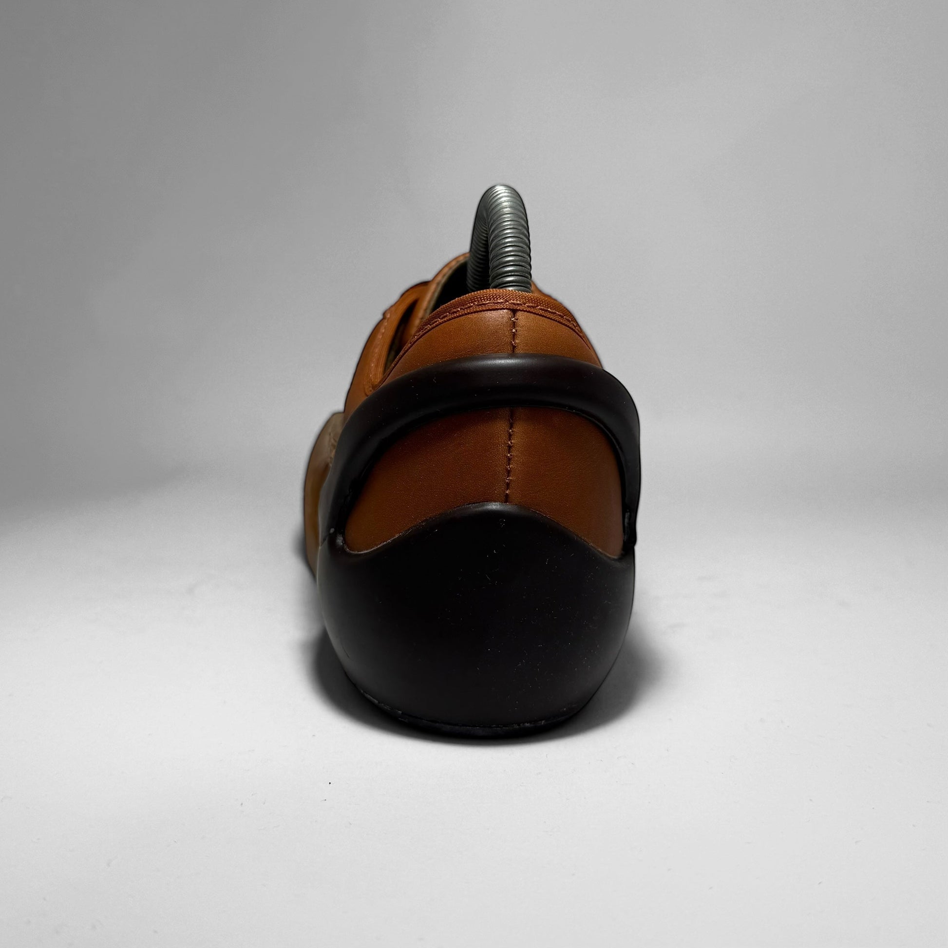 Premium leather upper in chestnut brown, tonal stitching, and a translucent gum sole. Asymmetric black TPU heel wrap and molded midfoot detailing. Shark tooth charm accent and minimal branding. Designed as a sculptural reinterpretation of the human foot.