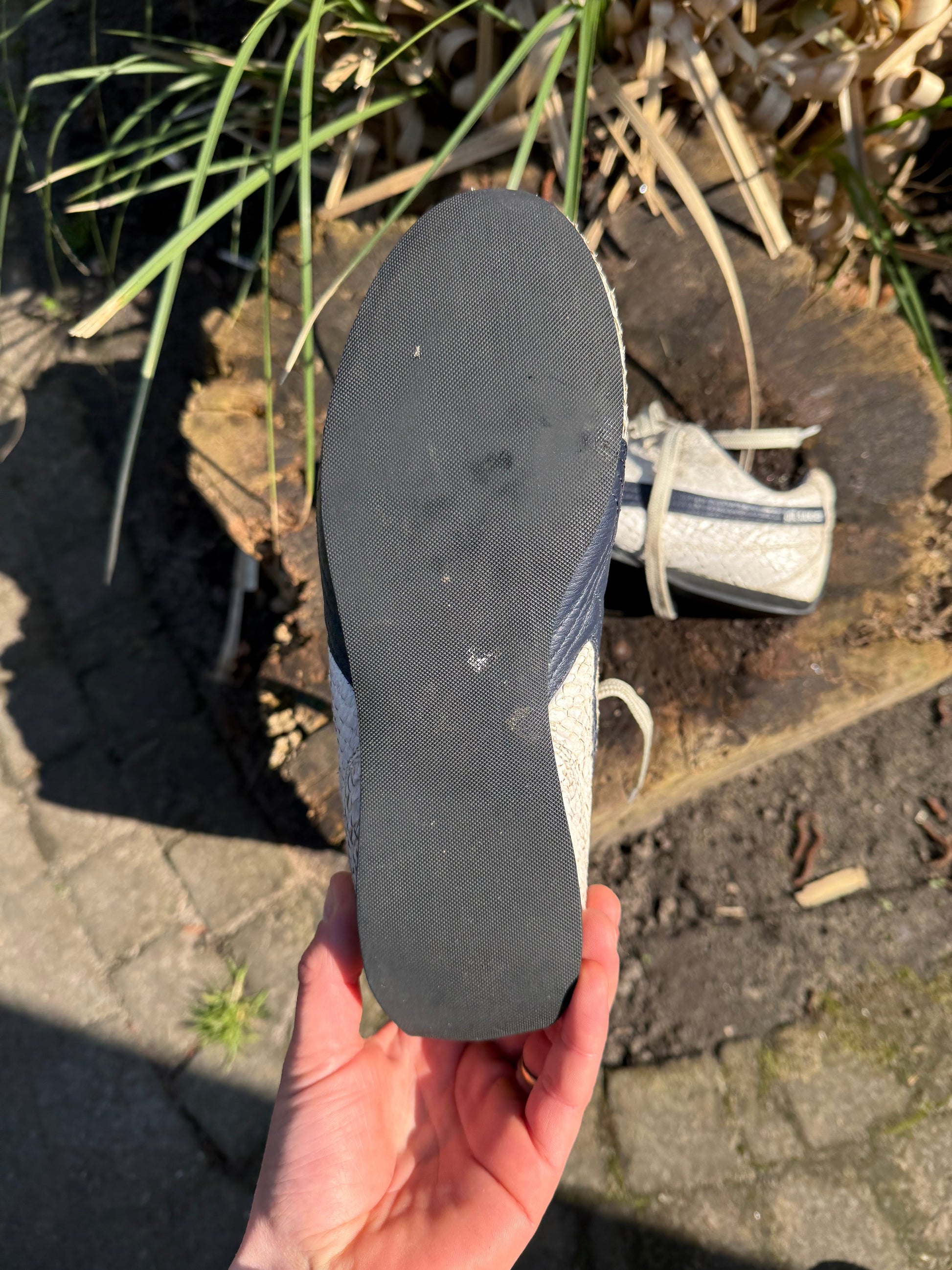 Low-top in cracked “snakeskin” leather, finished in off-white with navy Formstrip and lining. Minimalist silhouette with premium materials, showing heavy natural aging, patina and texture throughout.