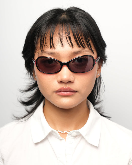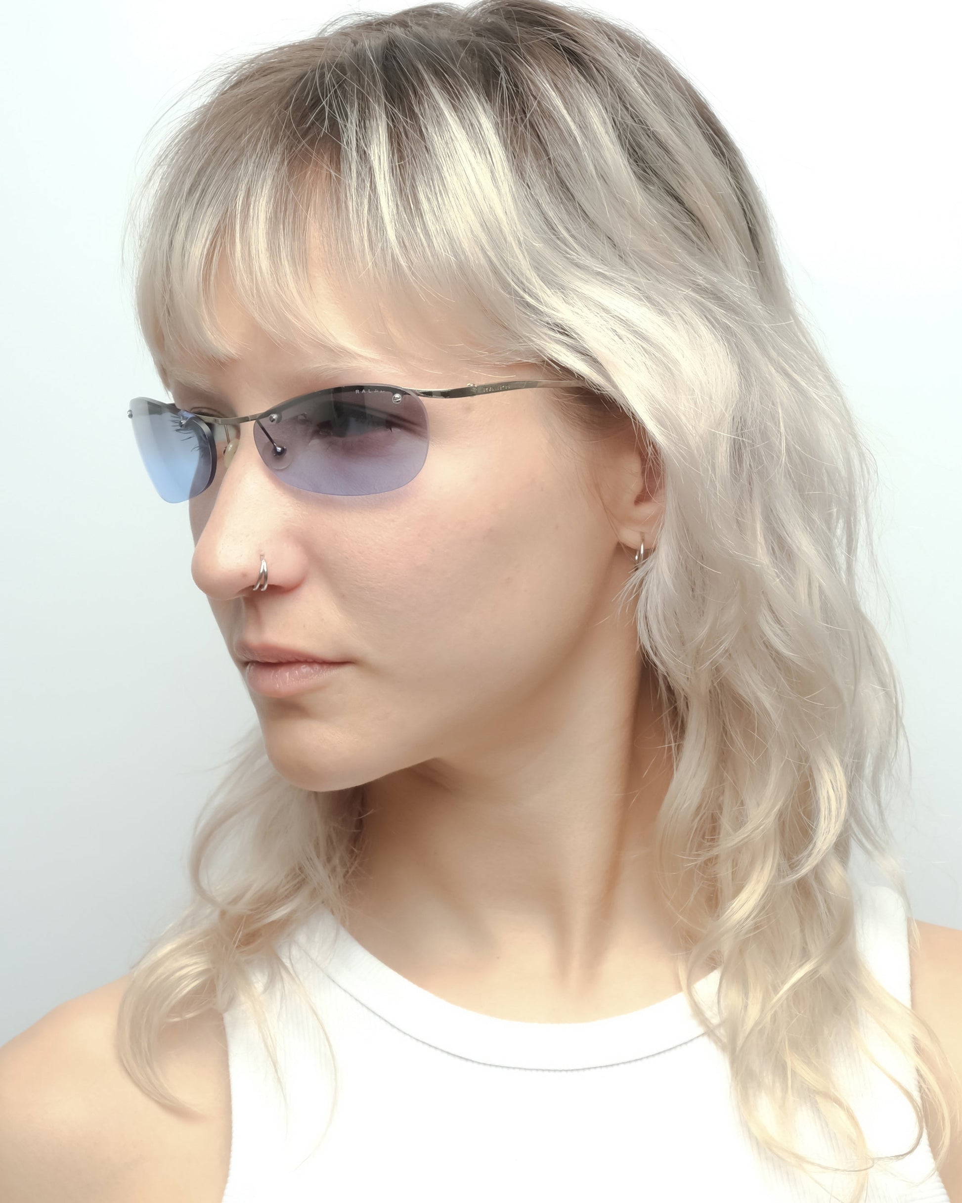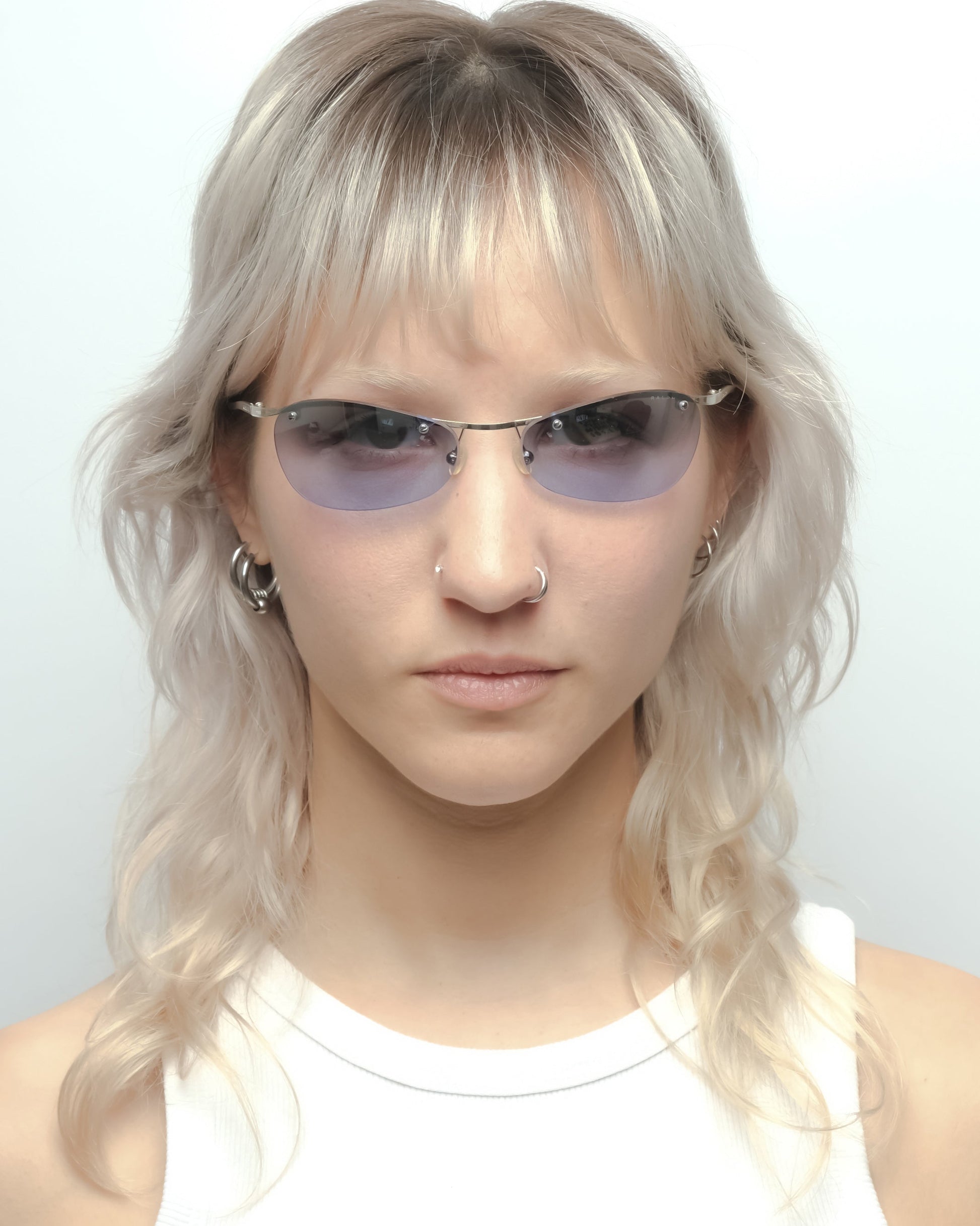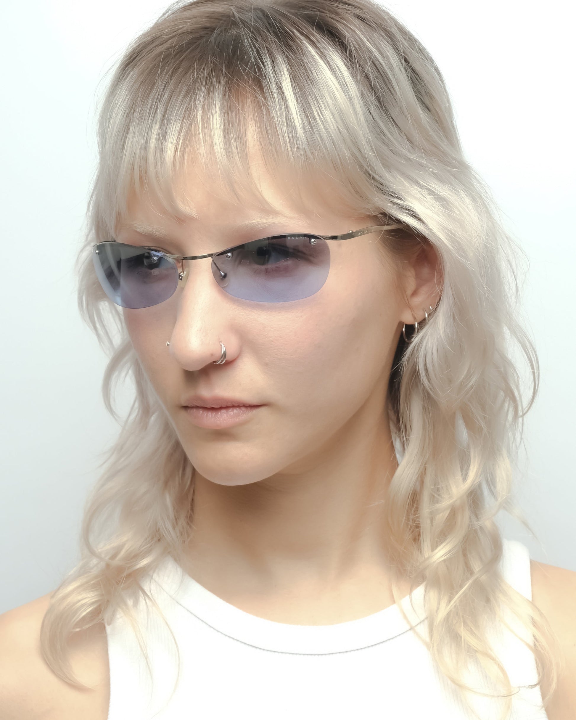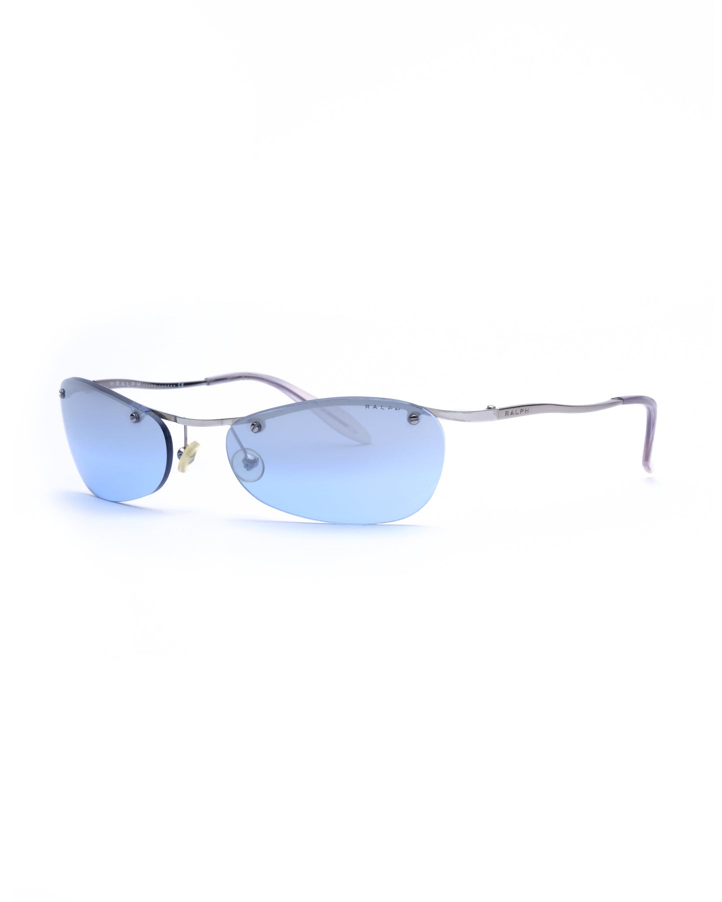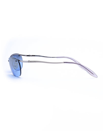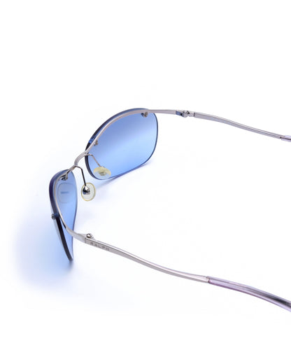 Silver half-frame with subtle curve, fitted with reflective gradient blue lenses and transparent lilac temple tips. Condition 7.5/10: Frame in very good condition, superficial wear on the lens surface but a small crack around the screw of the right lens. Doesn’t impact the structural integrity, not noticeable when worn. Comes with an unbranded soft sleeve.