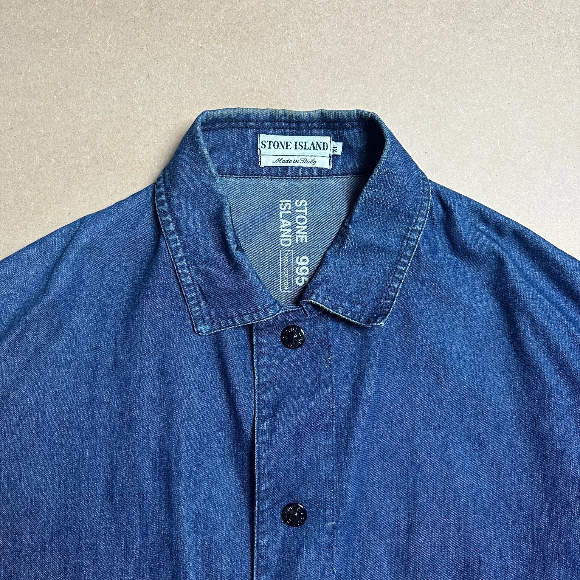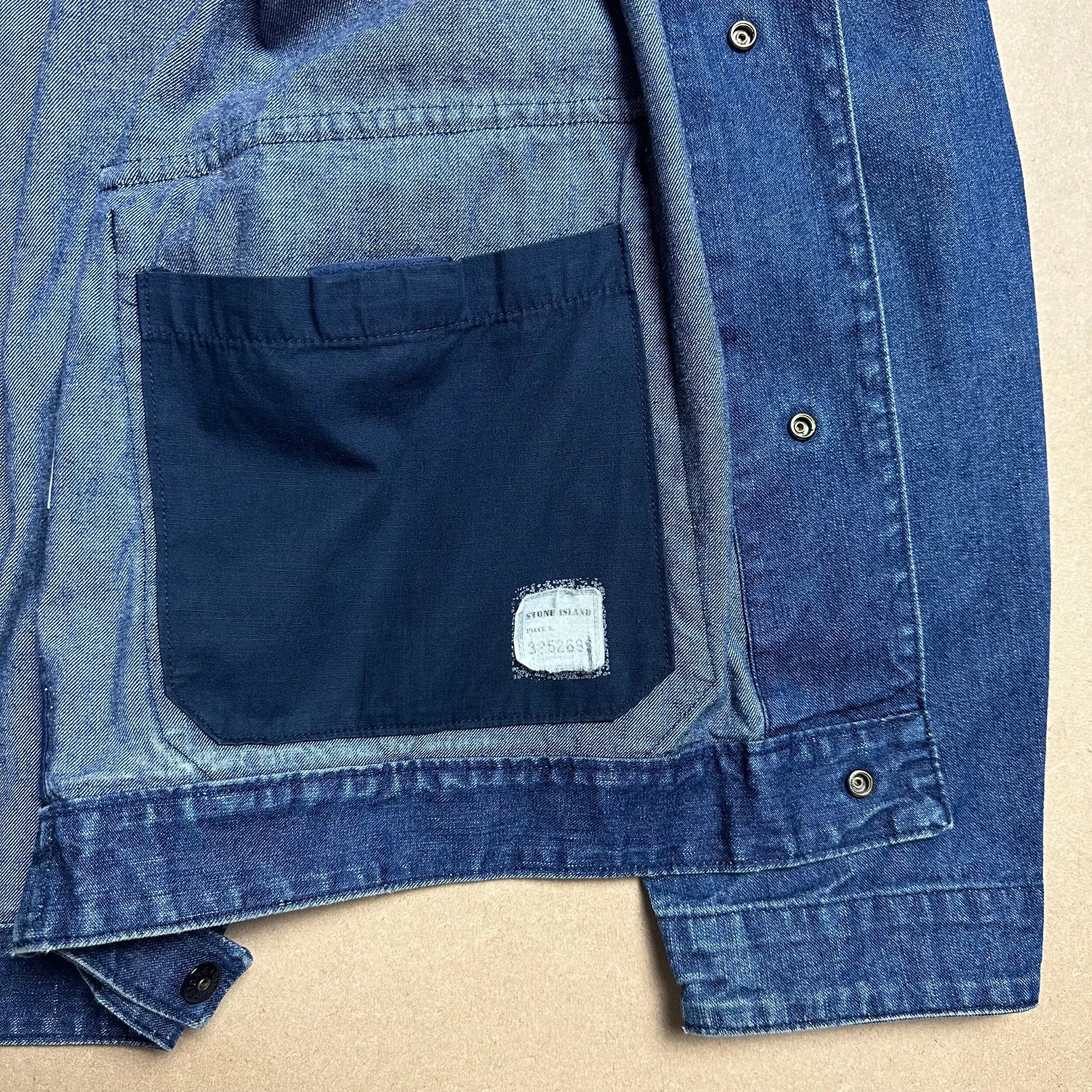 Designed by Massimo Osti in his final season at Stone Island. Selvedge denim blouson style work jacket features full embossed branded press studs throughout. Double patch pockets. Hem fastening adjustment flaps. Internal cotton work pockets for added storage space. Complete with green edge badge and internal dated branding.