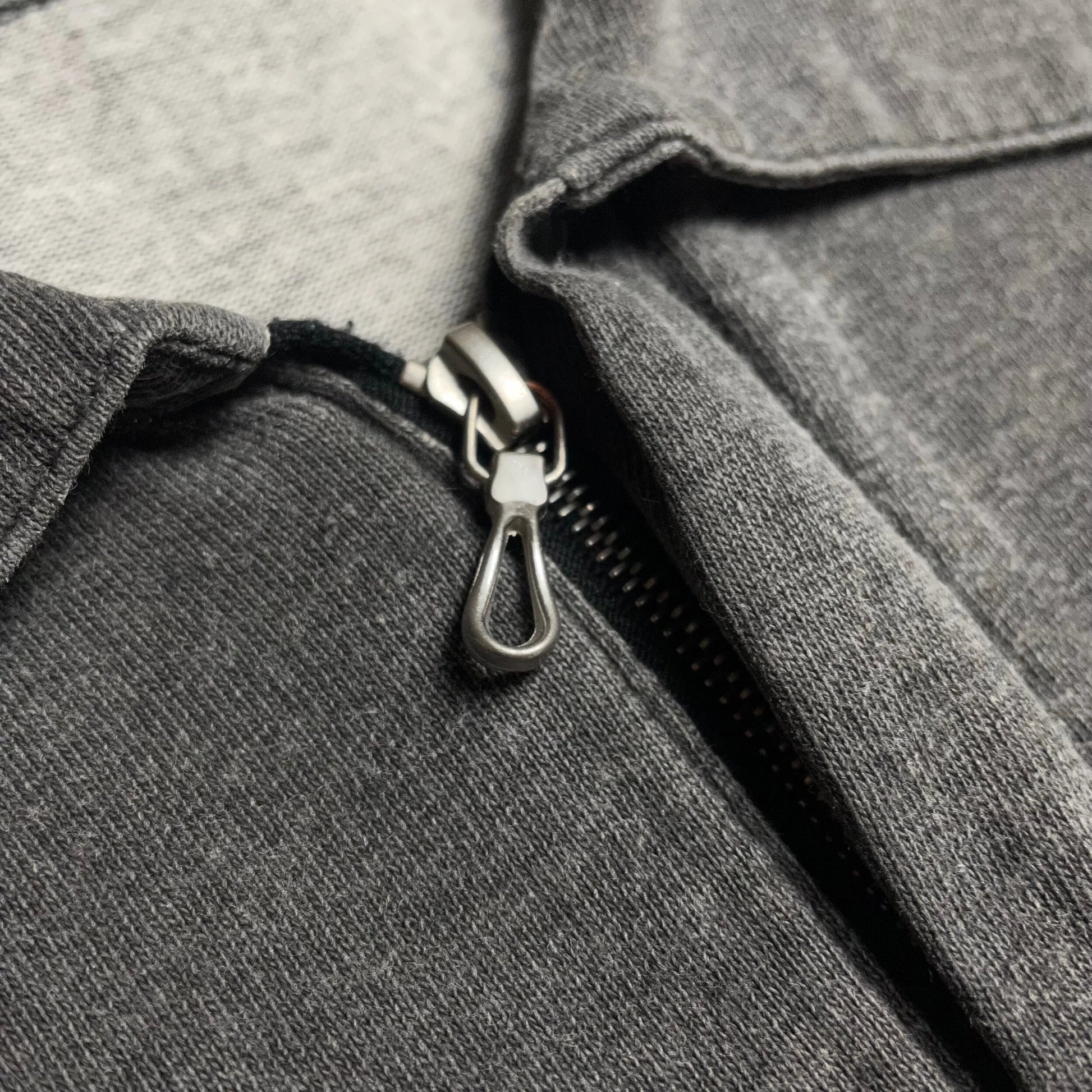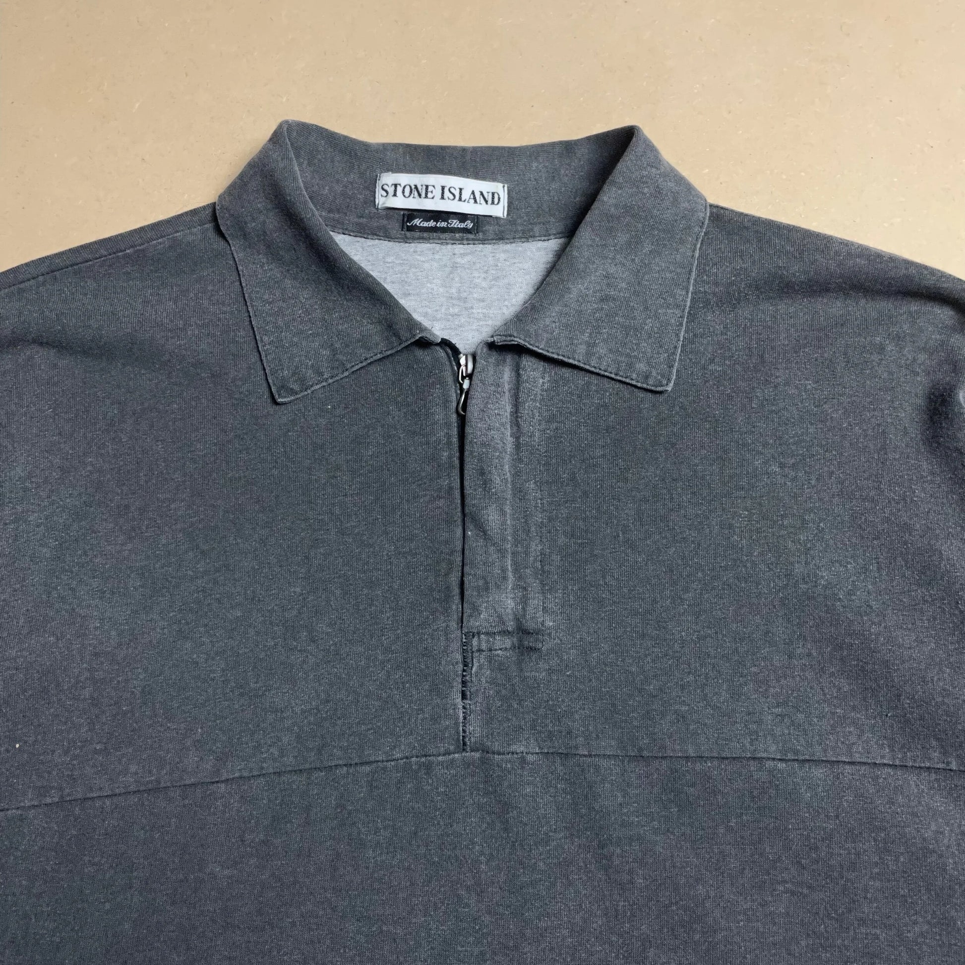 Designed by Paul Harvey. Charcoal washed wide spread collar polo shirt with tear drop zipper closure. Panelled construction complete with marina striping and a motion blur graphic compass logo spell out.