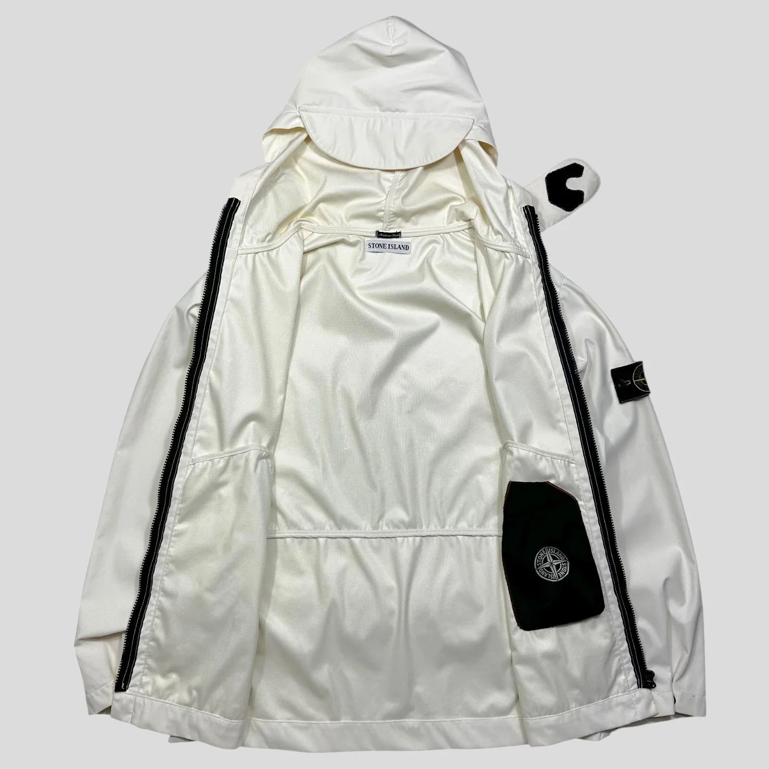 Extremely rare spring summer 1997 white Spalmatura nylon stone island jacket, material is very tough and durable yet soft on the skin, looks great in natural light, unique mask / riot peaked hood, button adjustable cuffs, zip hand pockets, inside pouch pocket, green edge badge to arm.