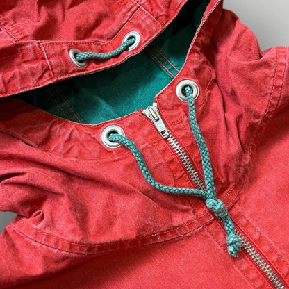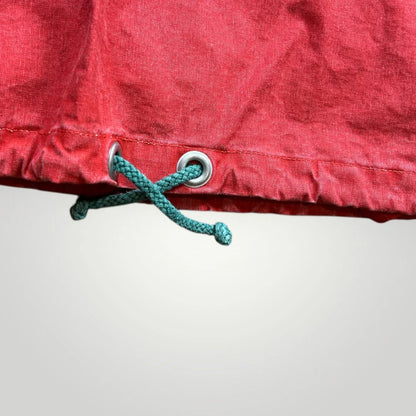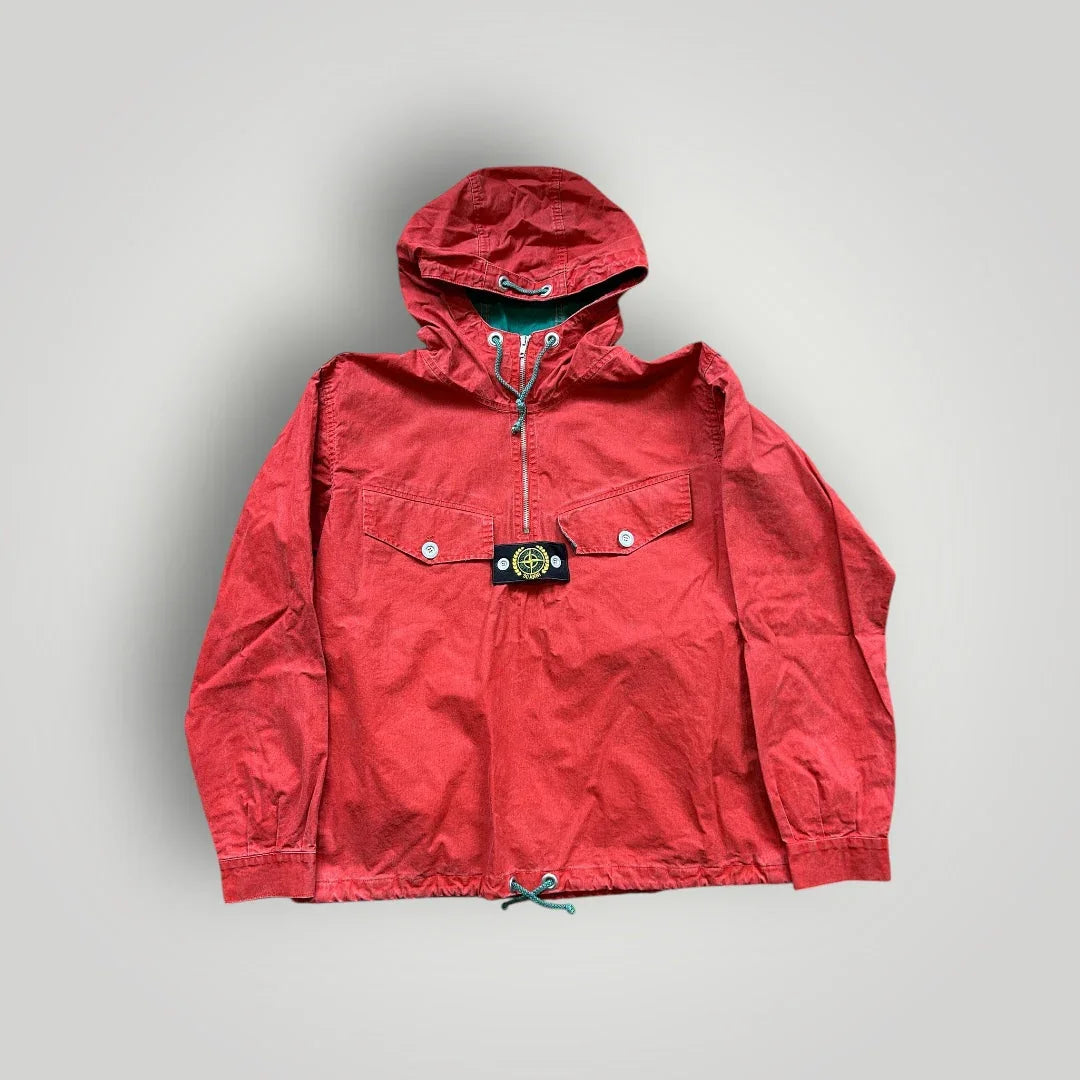 This garment is an exact re-edition of a piece from the first collection in 1982, created in a faithful replica of Tela Stella, the fabric on which Stone Island was founded. Tela Stella was born out of the study of the technical and functional characteristics of military truck tarpaulins. It is a cotton canvas impregnated on both sides with special pigmented resin in contrasting colours. The finished garment then undergoes an extended enzyme wash in order to give it a faded look and to break down the density of the material. The result is a windproof garment that has an air of old oilskins corroded by the sea, which, at the same time, has a marked military feel.