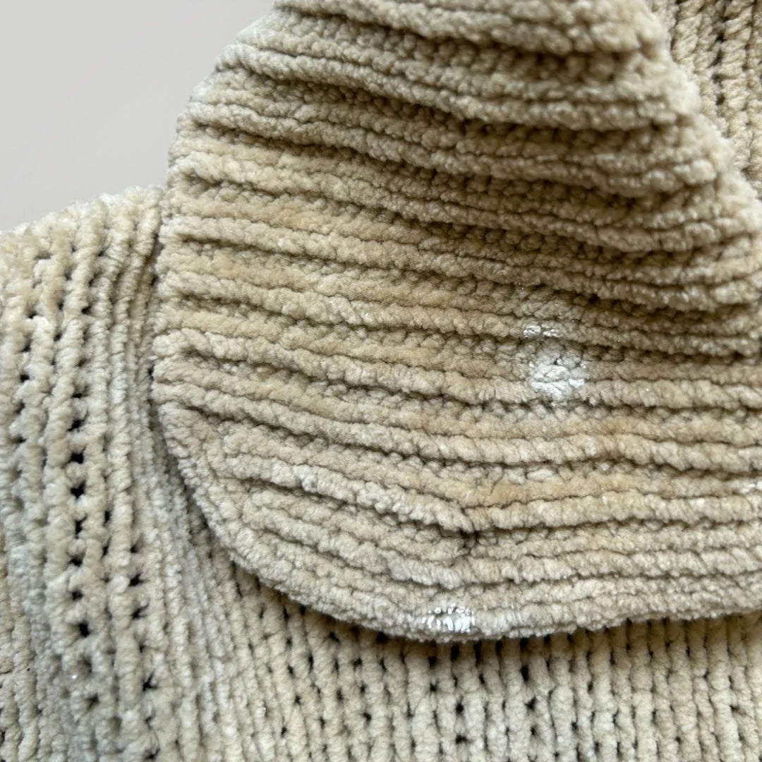 • Condition is okay all round with a mark to the collar and small mark to the arm, as shown in the pictures. The chenille material is naturally fragile and tends to pull in places. This has happened to the left pit, also as shown.