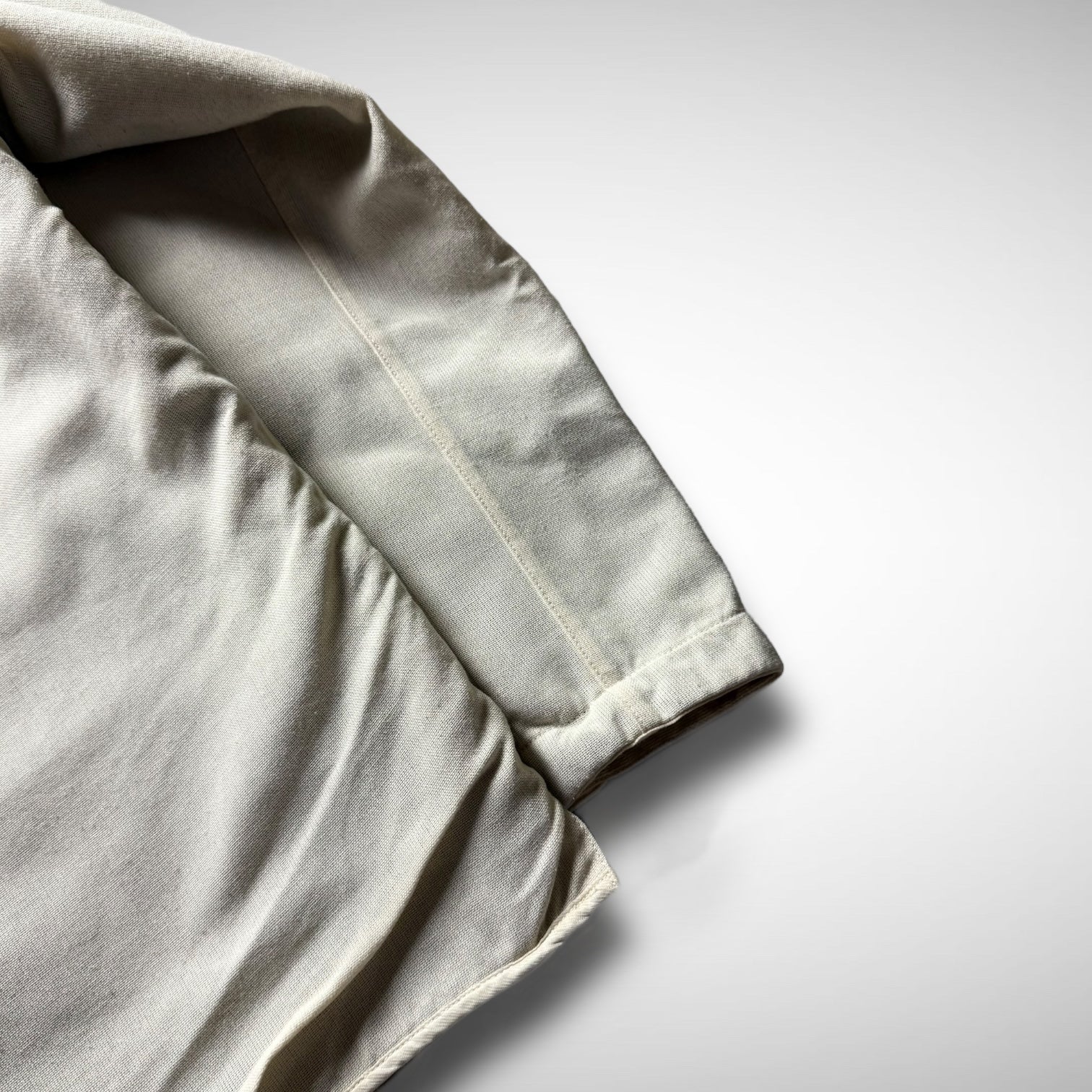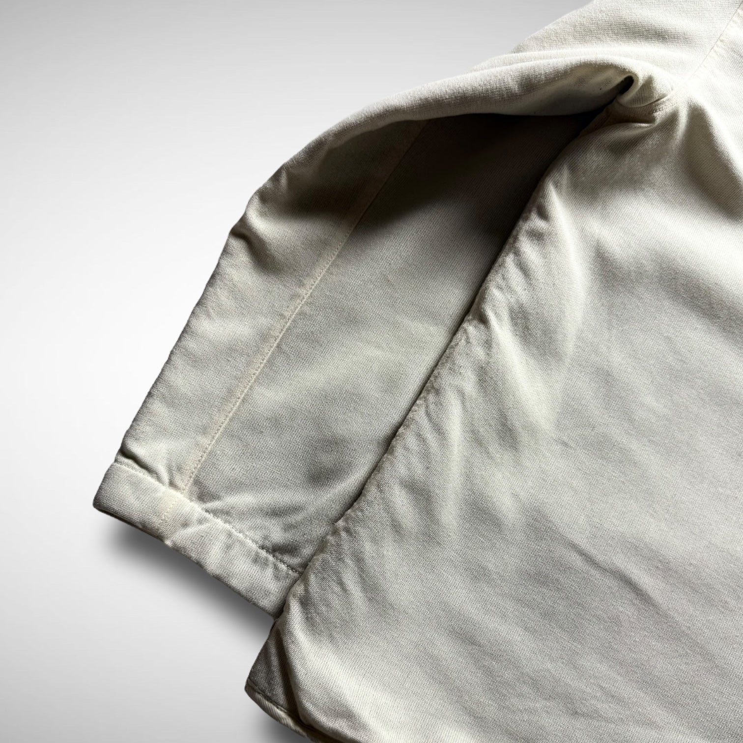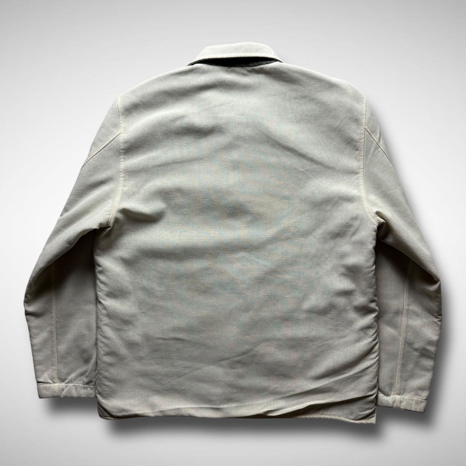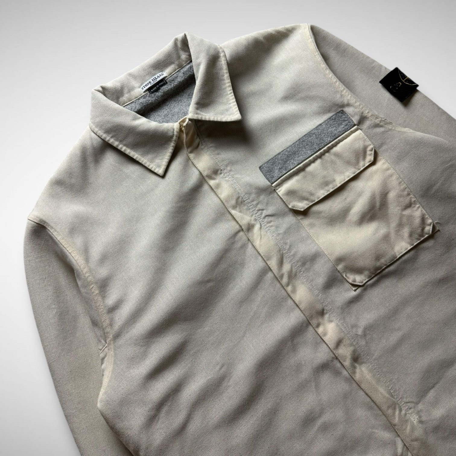 Constructed in a cream cotton outer with a grey felt wool lining, it features a concealed zip front, chest pocket with felt flap, and the signature compass patch on the sleeve.