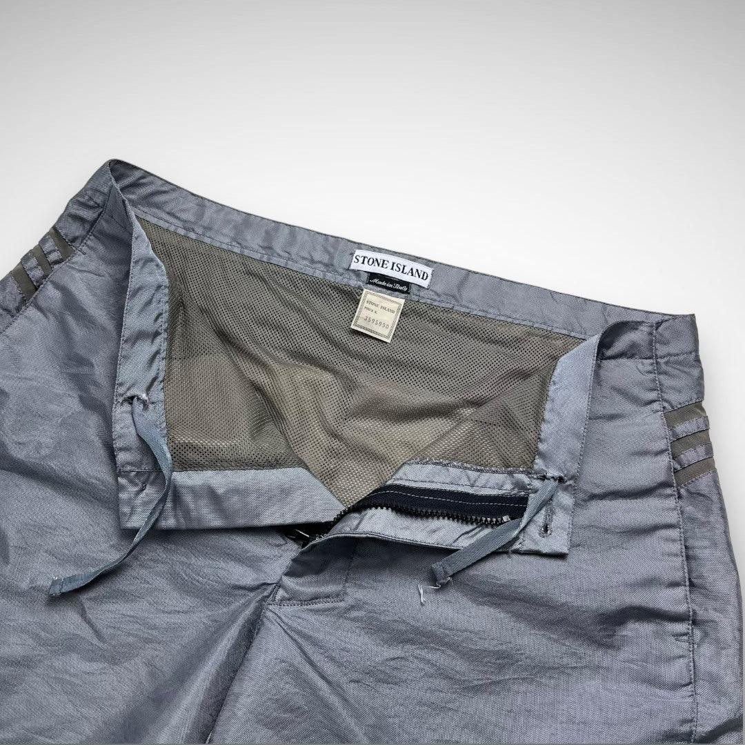 These Stone Island Marina swim shorts feature a lightweight, quick-drying grey fabric with a subtle iridescent texture. The design includes tonal side stripes, a mesh lining, and the “Stone Island Marina” logo printed on the front leg.