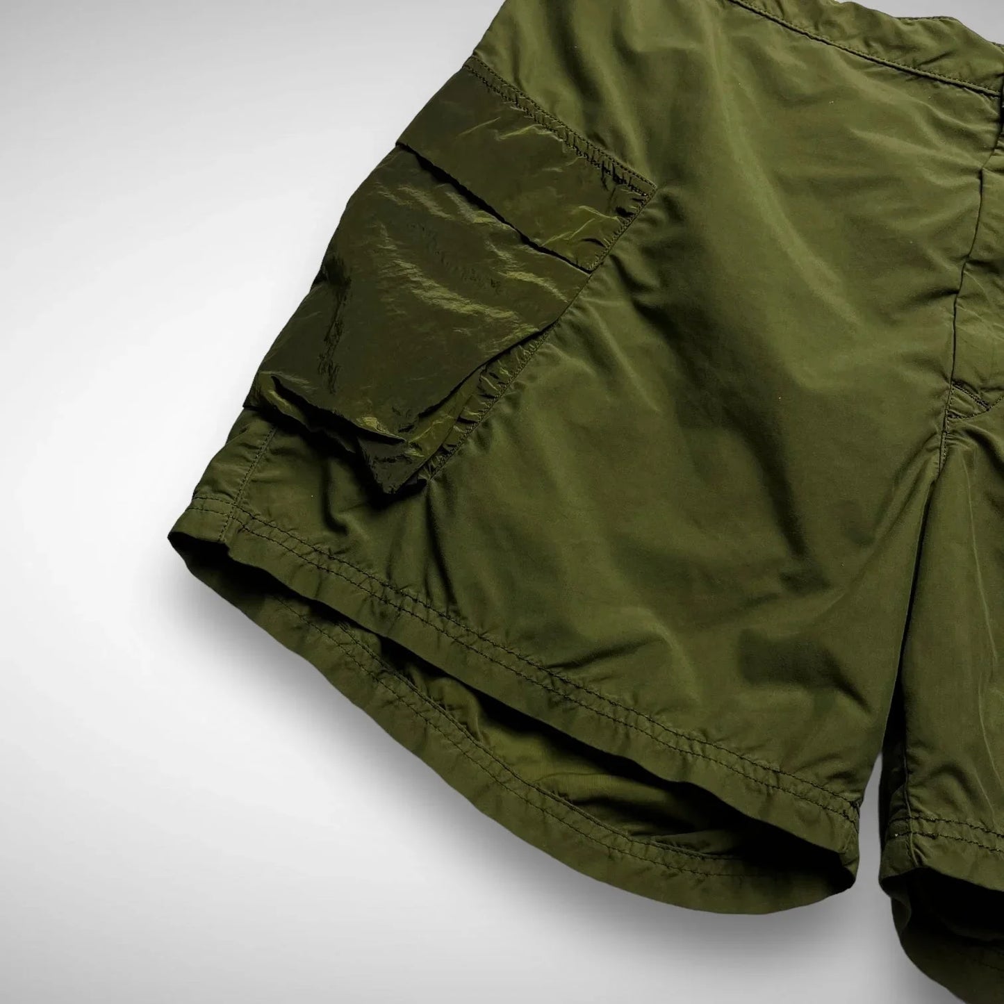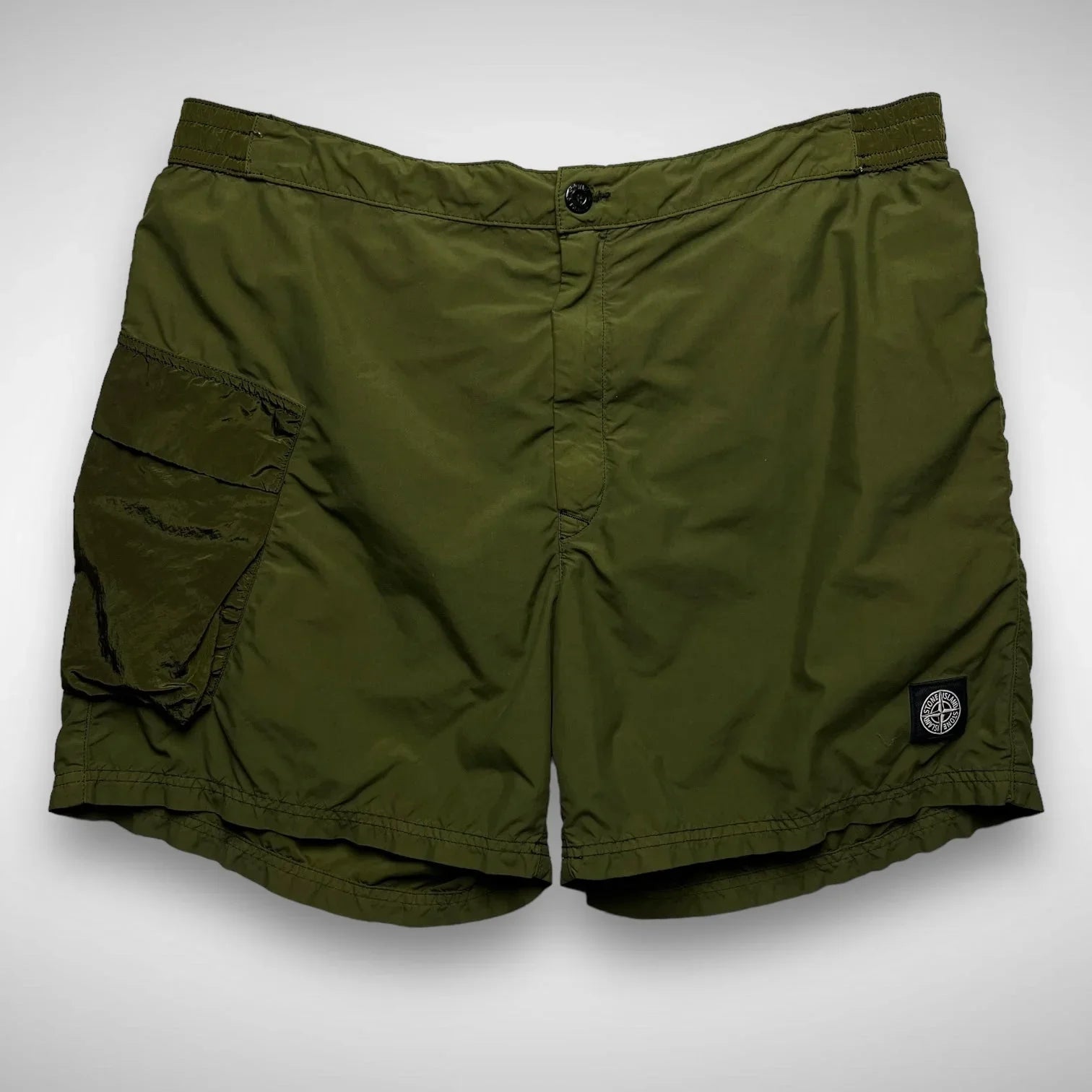 These Stone Island swimming shorts from the late 2010s/early 2020s are crafted from a lightweight olive green nylon with a subtle sheen. They feature a relaxed fit, a flap cargo pocket on the side, and the signature compass logo patch on the leg.