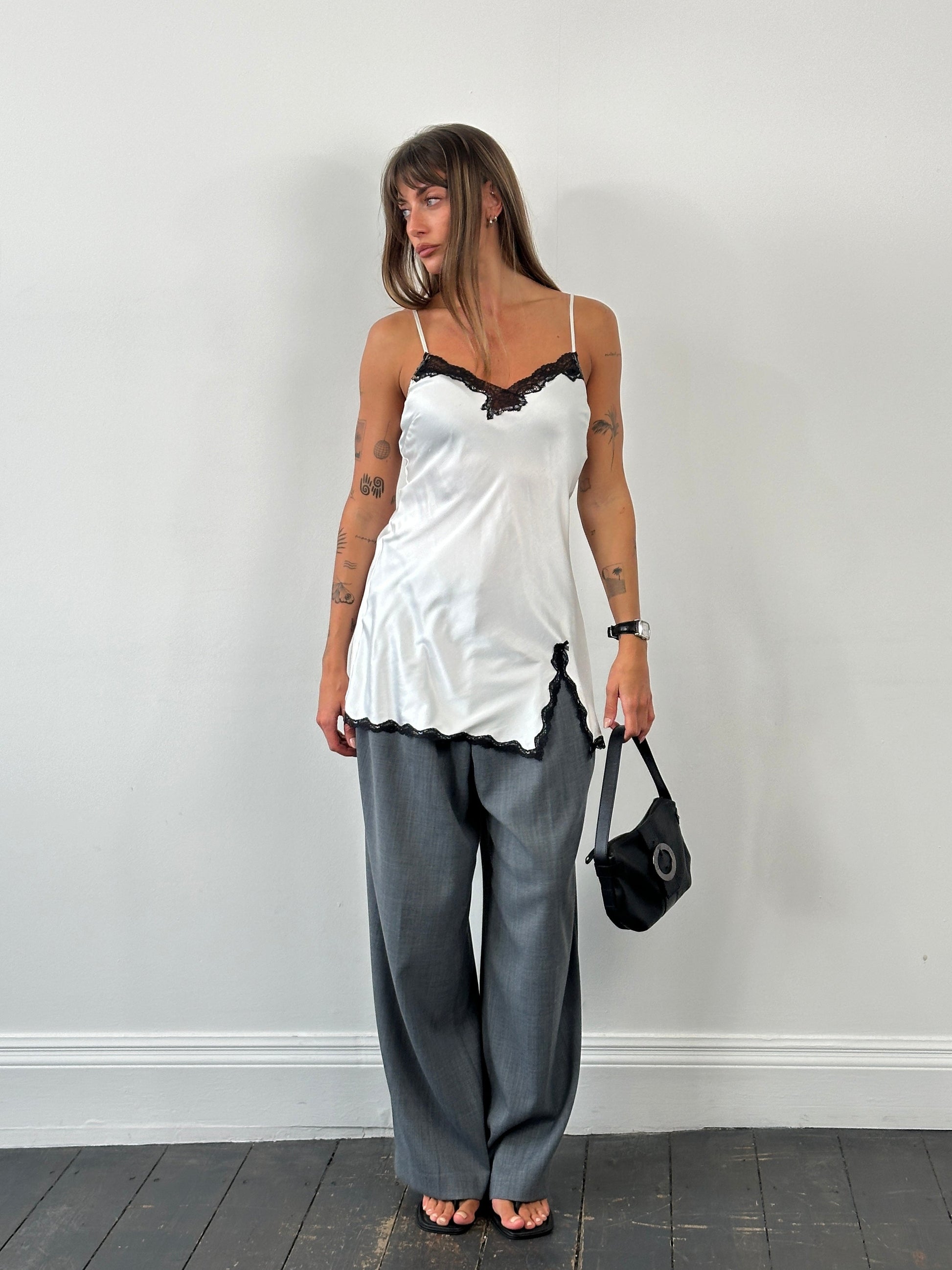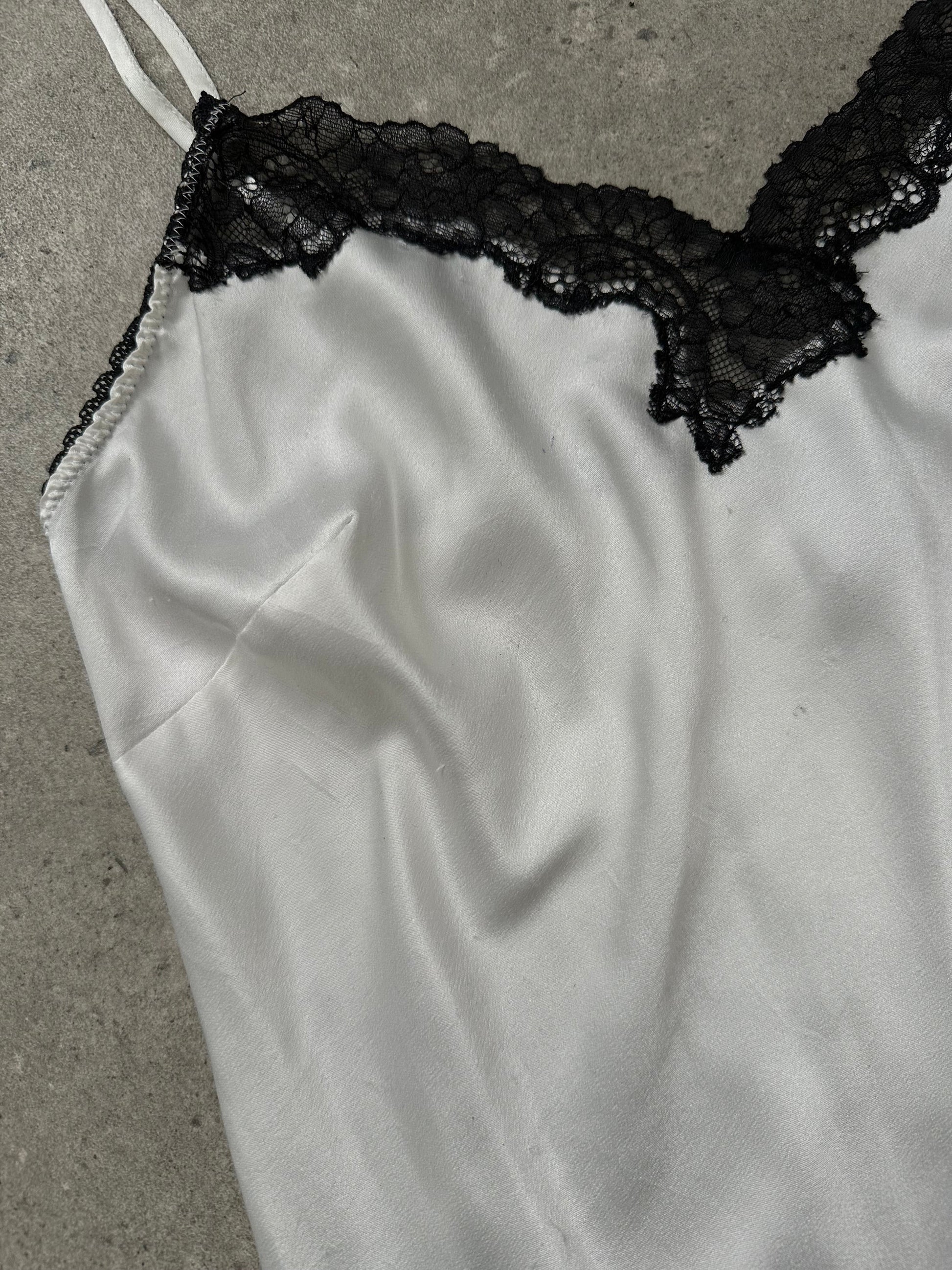 A softly draped satin slip dress by Victoria’s Secret, finished with delicate black lace trim along the neckline, hem, and side split. Designed with adjustable shoulder straps and a fluid silhouette, this piece reflects the minimal lingerie-inspired styling popular in the early 2000s.