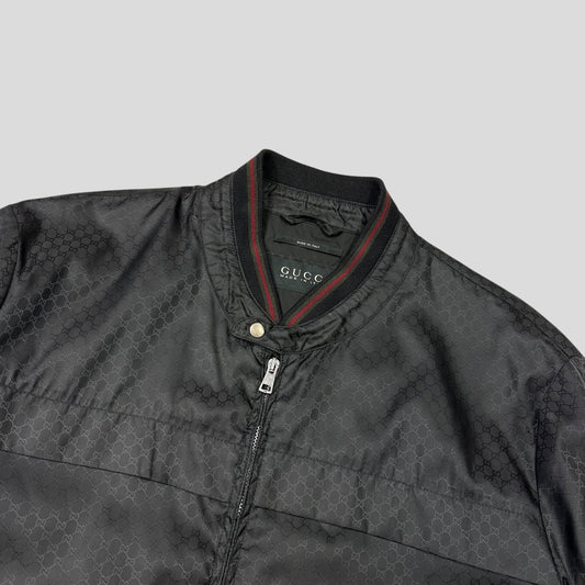 A grey woven bomber jacket from the 1990s featuring a high stand collar with button fastening and a structured cropped silhouette. The textured fabric is finished with subtle multicoloured speckling, giving depth and character while remaining easy to style.