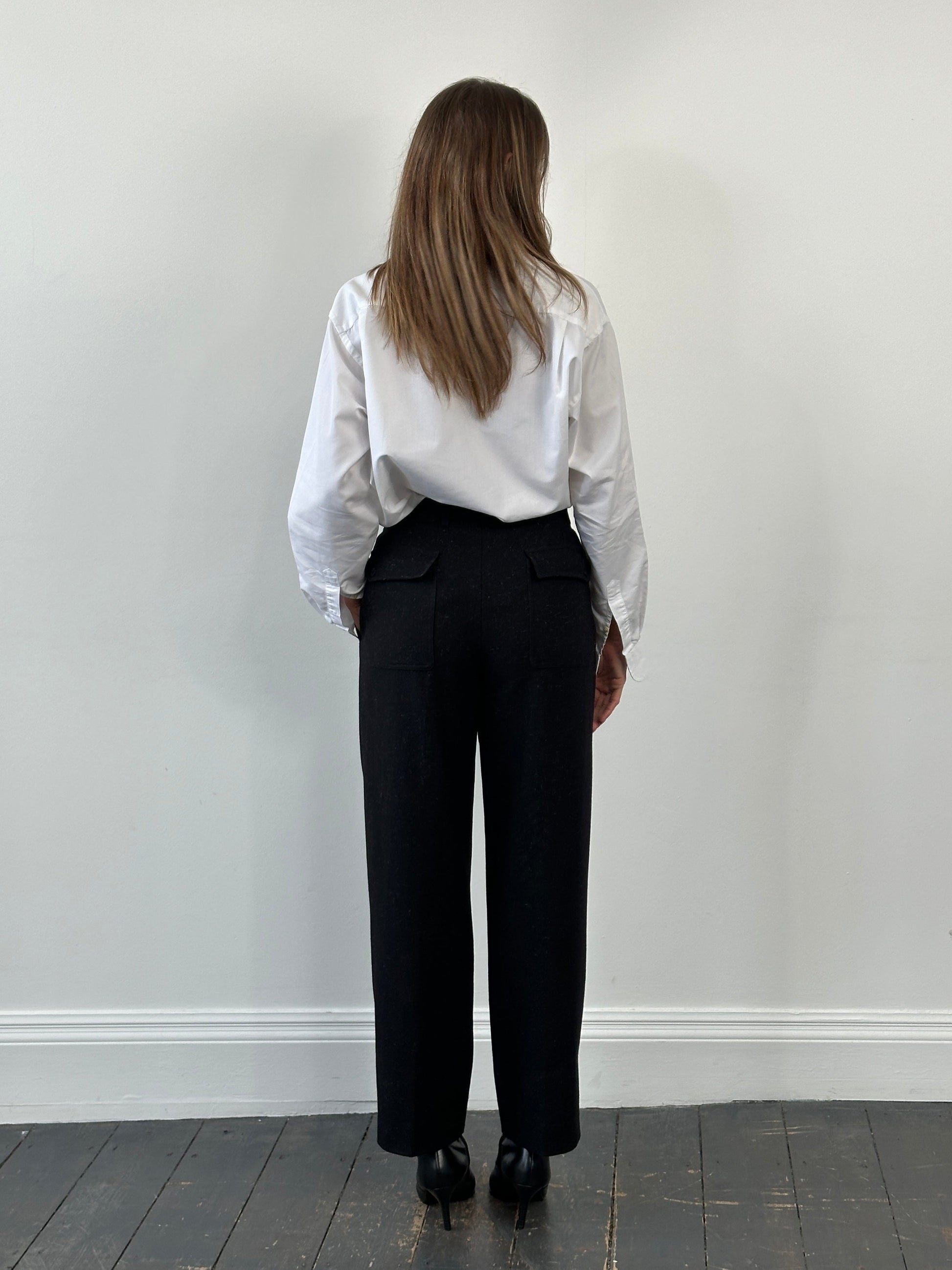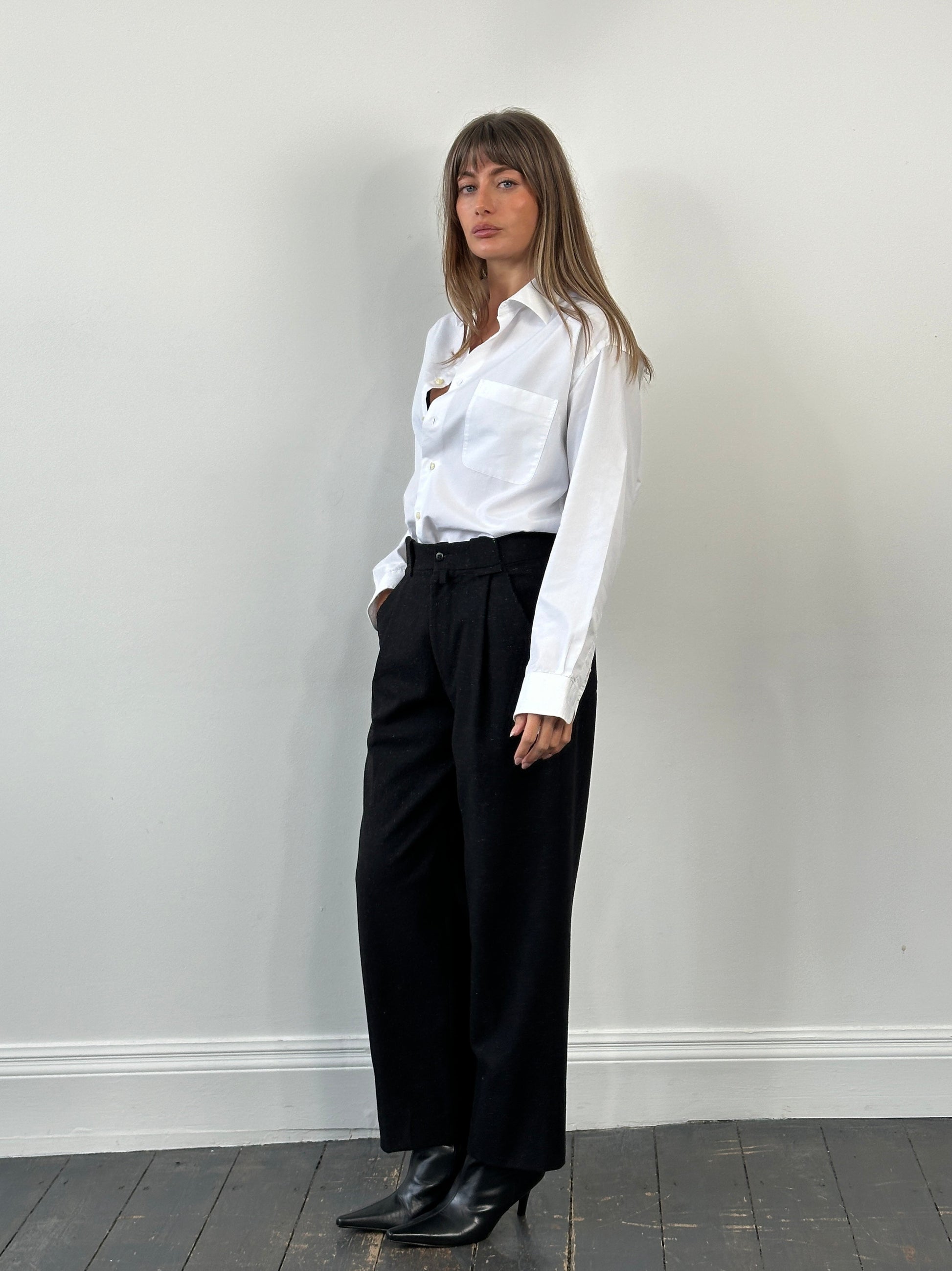 Vintage 1990s black tailored trousers featuring a subtle speckled wool finish, front pleats, and a softly structured straight leg silhouette. Designed with classic Italian tailoring in mind, with additional fabric at the hem allowing the leg length to be extended if desired.